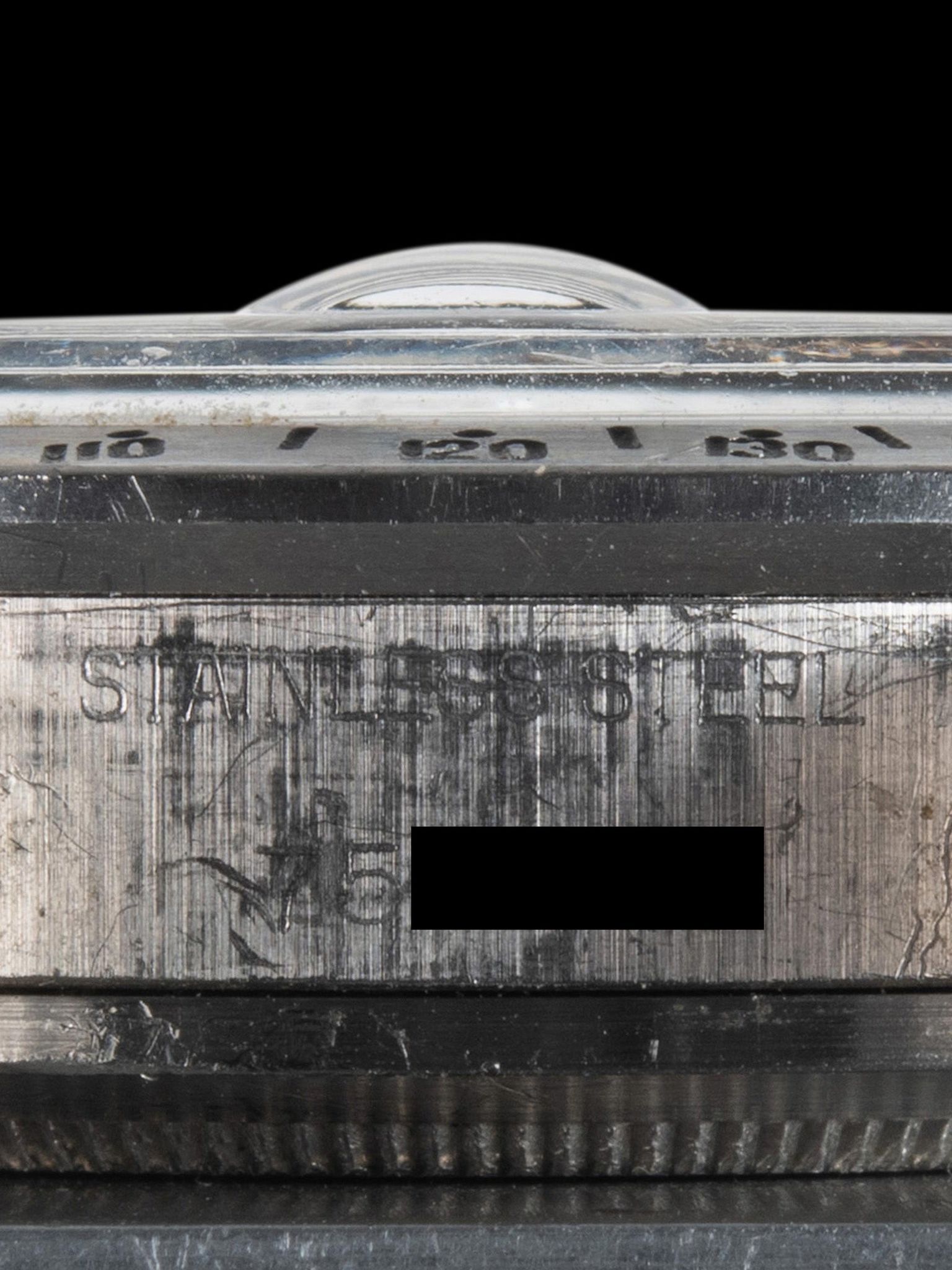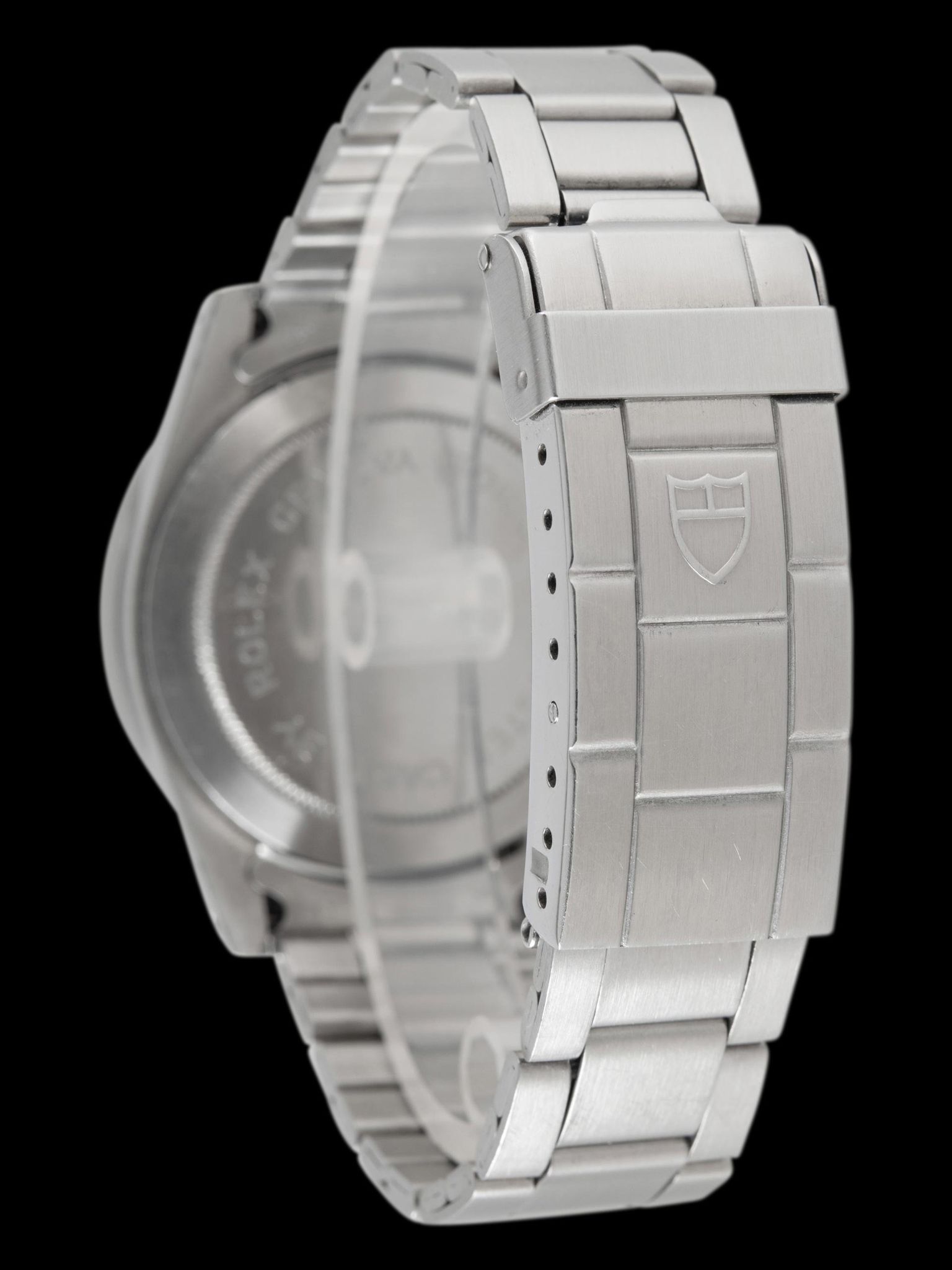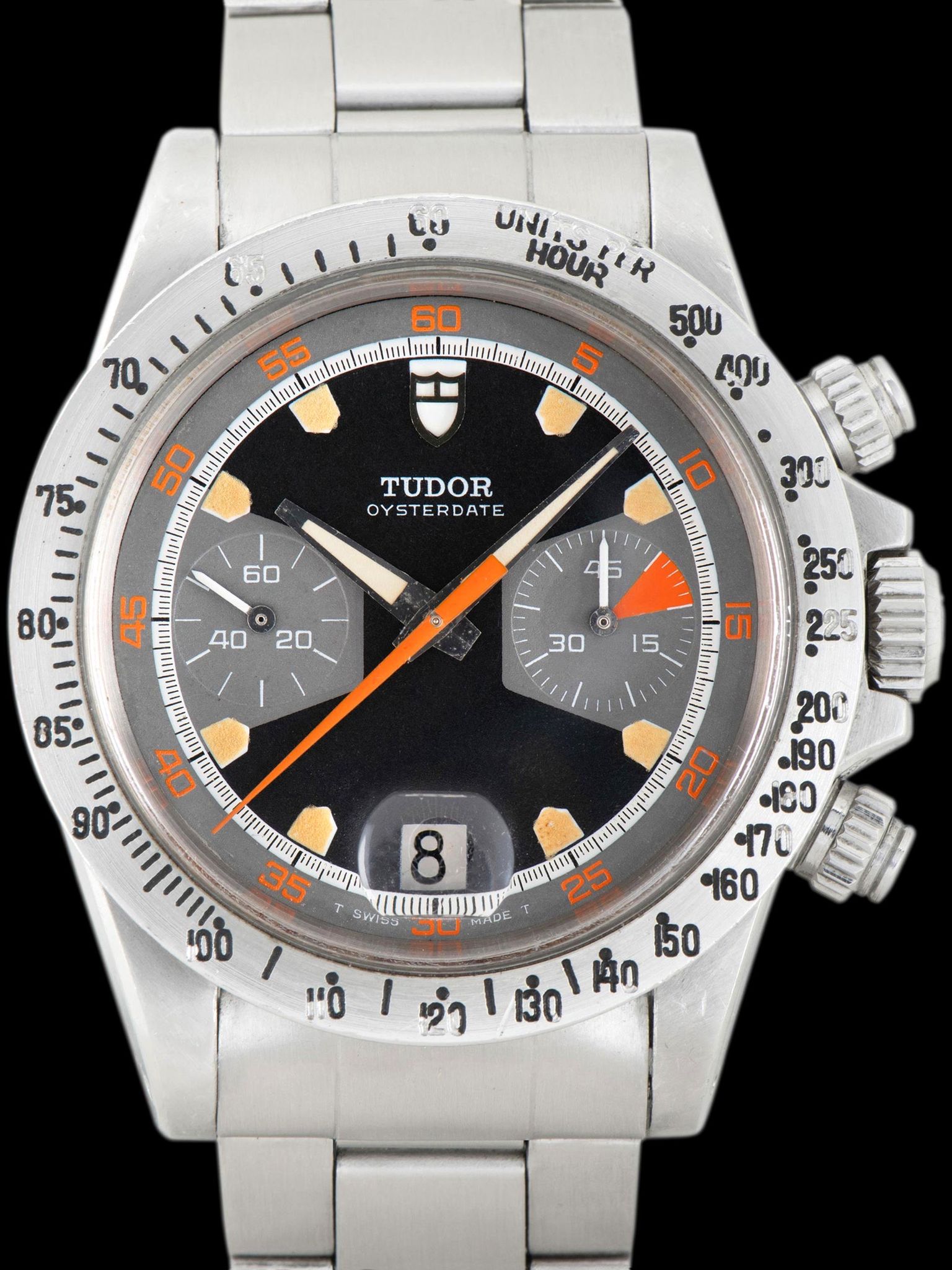 The exceptionally well-preserved and robust case maintains its original case finishing and chamfer details from the factory and is believed to remain in unpolished condition. The case shows honest signs of use throughout. The original fixed stainless steel "Units Per Hour" bezel shows gentle signs of use but is in excellent overall condition and retains most of its original black enamel. The screw-down pushers and Rolex-signed trip lock crown are later Rolex service units. The Rolex 9315 folded-link Oyster bracelet with 380 end pieces was sourced on the watch and features a replacement Tudor outer clasp. The bracelet retains 12 links that show almost no stretch and will fit up to a 7 3/4-inch wrist.
