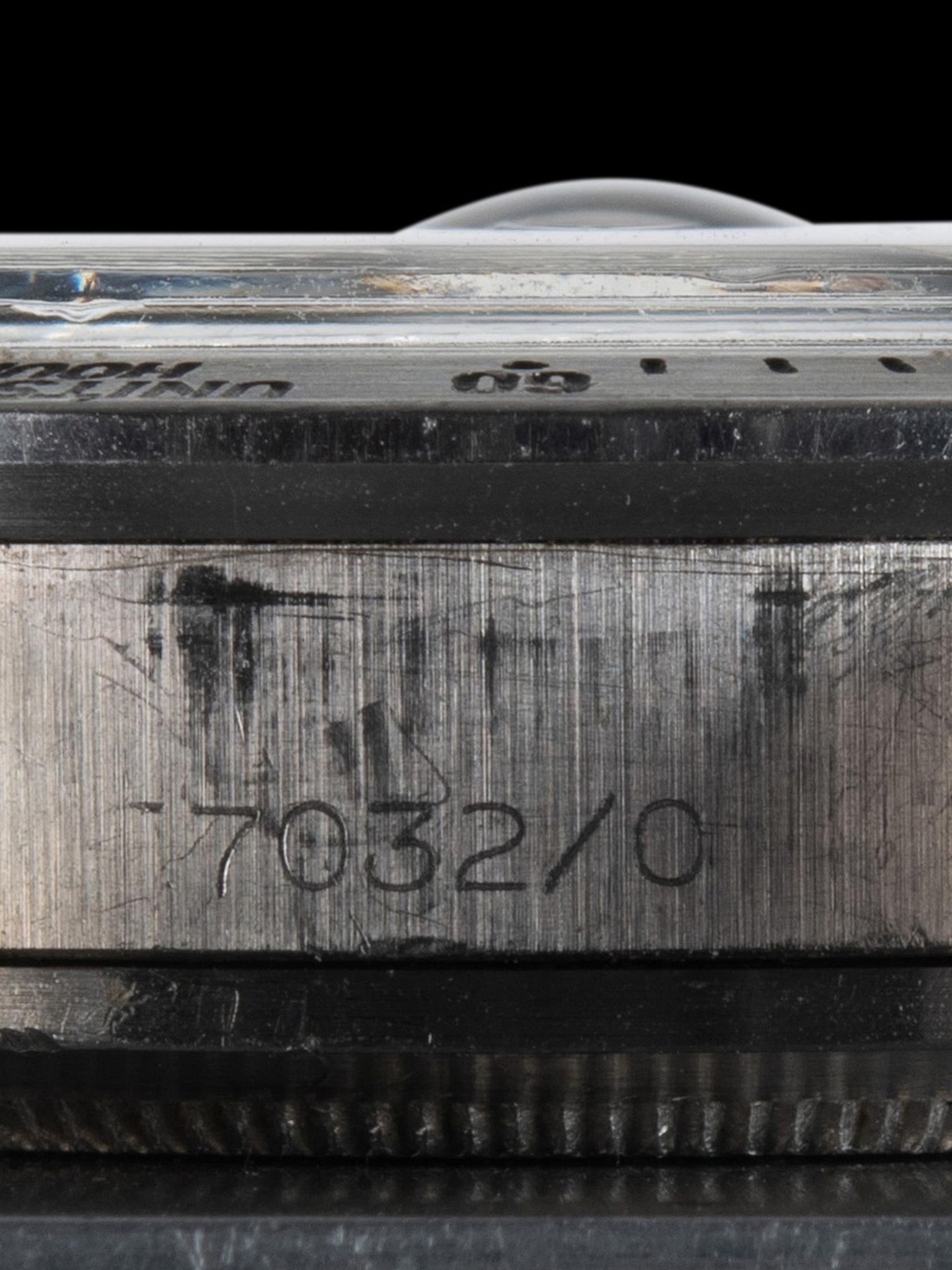 The matte black, grey, and orange "Home Plate dial is truly impressive and in near-perfect condition, showing no damage with no notable age. The grey sub-dials are clean, free from any damage or wear. The tritium "Home Plate" markers have taken on a beautiful golden-yellow color and exhibit no degradation when inspected under UV light. The original tritium hands also feature a creamy patina, but have aged a shade lighter than the dial which is expected in this reference.