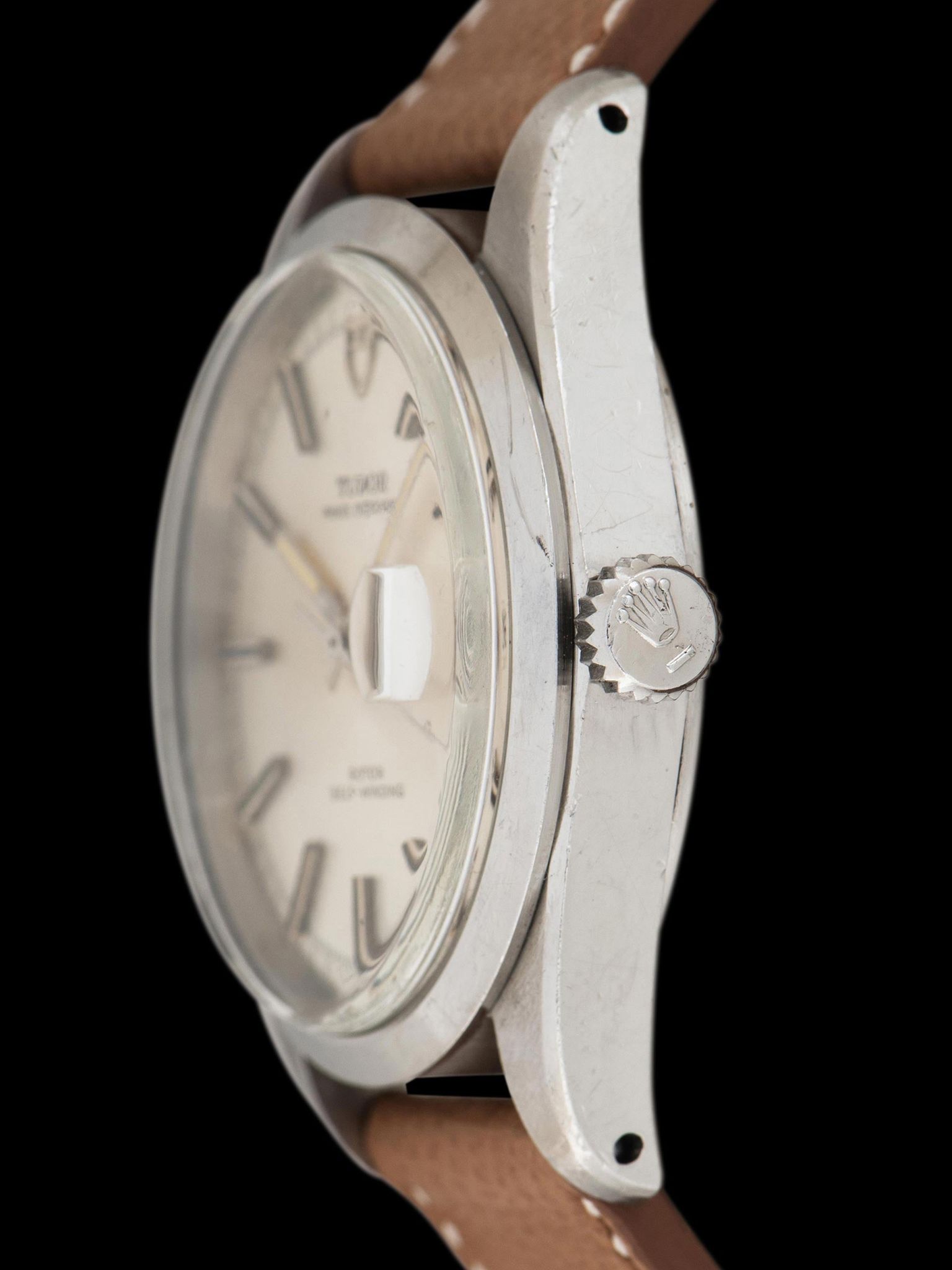 The large and robust case remains in unpolished condition, boasting crisp and broad chamfers on each of the lugs. The case does show honest signs of use and wear throughout. The smooth stainless steel bezel is also unpolished with honest wear present. The case retains its original Rolex-signed twin-lock crown. The case back retains all of its original factory markings in crisp condition. The watch comes supplied on a 2pc handmade leather strap.
