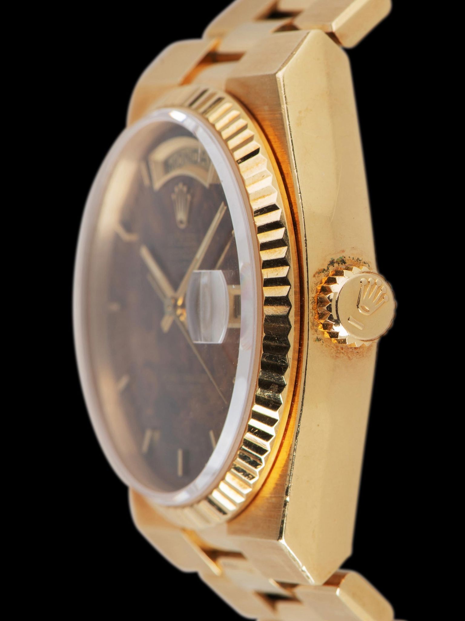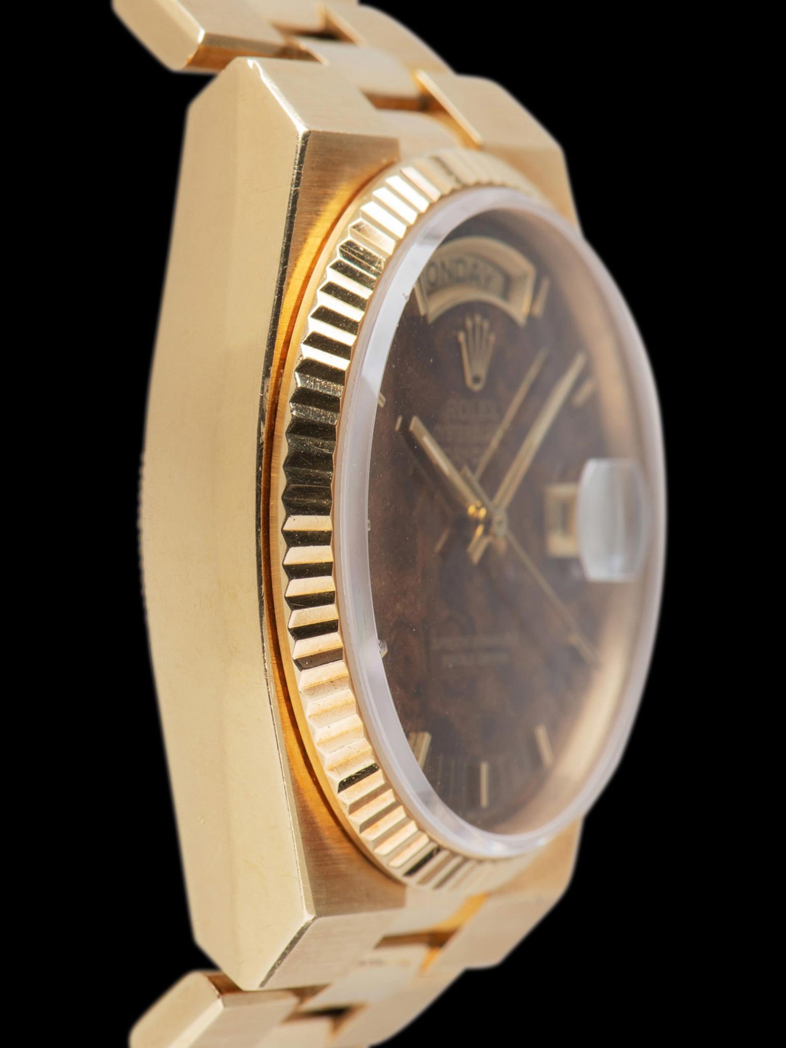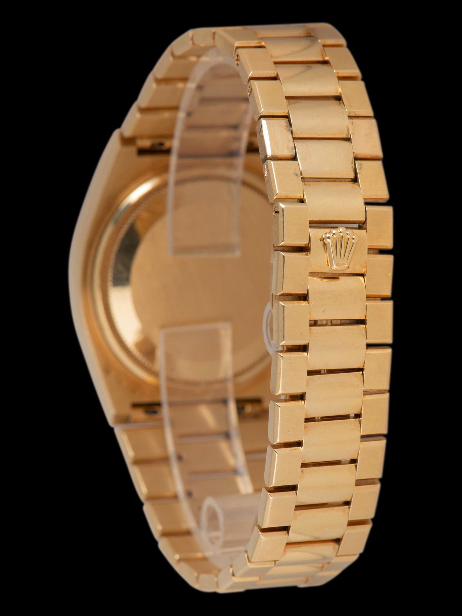 The exceptional 18K yellow gold case remains unpolished, boasting all of its original factory chamfers while maintaining the deep texture of the factory brushing of the case. The case does exhibit a subtle rosy patina from never being polished as well and shows gentle signs of use throughout. The 18K yellow gold fluted bezel is in crisp unpolished condition as well. The case back remains crisp with gentle signs of use and the reference and serial engravings remain in excellent condition as do the hallmarks as well. The original 18K Rolex Oysterquartz President-style bracelet retains 26 links that show only subtle stretch and will fit up to a 7 3/4 inch wrist.