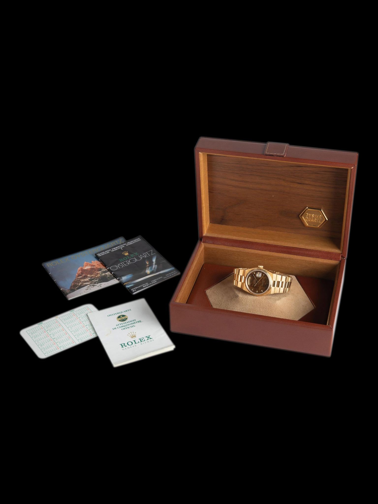 *Unpolished* 1979 Rolex Oysterquartz Day-Date 18K YG (Ref. 19018) Burlwood Dial W/ Box & Papers