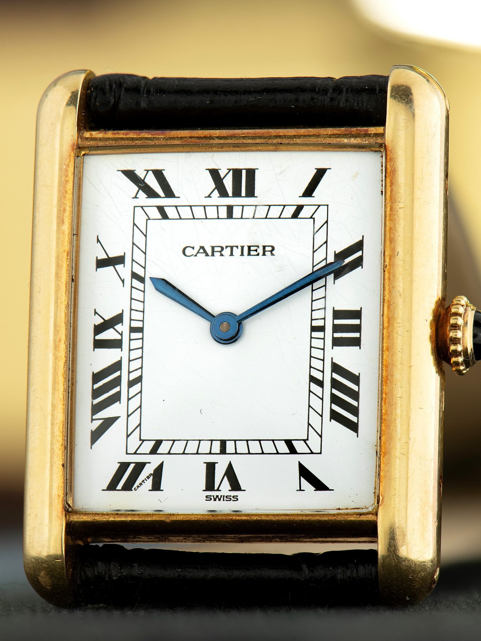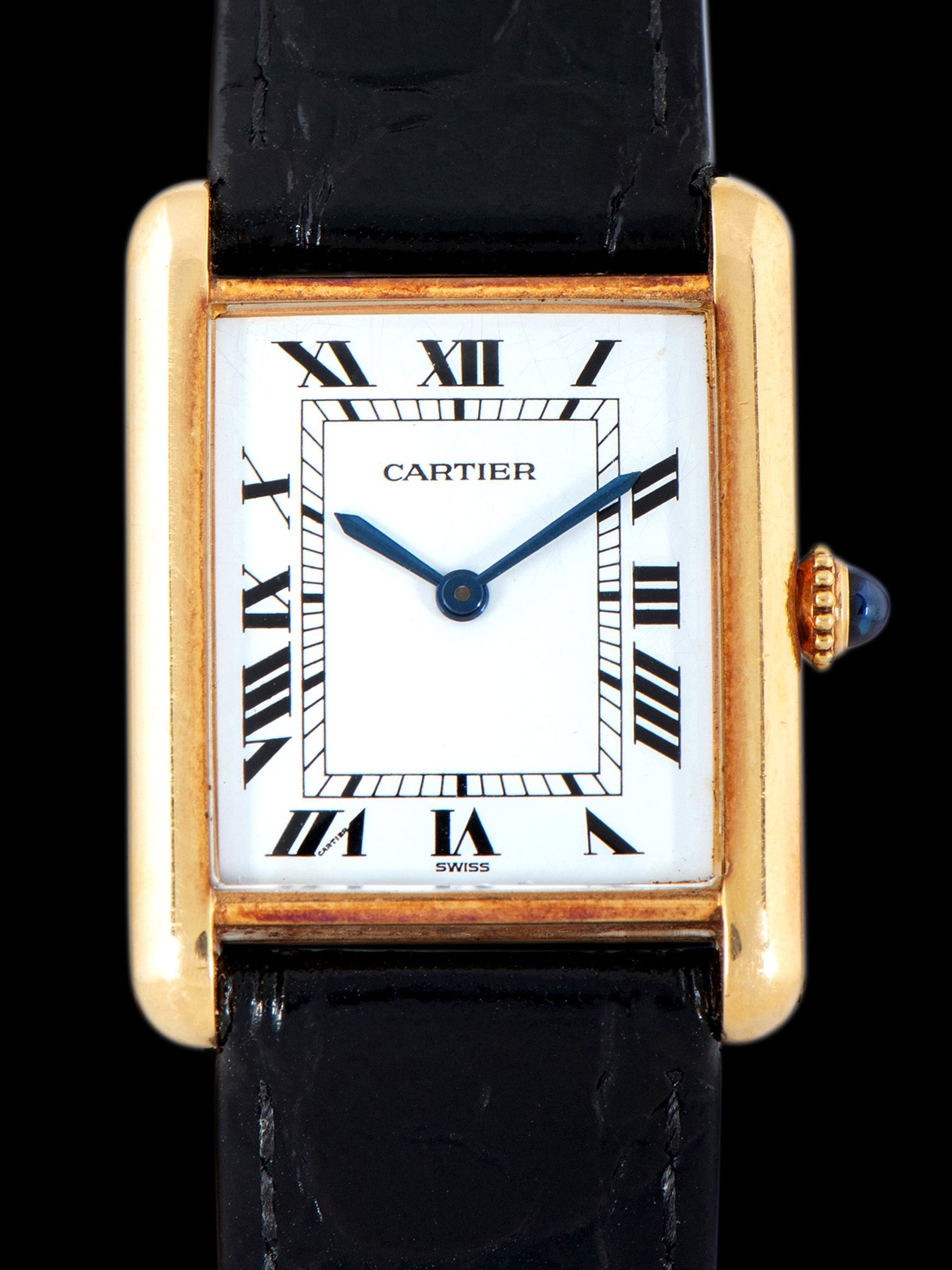 The original "Swiss" signed white Roman numeral dial features the hidden Cartier signature within the 7 o'clock numeral and is in very attractive and presentable vintage condition, with the only element of age being extremely subtle hairline surface spidering that is only visible in direct light. The blued hands are in excellent condition.