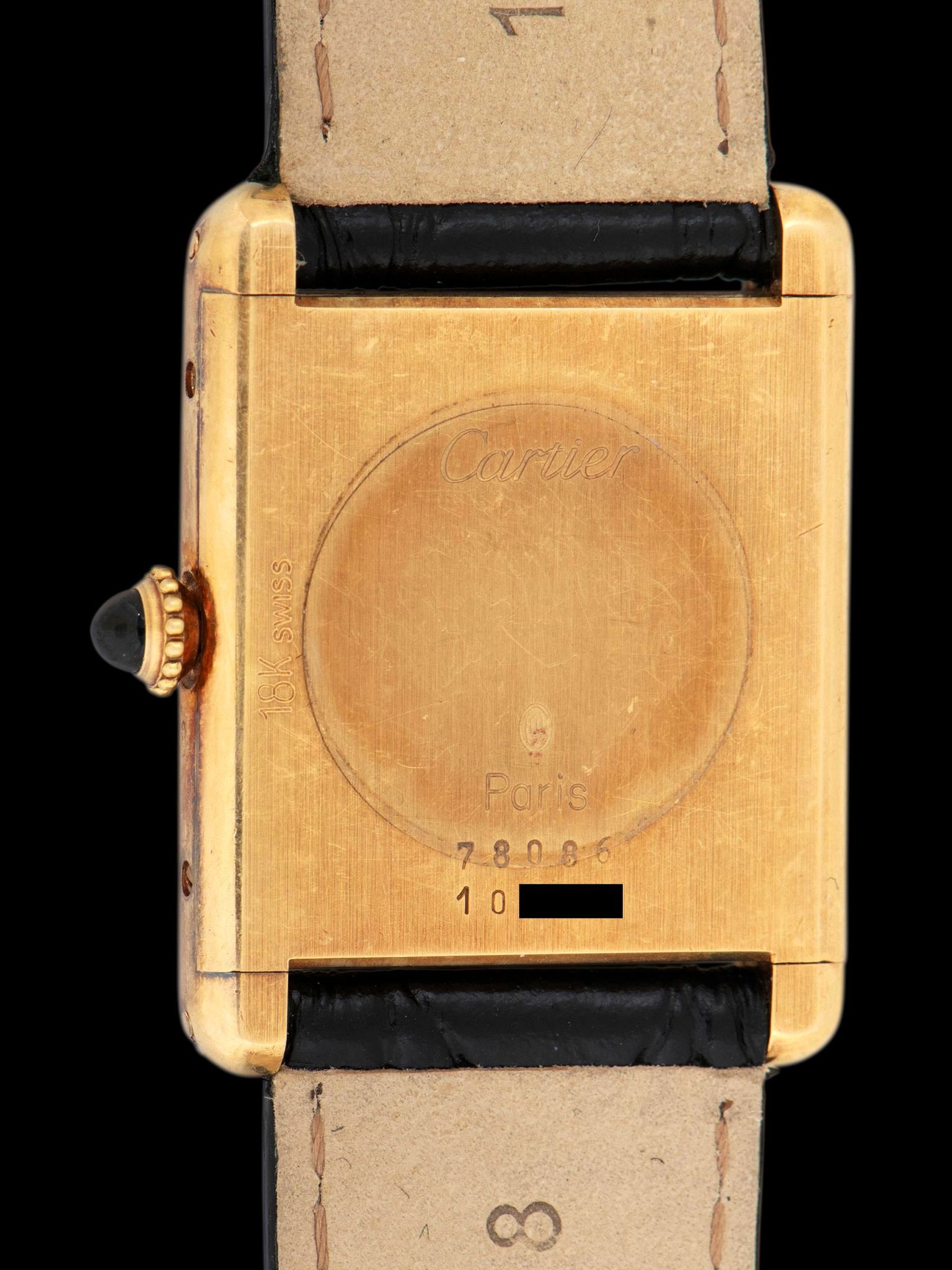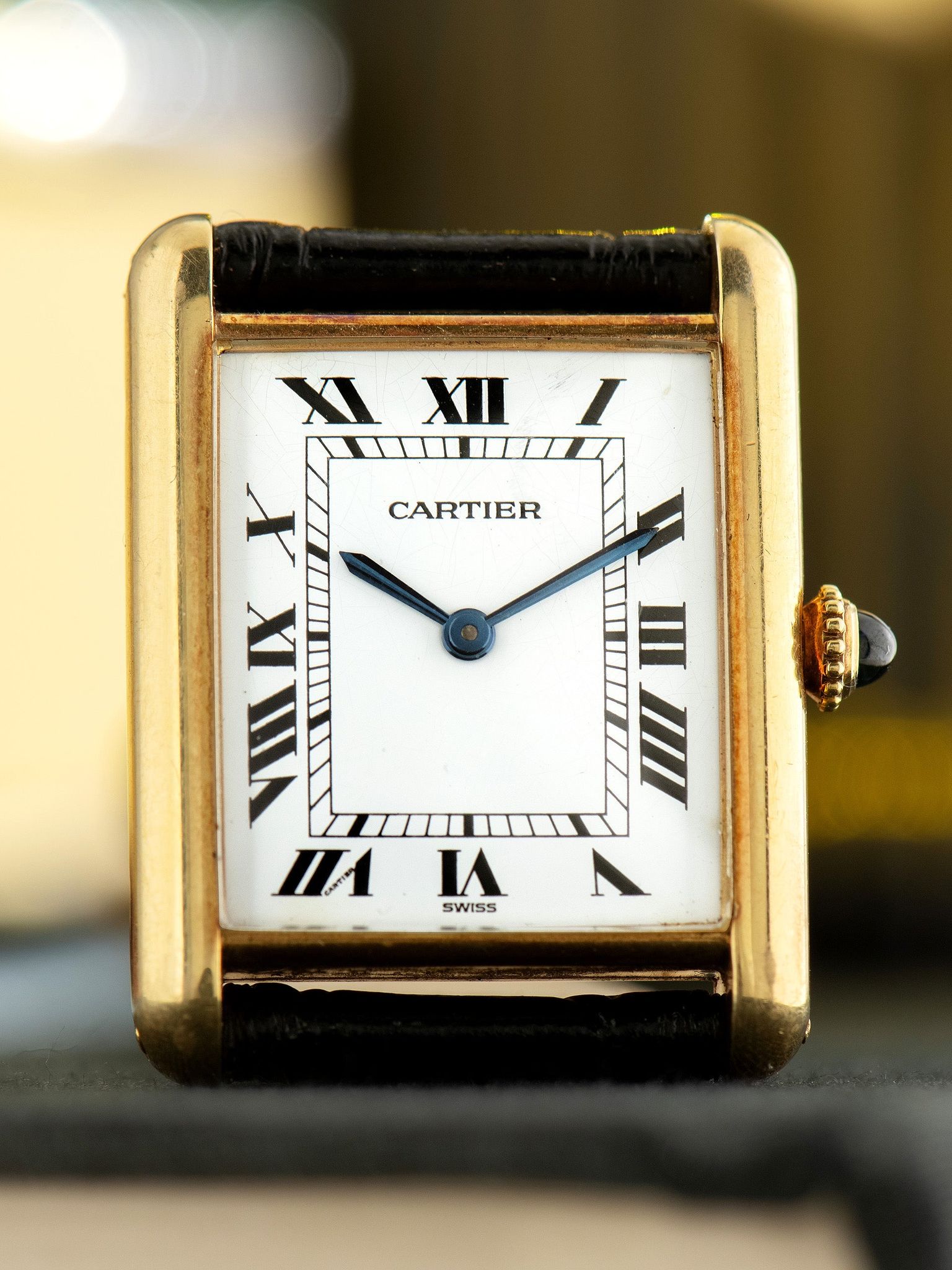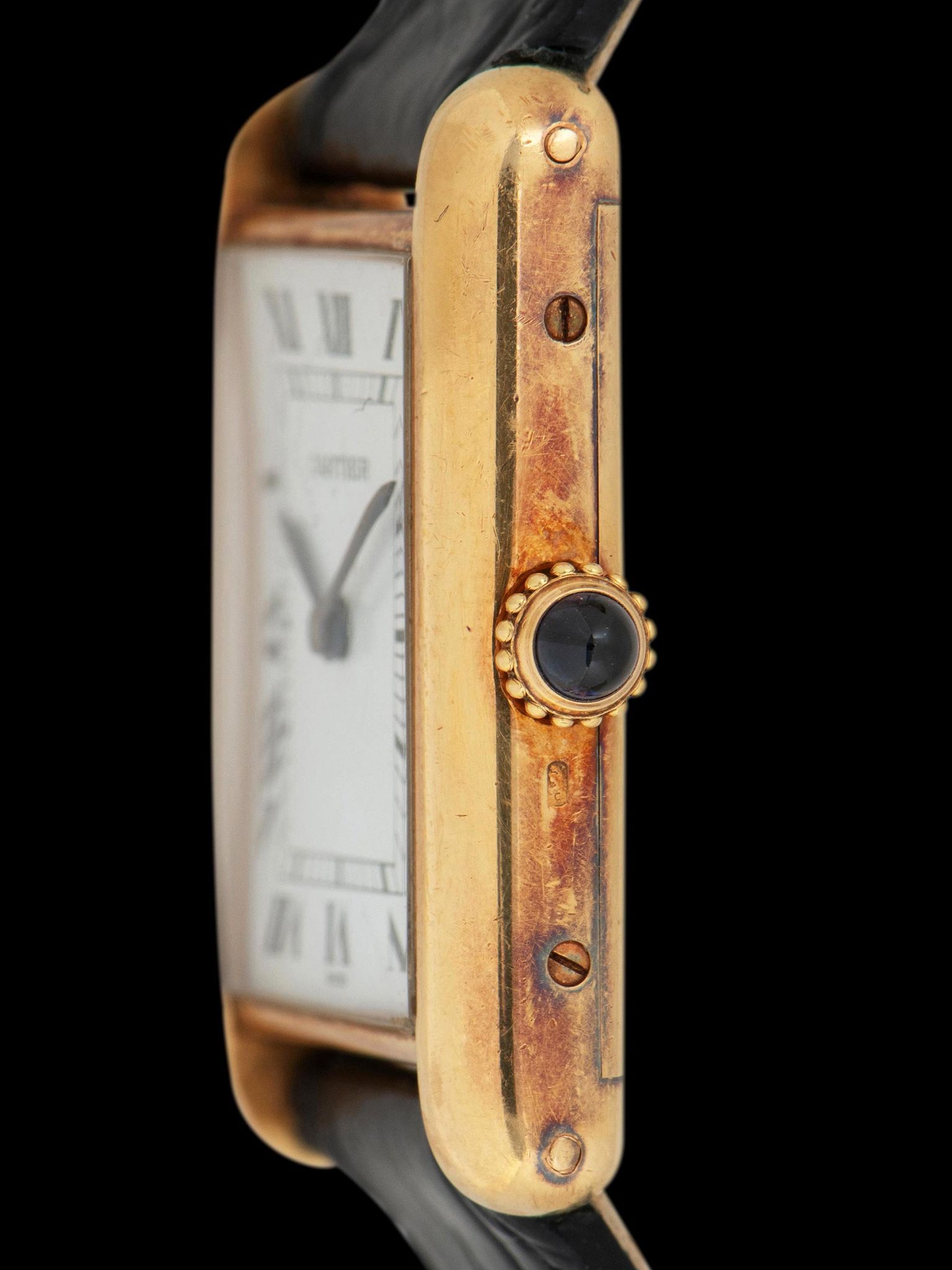 The classic 18K yellow gold case remains in exceptional and unpolished condition with the factory finishing and hallmarks remaining fully present and crisp throughout. The case has developed a rosy patina throughout and exhibits honest signs of gentle use. The watch retains its original blue sapphire cabochon crown. The original domed mineral glass crystal features gentle wear. The watch comes supplied on a 2pc handmade leather strap with an original 18K YG Cartier tang buckle.