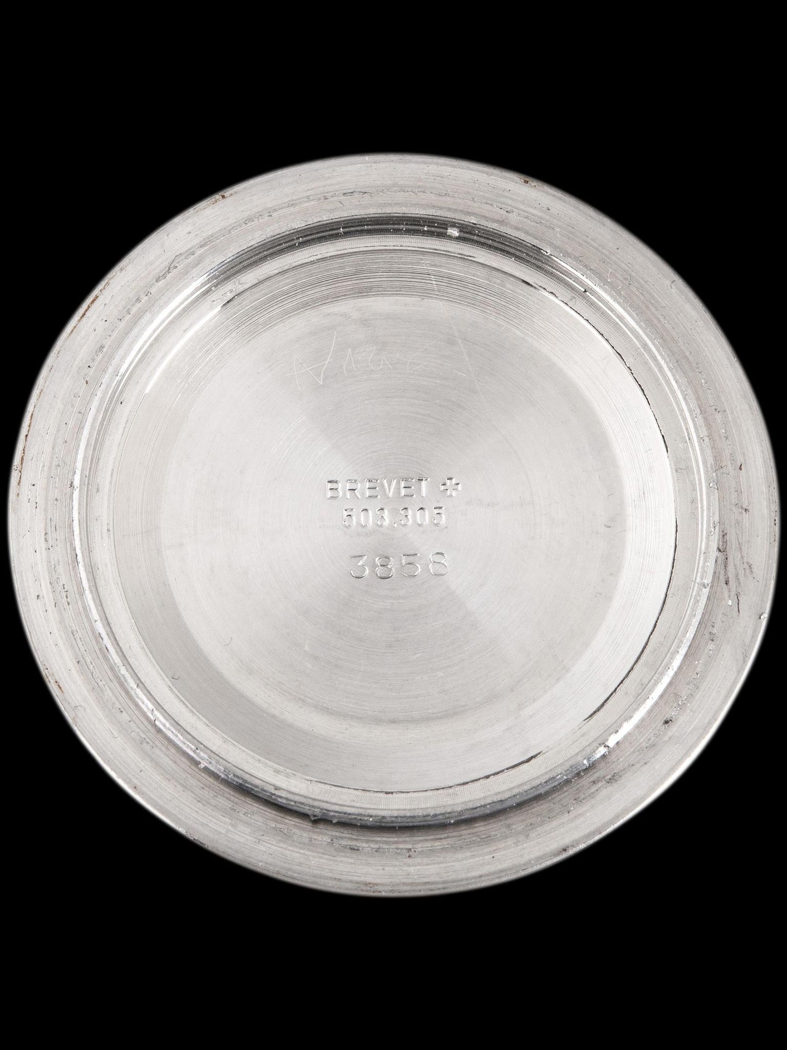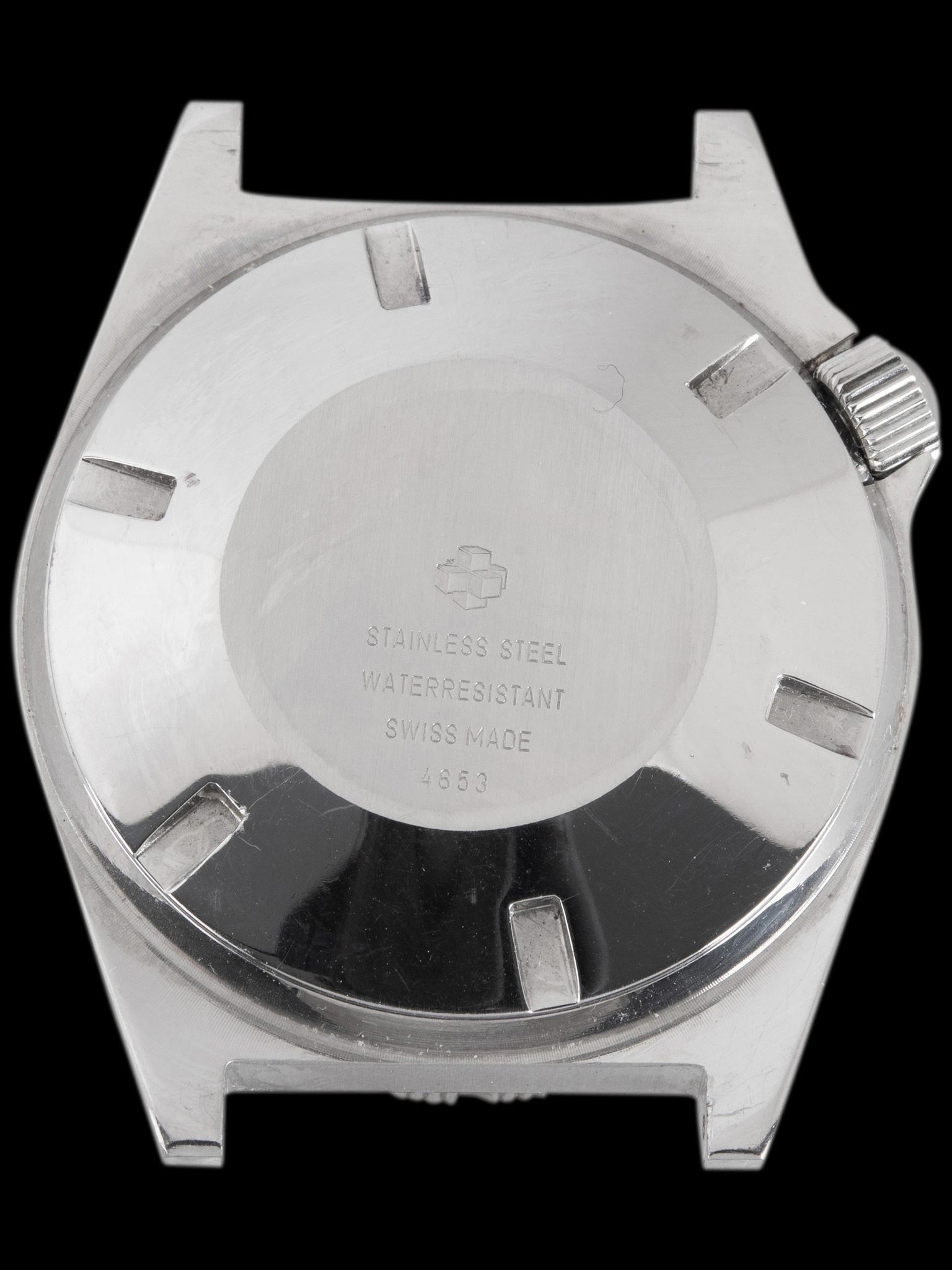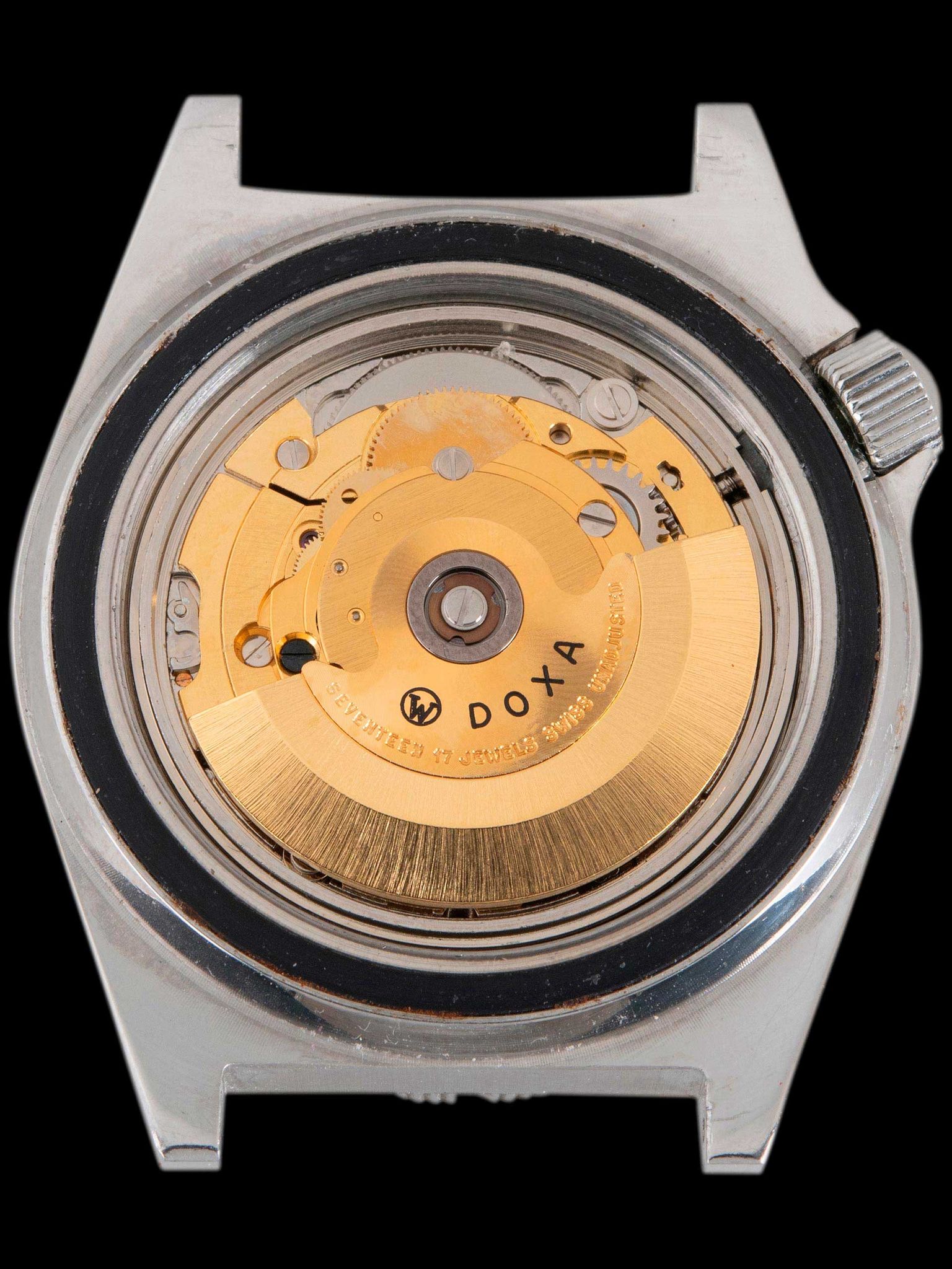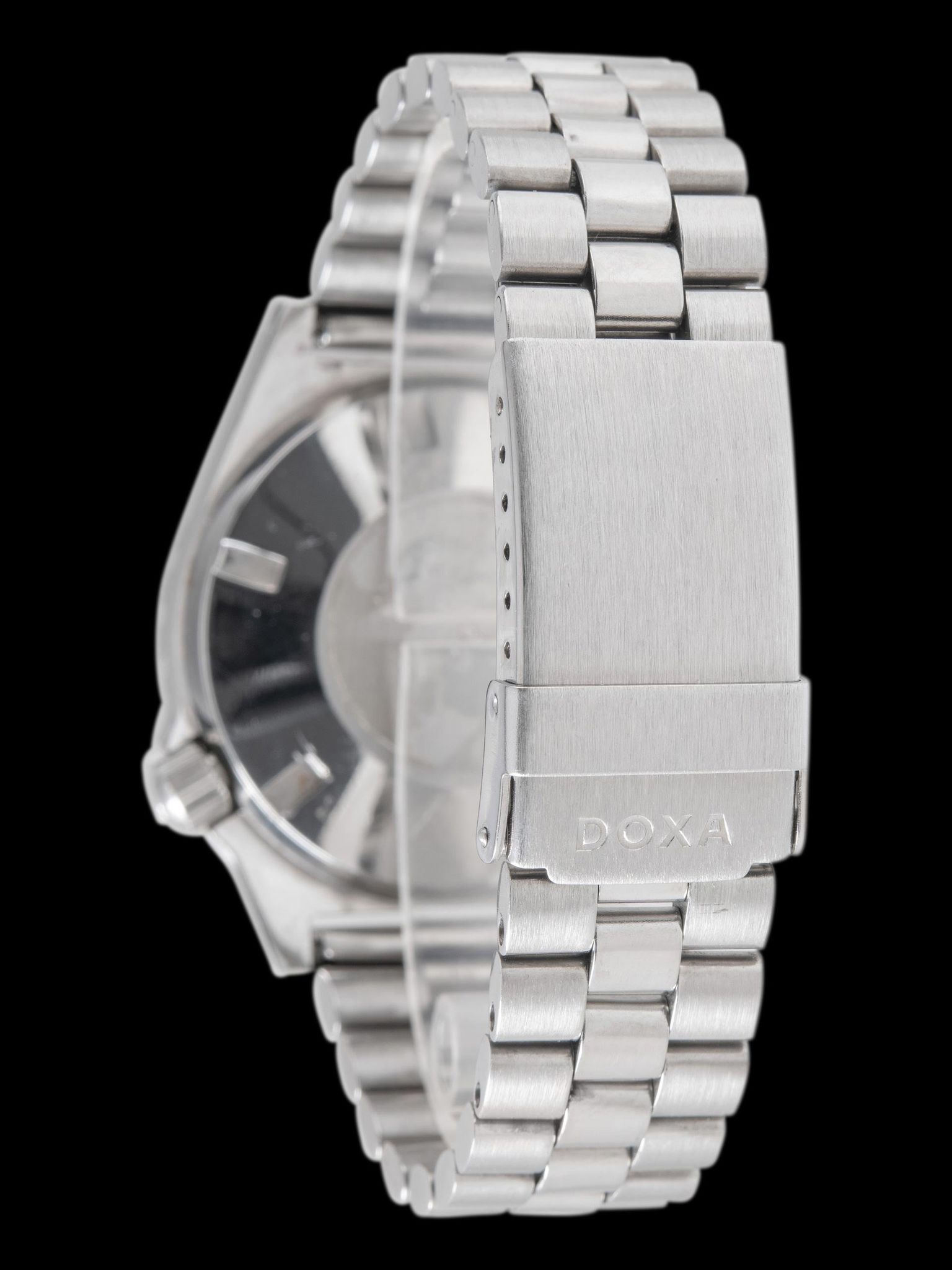 The remarkably impressive and well-preserved case remains in its original unpolished condition, showcasing crisp finishing throughout with only gentle signs of previous use. The geometric design is flush with hard angles and contrasting surface finishes that give the watch an architectural appearance. The original "saw blade" bezel is uni-directional and is in flawless condition, showing no visible signs of use with the tritium-lumed triangle fully intact and matching the dial. The case retains its original screw-down crown located at the 4 o'clock position. The case back is unpolished as well with almost no evidence of previous use present. The original stainless steel Doxa flip-lock clasp bracelet doesn't show stretch, however, the bracelet features some movement which was part of the original design. The bracelet will fit up to a 7 1/4-inch wrist.