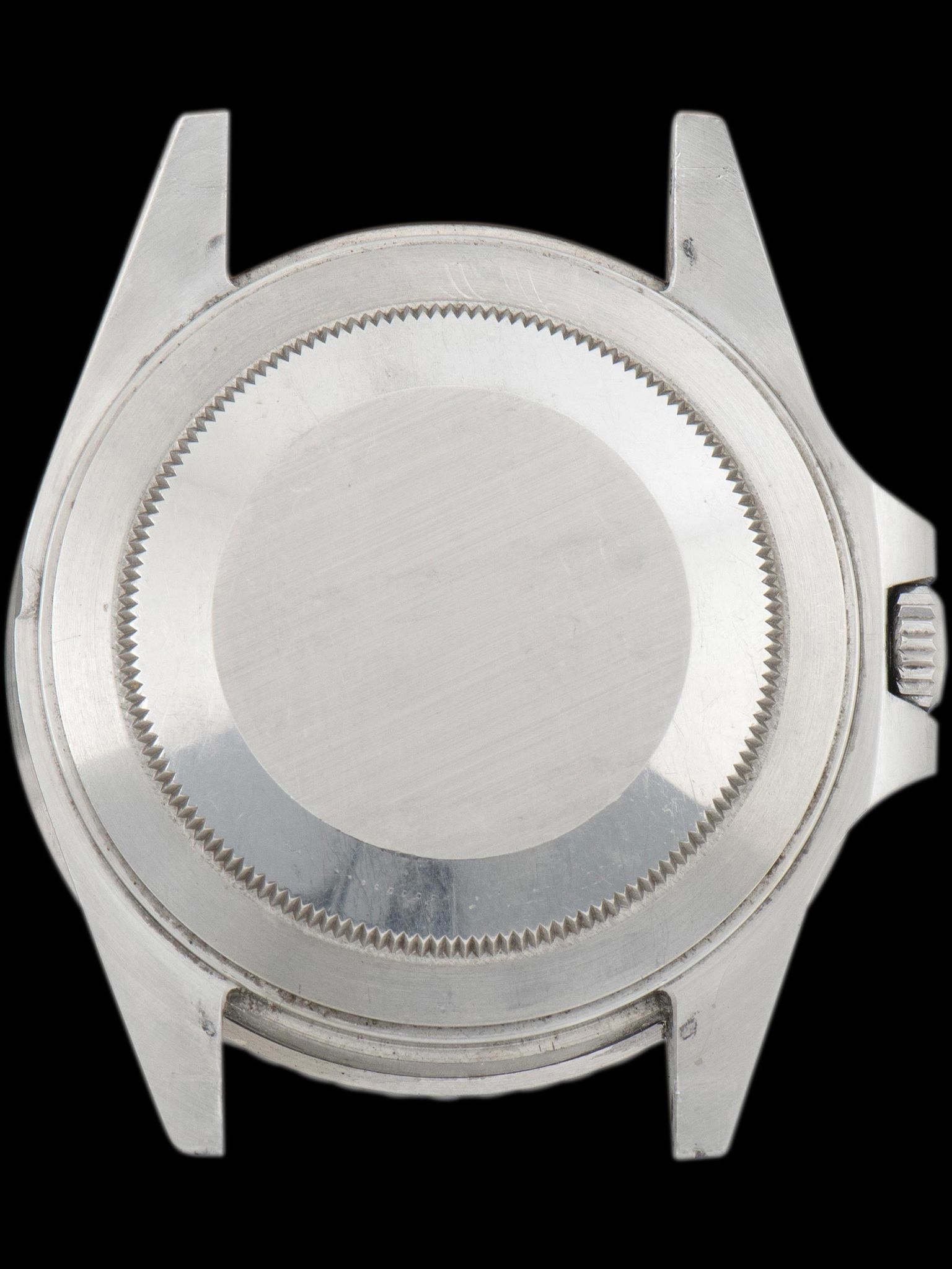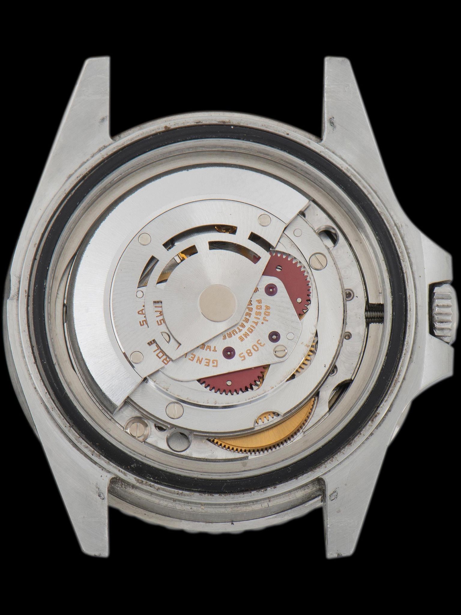 The original and virtually flawless black dial with white gold surround markers features an extremely even and sutble semi-gloss texture that is common for dials in this era. The tritium lume plots have achieved a vibrant creamy yellow patina with no degradation present under UV light inspection. The original tritium hands match have aged a shade light than the dial and aesthetic of the watch overall, under UV light inspection the hands exhibit no degradation as well. The white date wheel is original with "open" 6's and 9's.