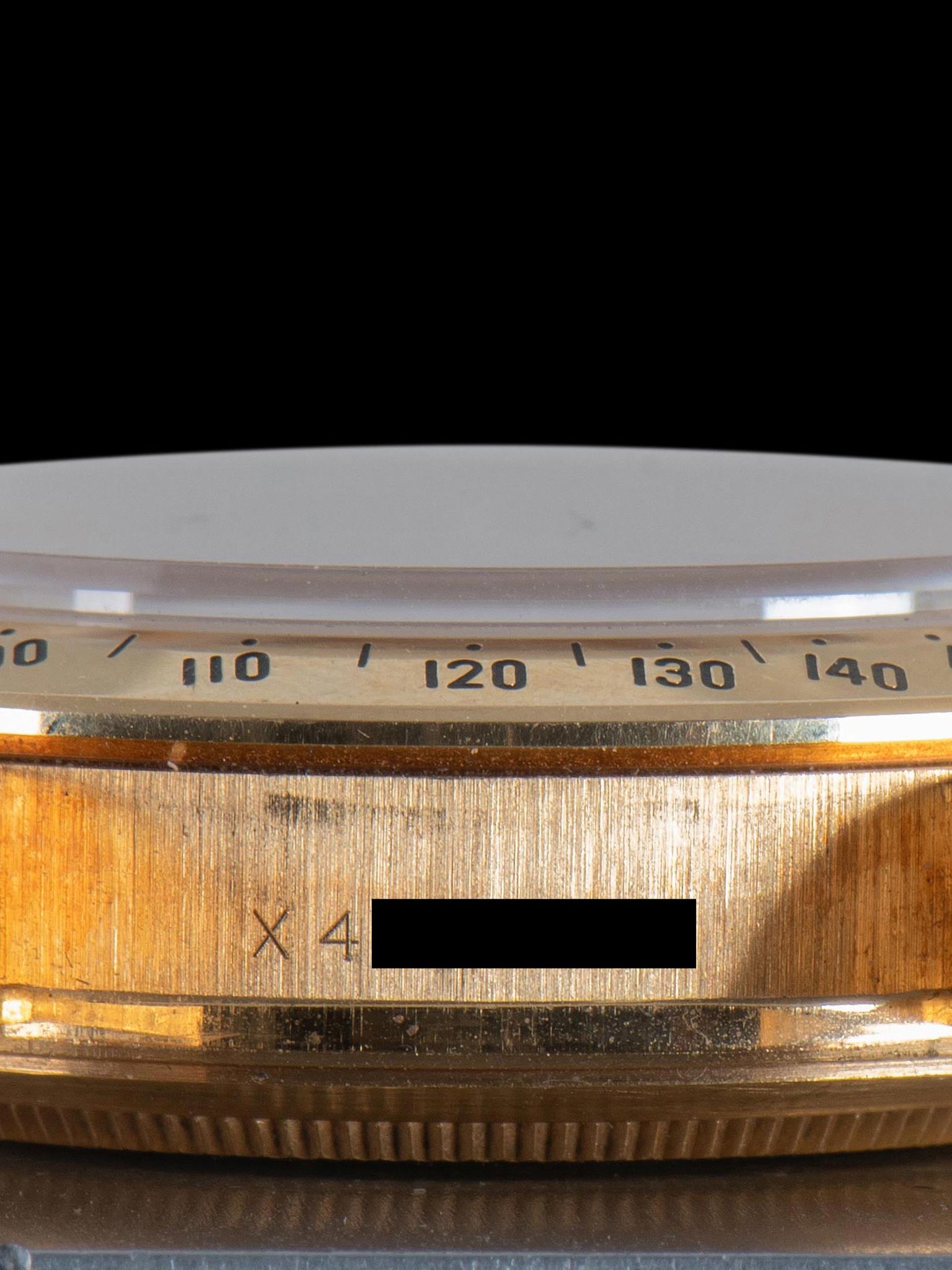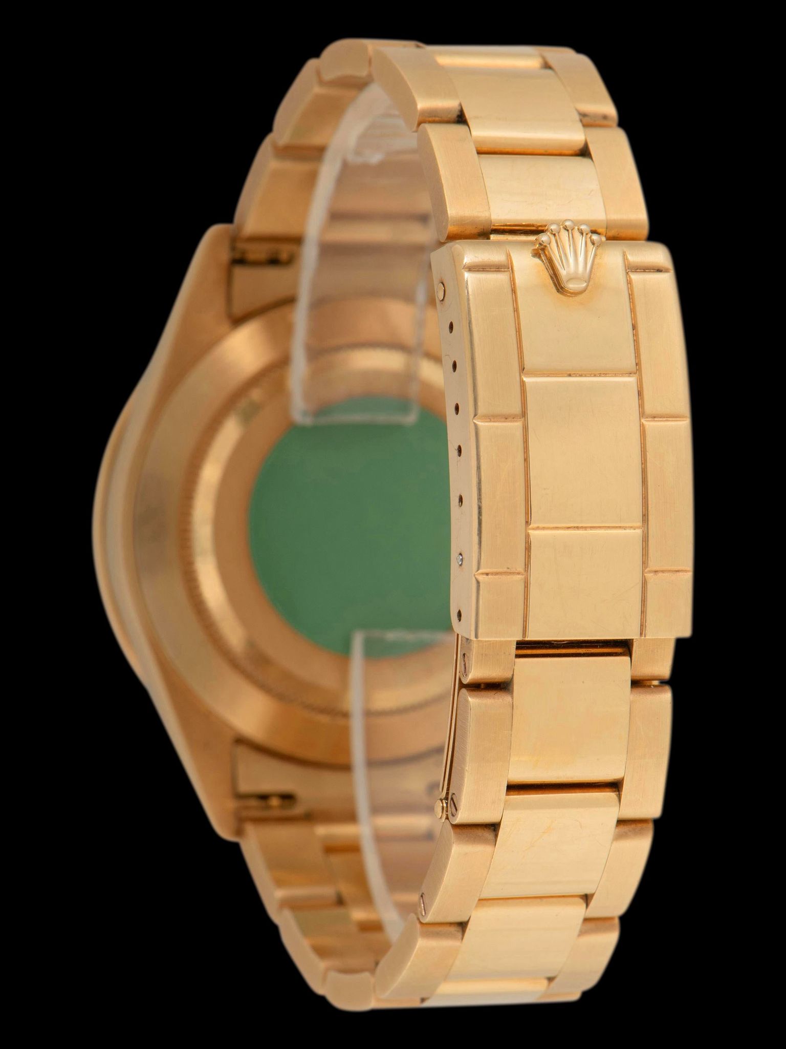 The impressive and unpolished 18K yellow gold case retains crisp edges and sharp finishing throughout, showing honest signs of gentle use with no notable wear spots or dents. The 18K yellow gold "Units Per Hour" bezel is also in extremely crisp condition, retaining all of the factory black enamel with minimal signs of use present. The case back retains its factory green Rolex sticker. The original 18K yellow gold Rolex 78668 Oyster bracelet with solid 103 end pieces retains 12 links that show virtually no stretch and will fit up to a 7.25-inch wrist.