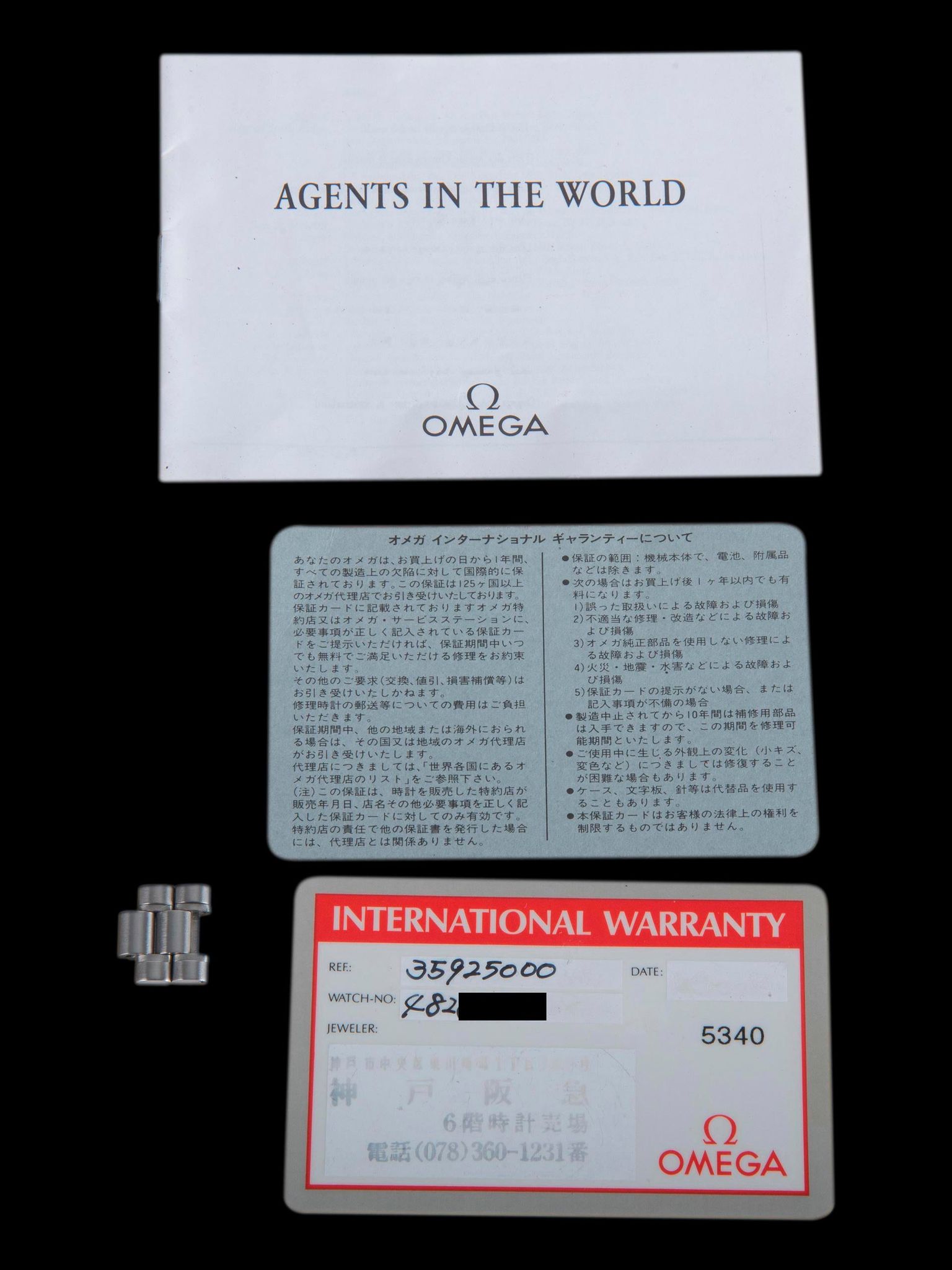 The watch comes with its original warranty card from Omega and 2 extra bracelet links. The watch is keeping time perfectly, previous service history is unknown.