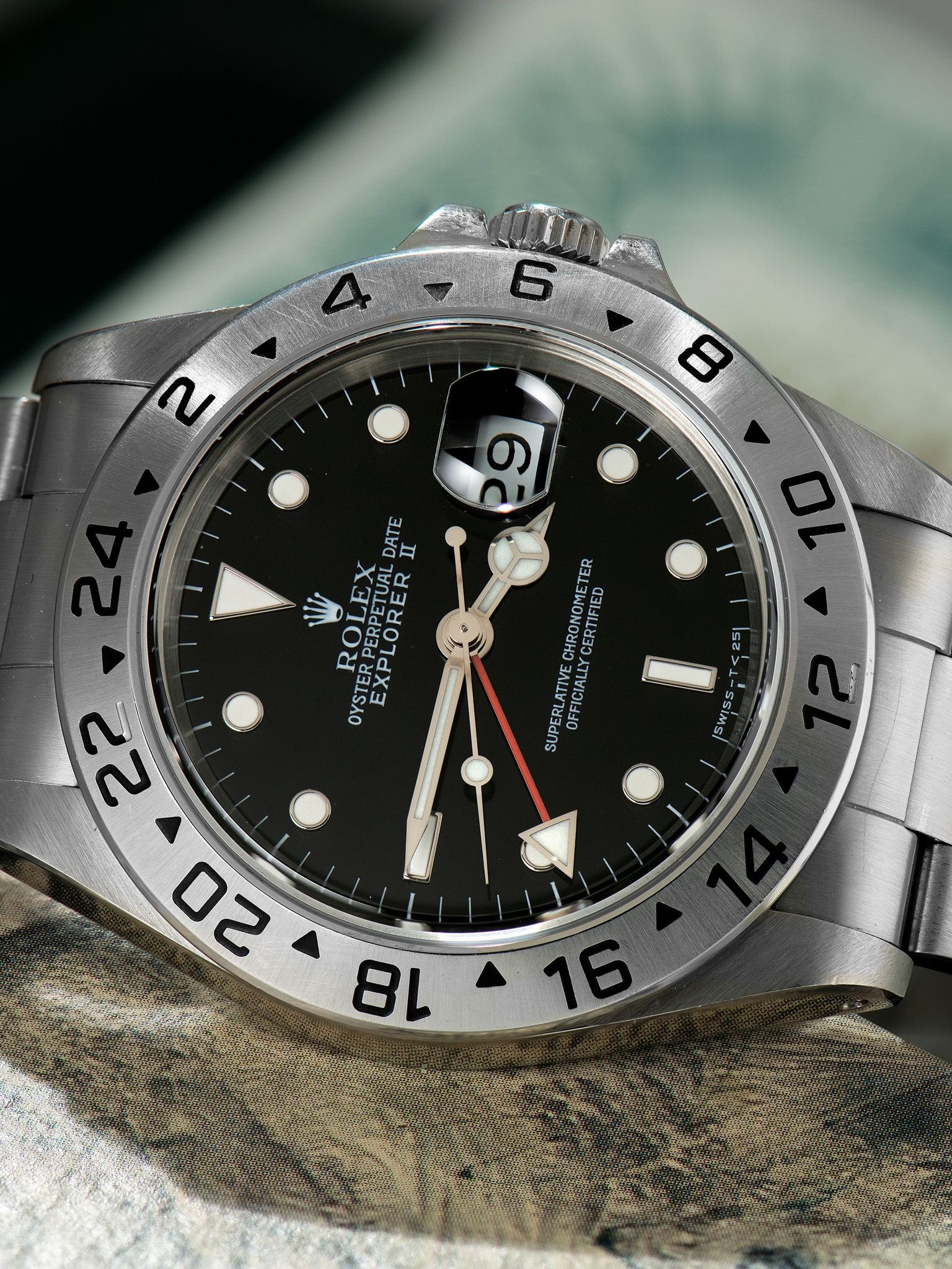 The Rolex Explorer II ref. 16570 was introduced in 1989, directly succeeding the transitional ref. 16550 with some subtle cosmetic and internal upgrades. The Rolex Explorer II ref. 16570 employs the updated and robust cal. 3185 jumping hour movement and the bezel font was slightly modified from the previous reference.