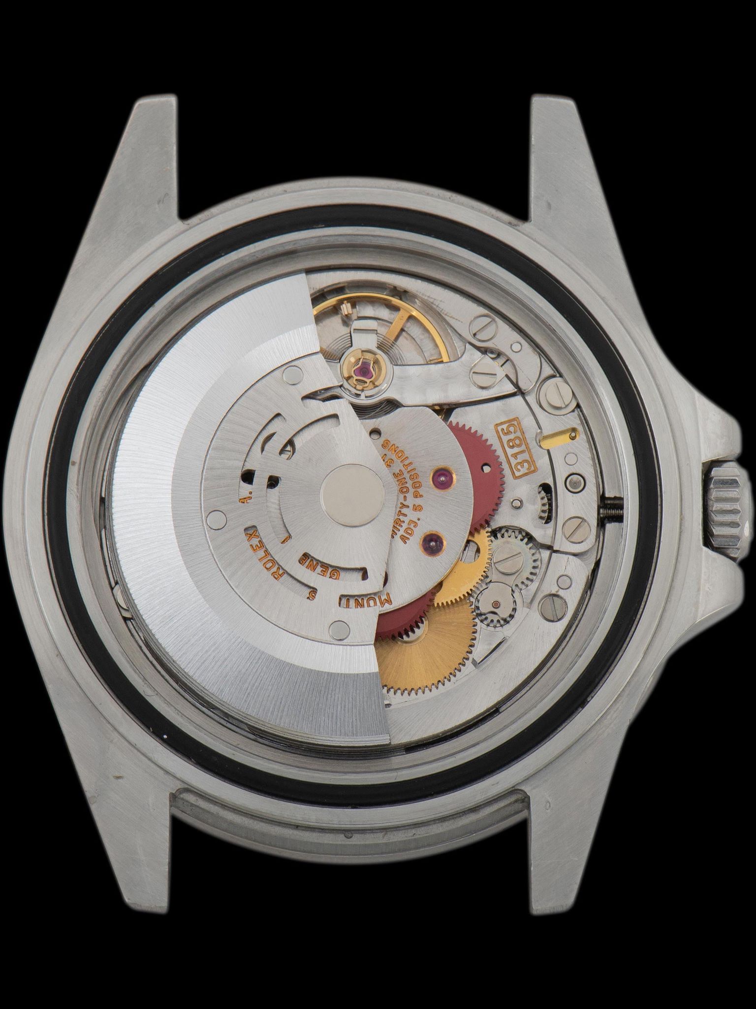 The original glossy black dial with white gold surround markers is in flawless condition, with no age or damage present. The tritium lume plots remain bright, with a subtle ivory coloration, and exhibit no degradation when inspected under UV light. The hands are OEM Rolex luminova service units.