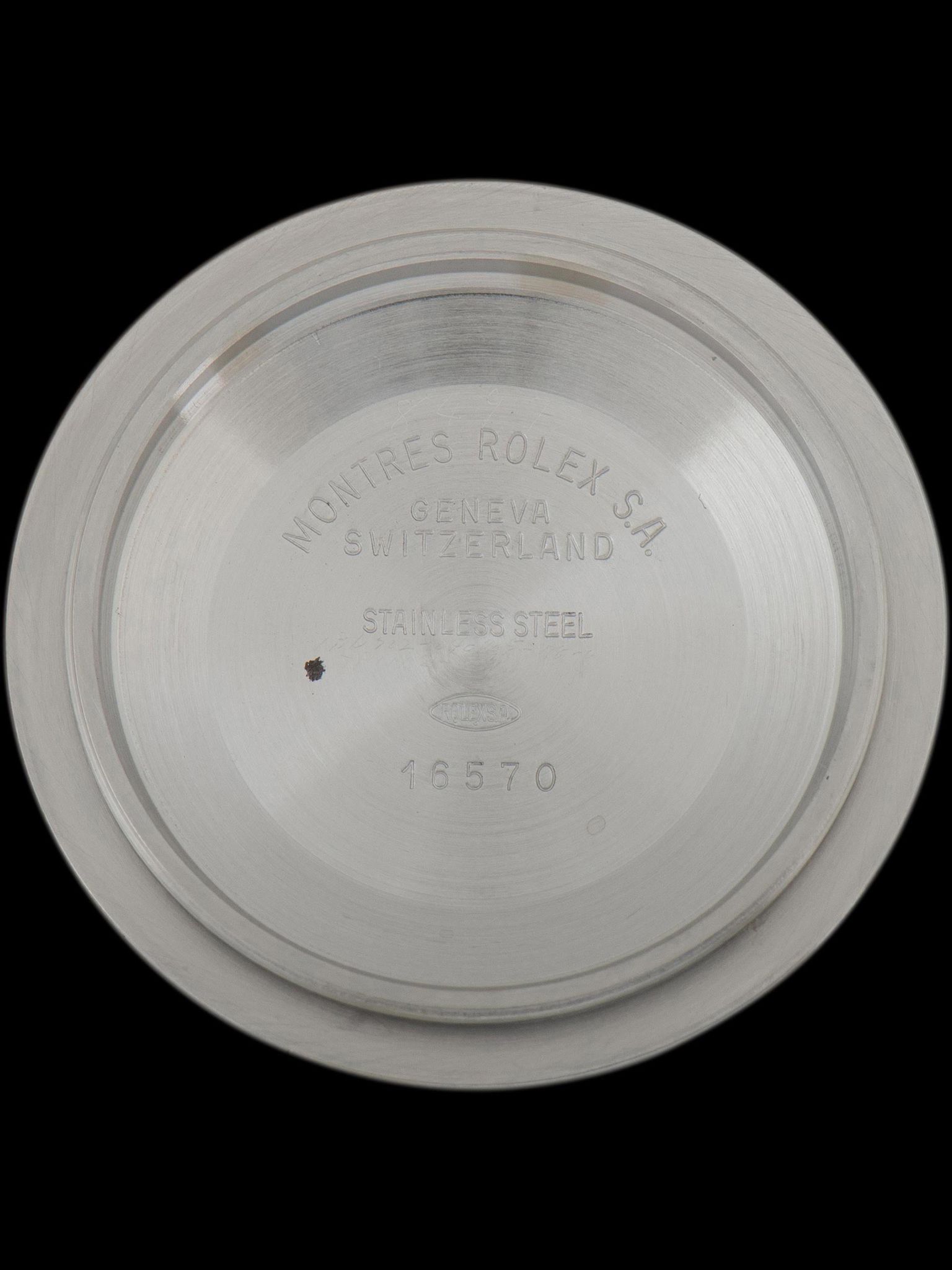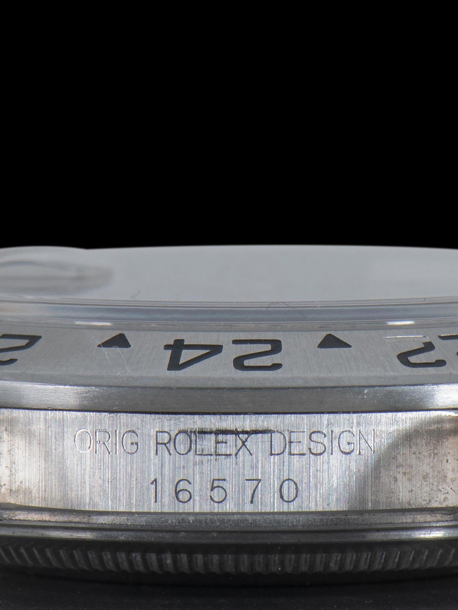 The Rolex Explorer II ref. 16570 was introduced in 1989, directly succeeding the transitional ref. 16550 with some subtle cosmetic and internal upgrades. The Rolex Explorer II ref. 16570 employs the updated and robust cal. 3185 jumping hour movement and the bezel font was slightly modified from the previous reference.