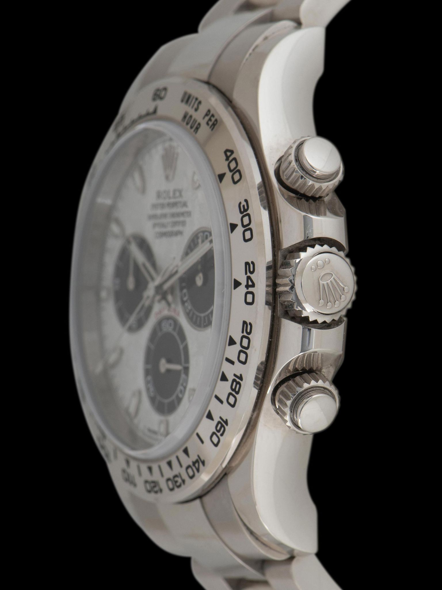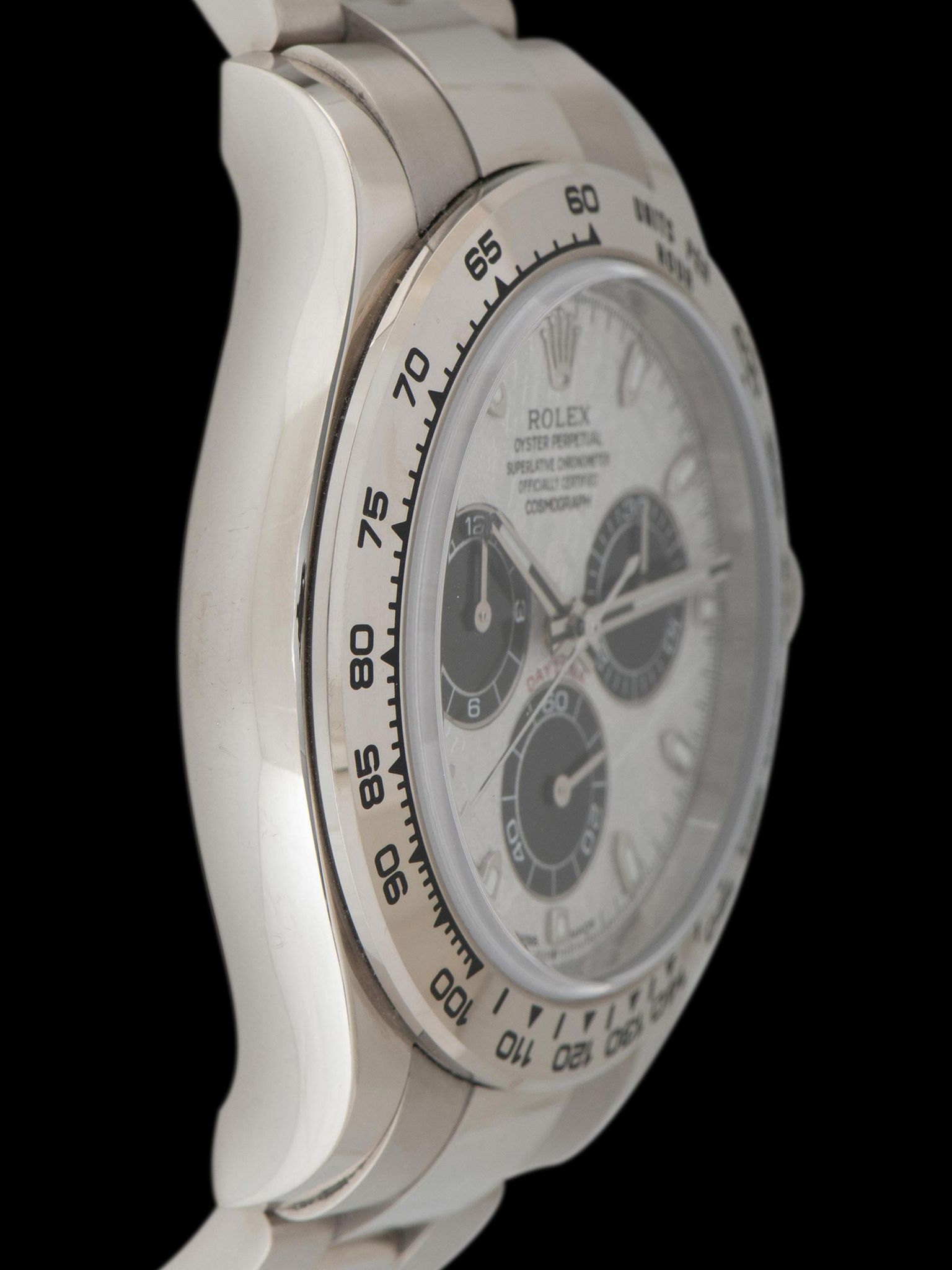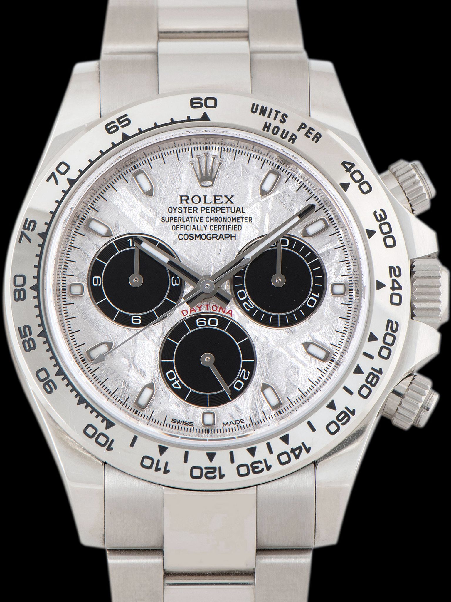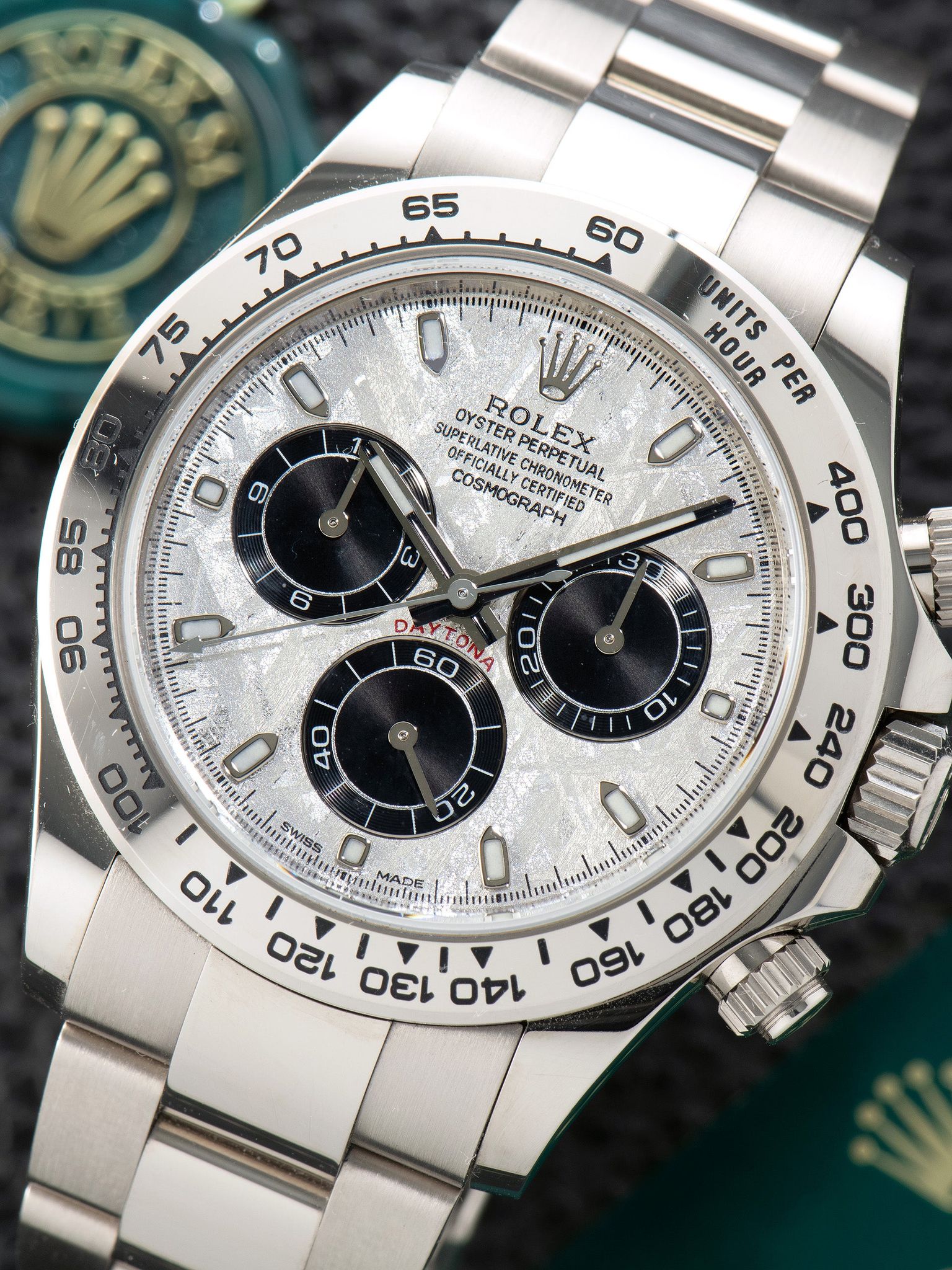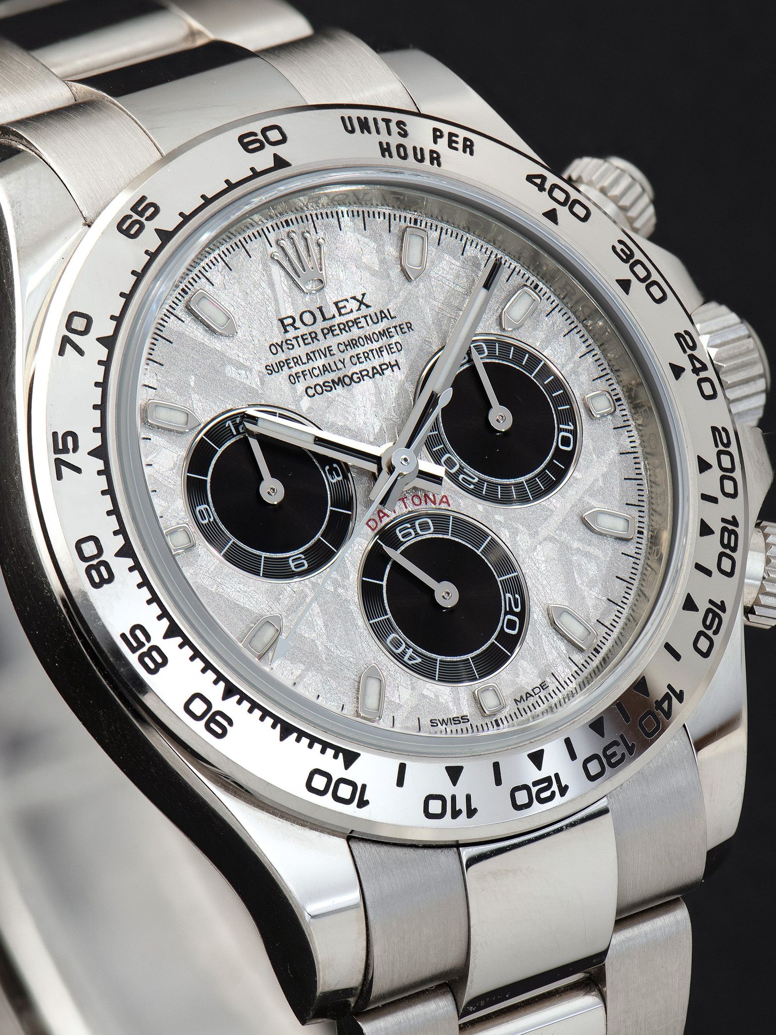 This modern interpretation elevates the classic Daytona design with a dial crafted from genuine meteorite, stone that originated from outer space, set within a solid 18K white gold case. Diverging from the familiar “panda” and “reverse panda” configurations, the meteorite dial offers a distinct and mesmerizing aesthetic. Rolex is believed to have acquired its supply of Gibeon meteorite prior to the material’s protection status, slicing it into thin sections and applying an acid treatment to reveal the natural Widmanstätten pattern before final polishing. Typically reserved for precious metal models, these meteorite dials are produced in far smaller quantities than their standard counterparts, making each example a remarkable and rare expression of Rolex craftsmanship.