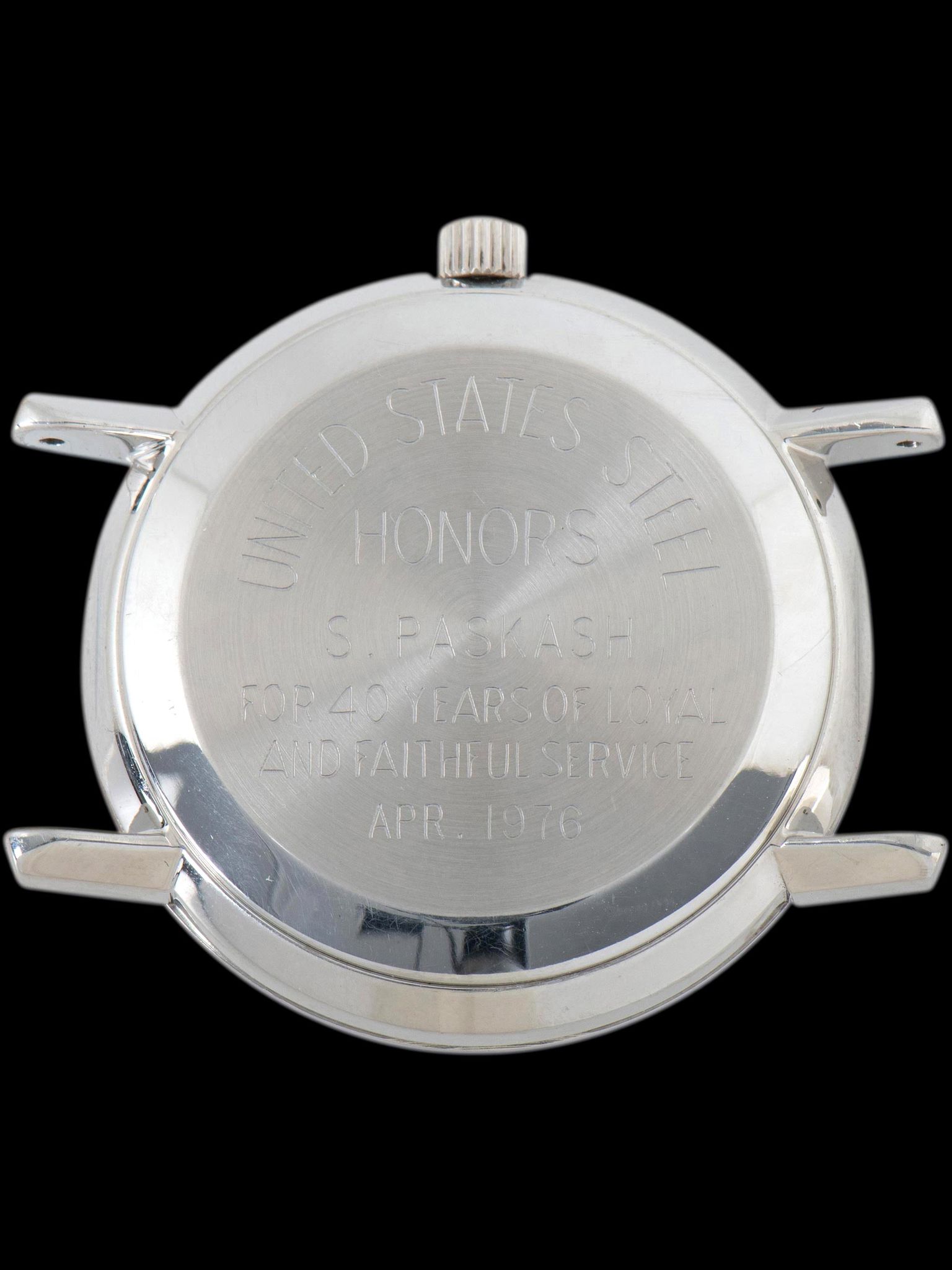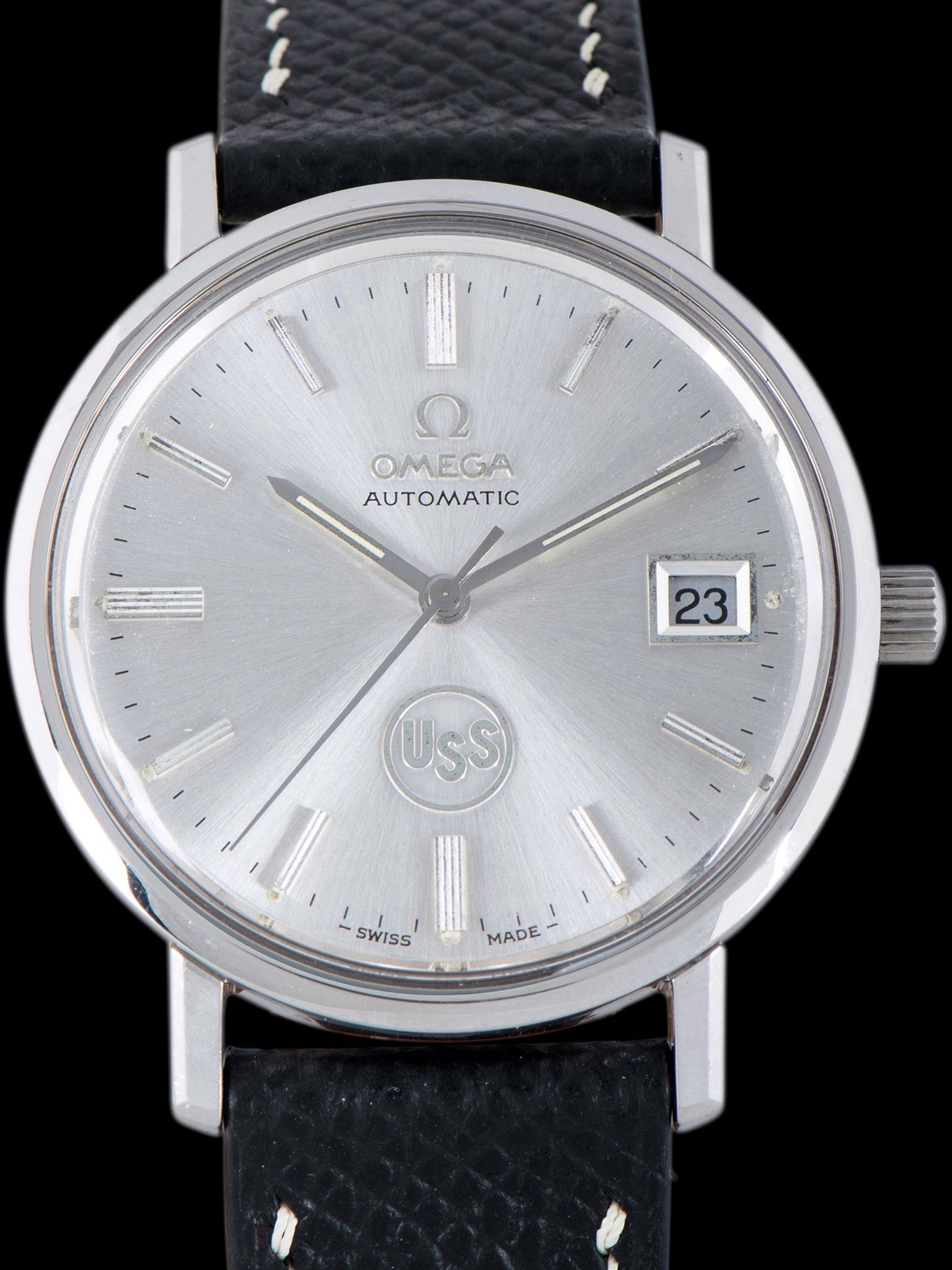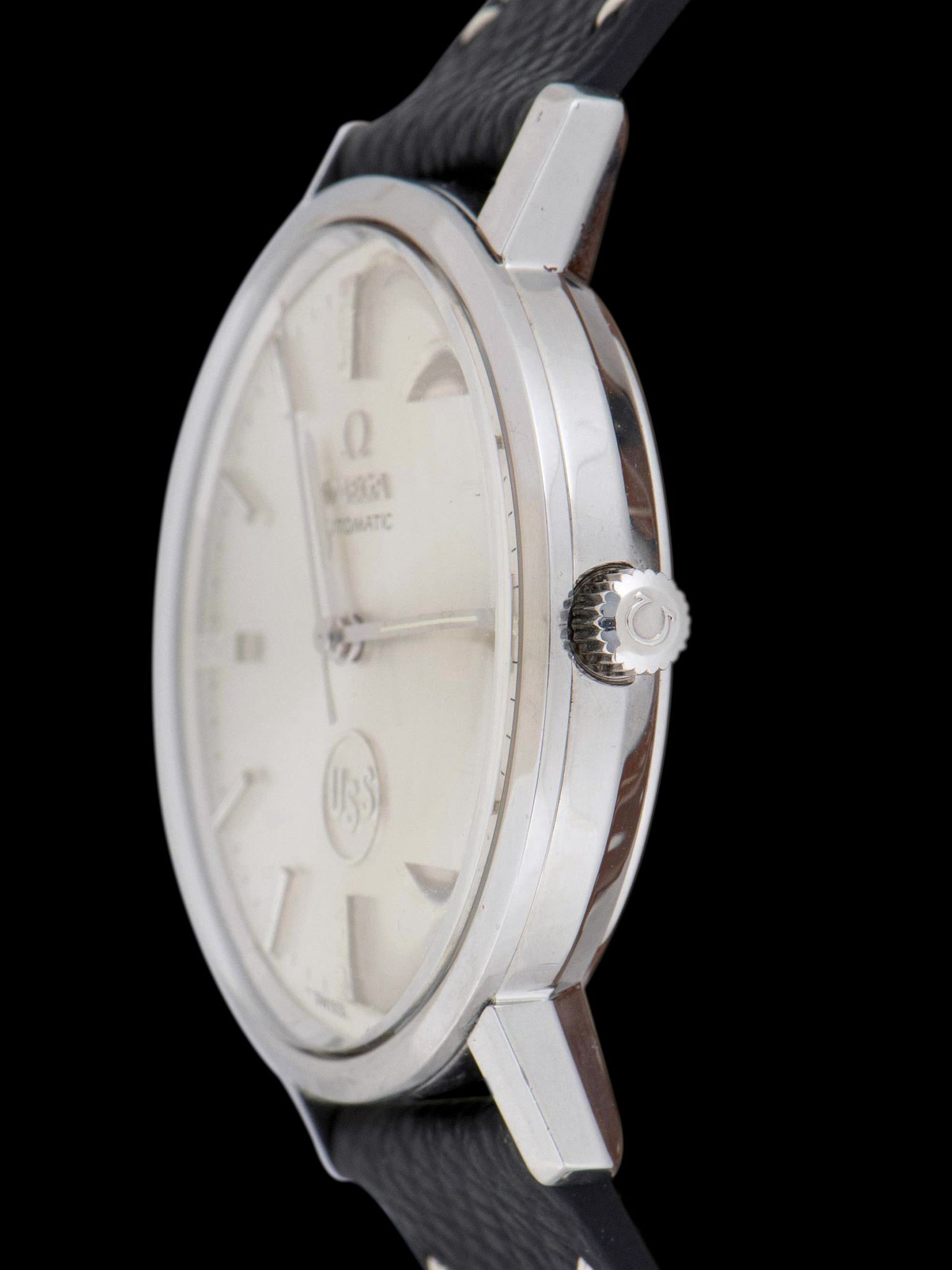 The stainless steel case features long, straight lugs that show light signs of use with no notable signs of being previously polished. The case retains its original Omega signed crown. The case back features an engraving that reads "United States Steel Honors, S. Paskash, for 40 years of loyal and faithful service, Apr. 1976" The watch comes supplied on a two-piece leather strap with silver tang buckle.