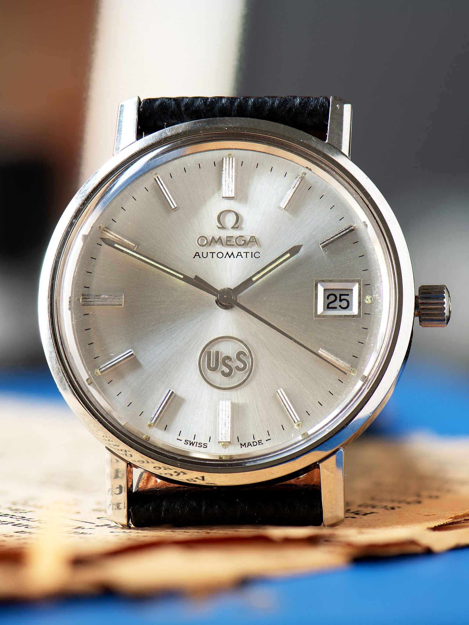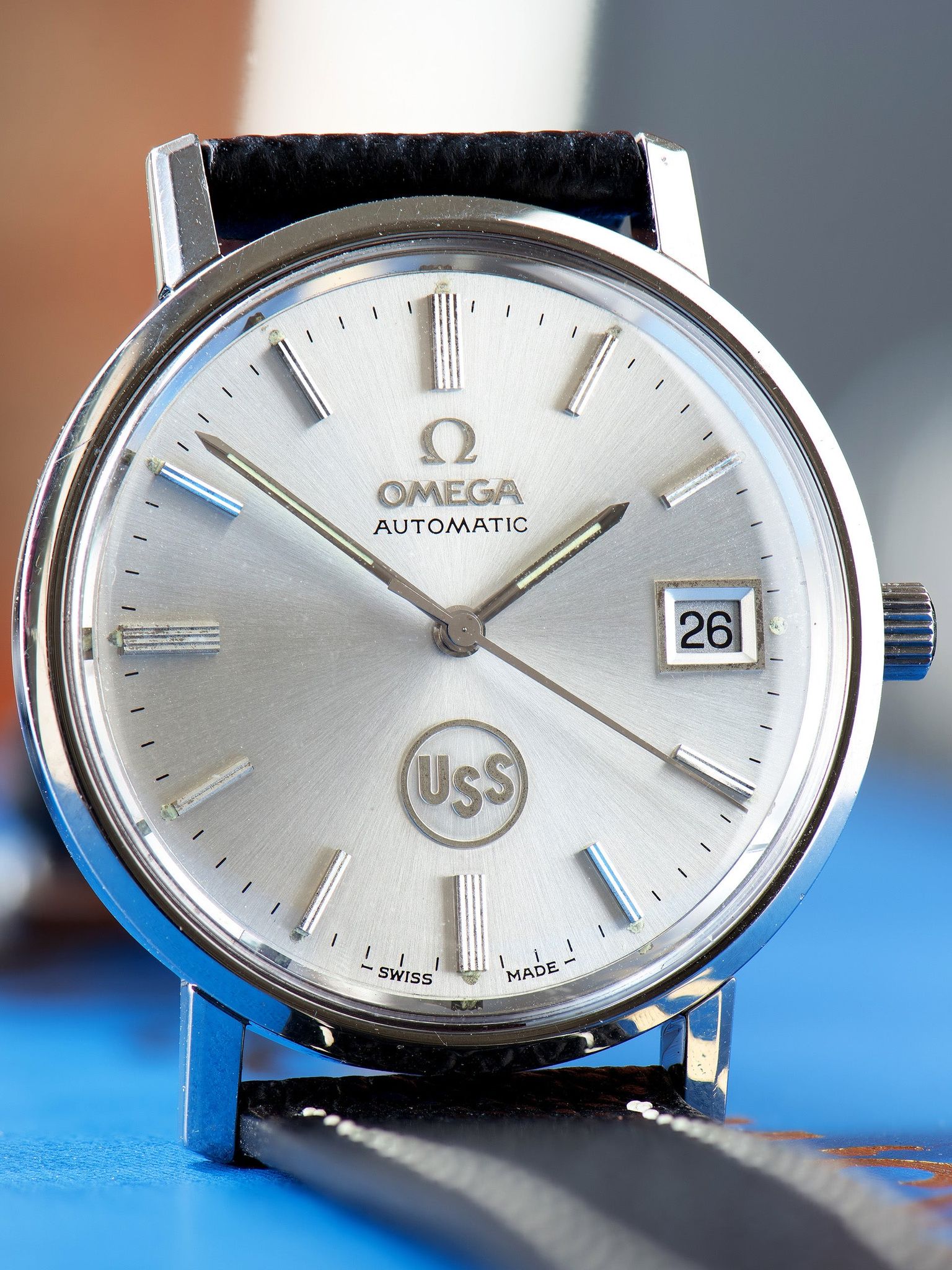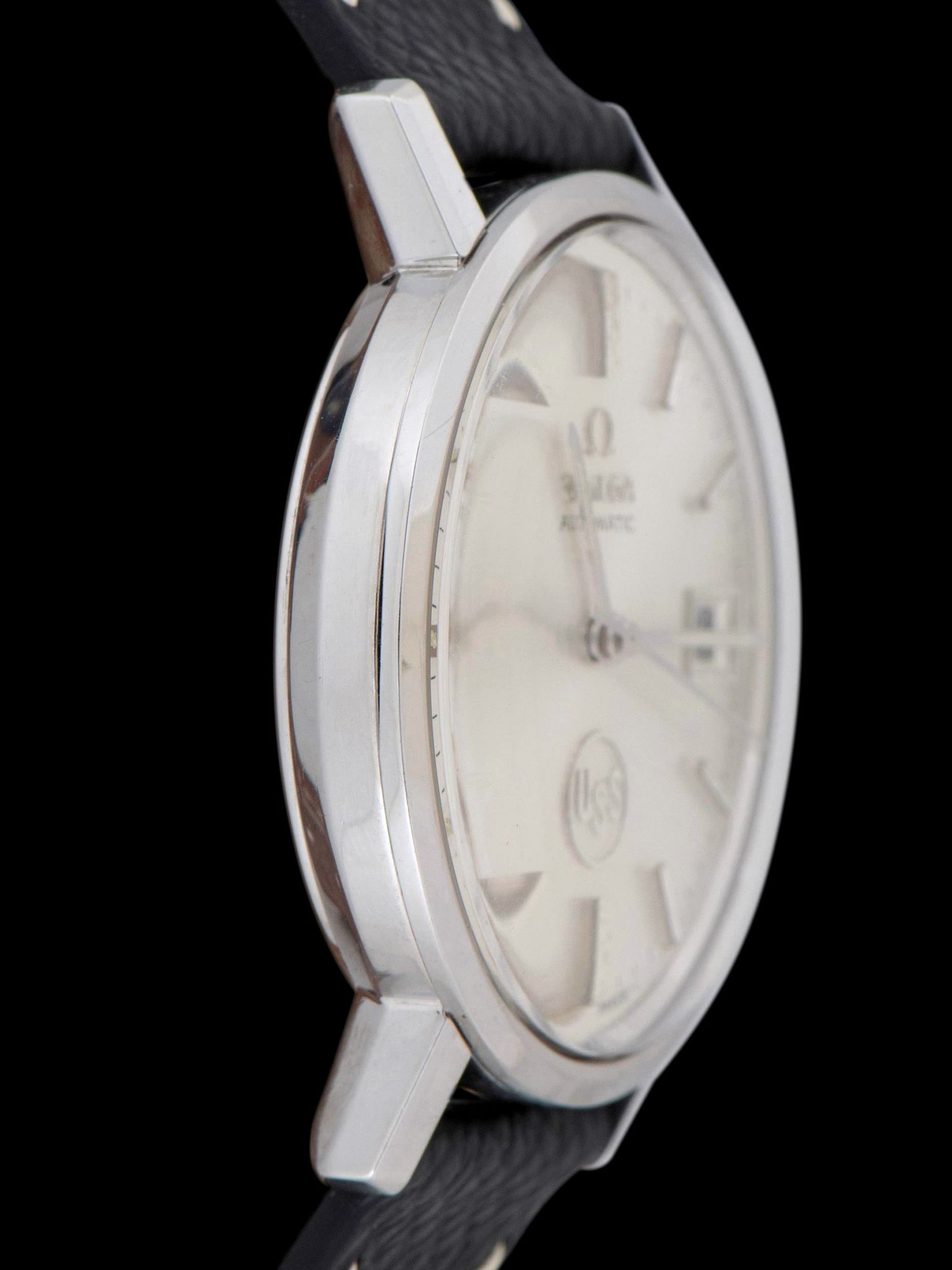 The stainless steel case features long, straight lugs that show light signs of use with no notable signs of being previously polished. The case retains its original Omega signed crown. The case back features an engraving that reads "United States Steel Honors, S. Paskash, for 40 years of loyal and faithful service, Apr. 1976" The watch comes supplied on a two-piece leather strap with silver tang buckle.