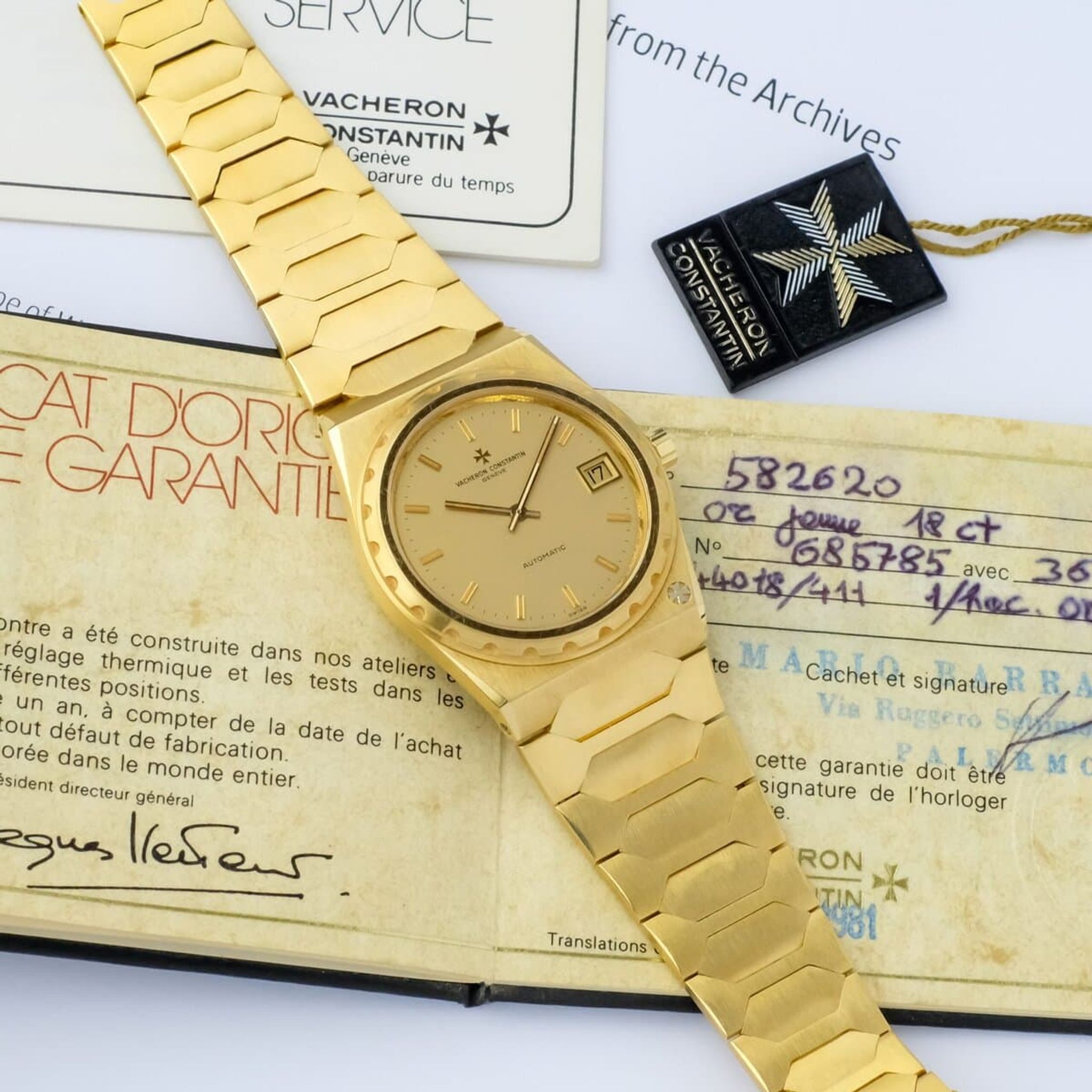This Vacheron Constantin 222 reference 44018 is an extraordinary first owner provenance example of the brand’s legendary integrated bracelet sports watch. Crafted entirely in 18k yellow gold, it is accompanied by its full set, a Vacheron Constantin service receipt, and an Extract from the Archives, confirming both its authenticity and original delivery details.