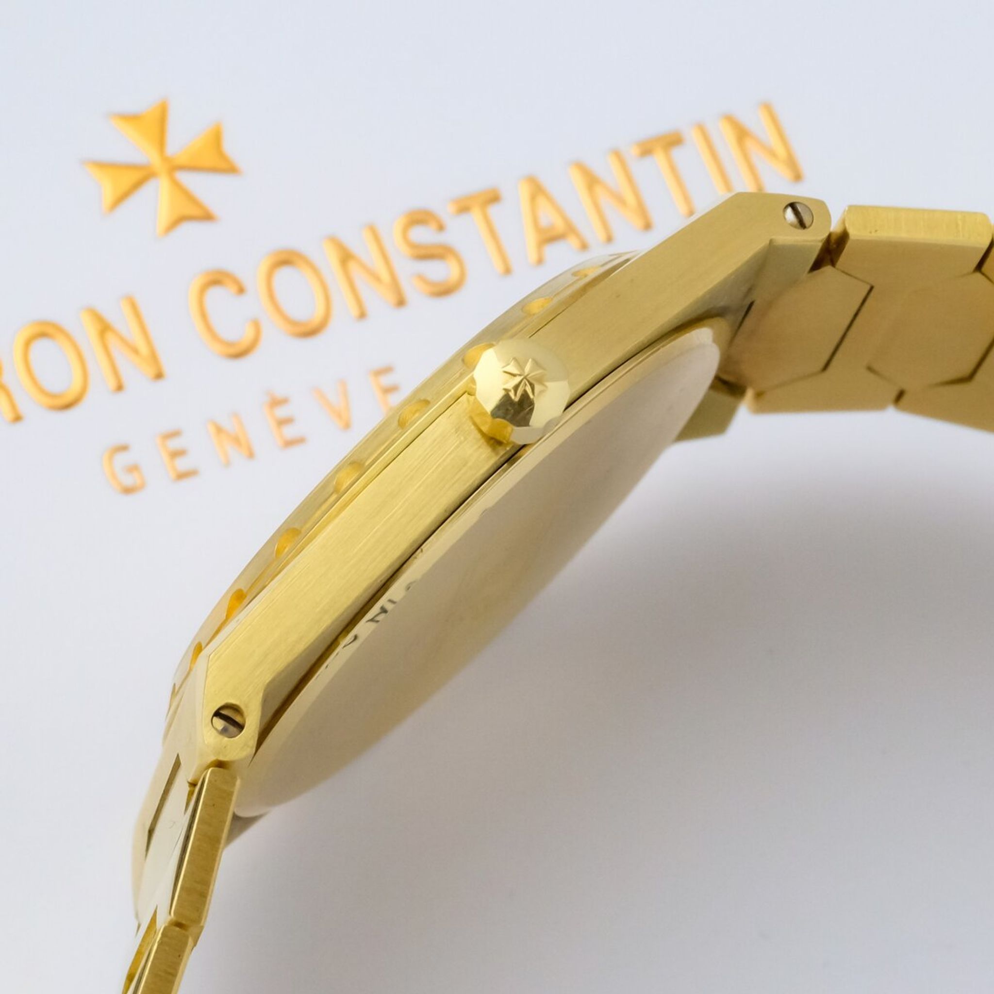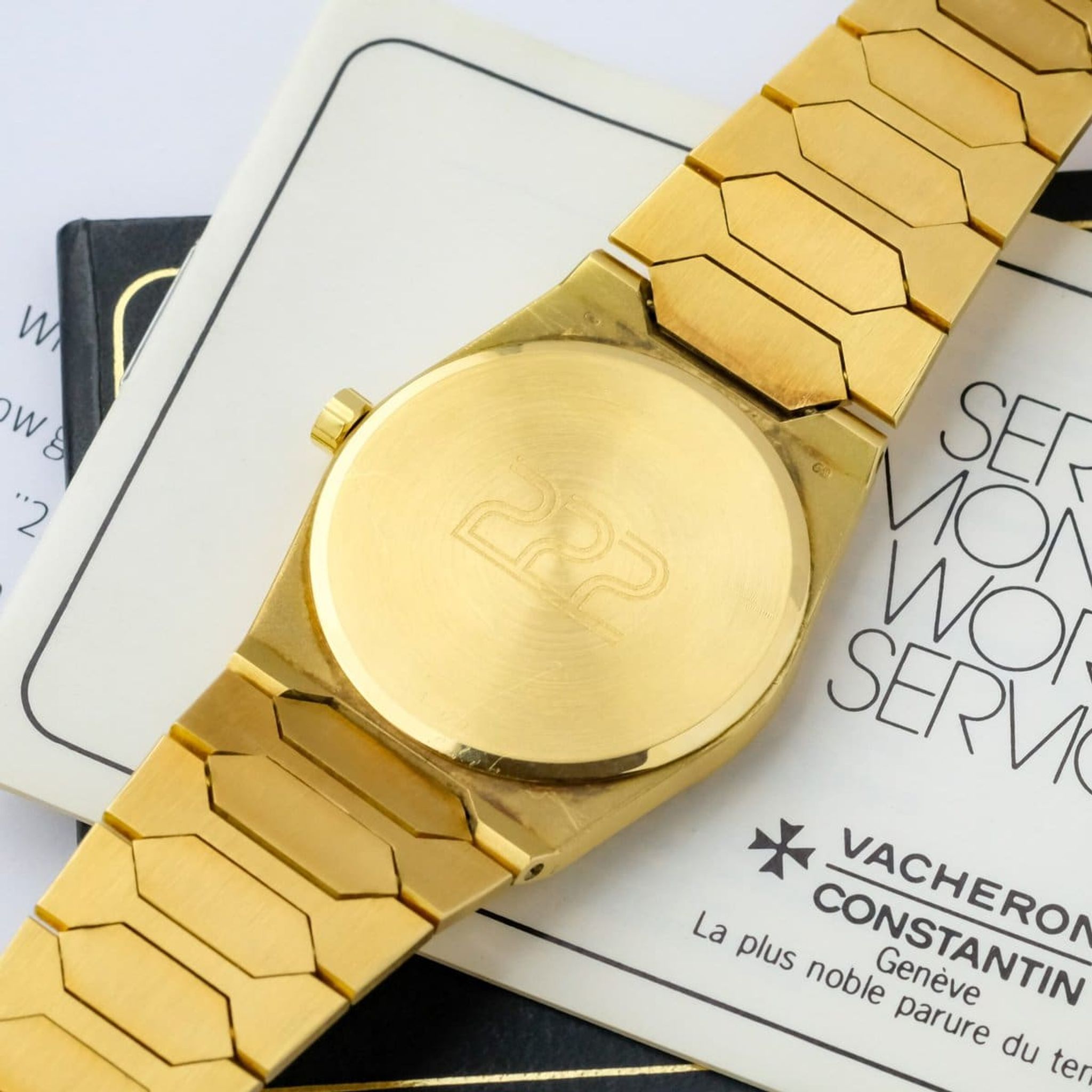 Worn only sparingly, the watch remains in near mint condition with sharp edges, crisp engravings, and only the faintest hairline marks from light handling. The matching yellow gold dial perfectly complements the case and bracelet, creating a seamless and luxurious monochromatic look that highlights the elegance of the 222’s design.