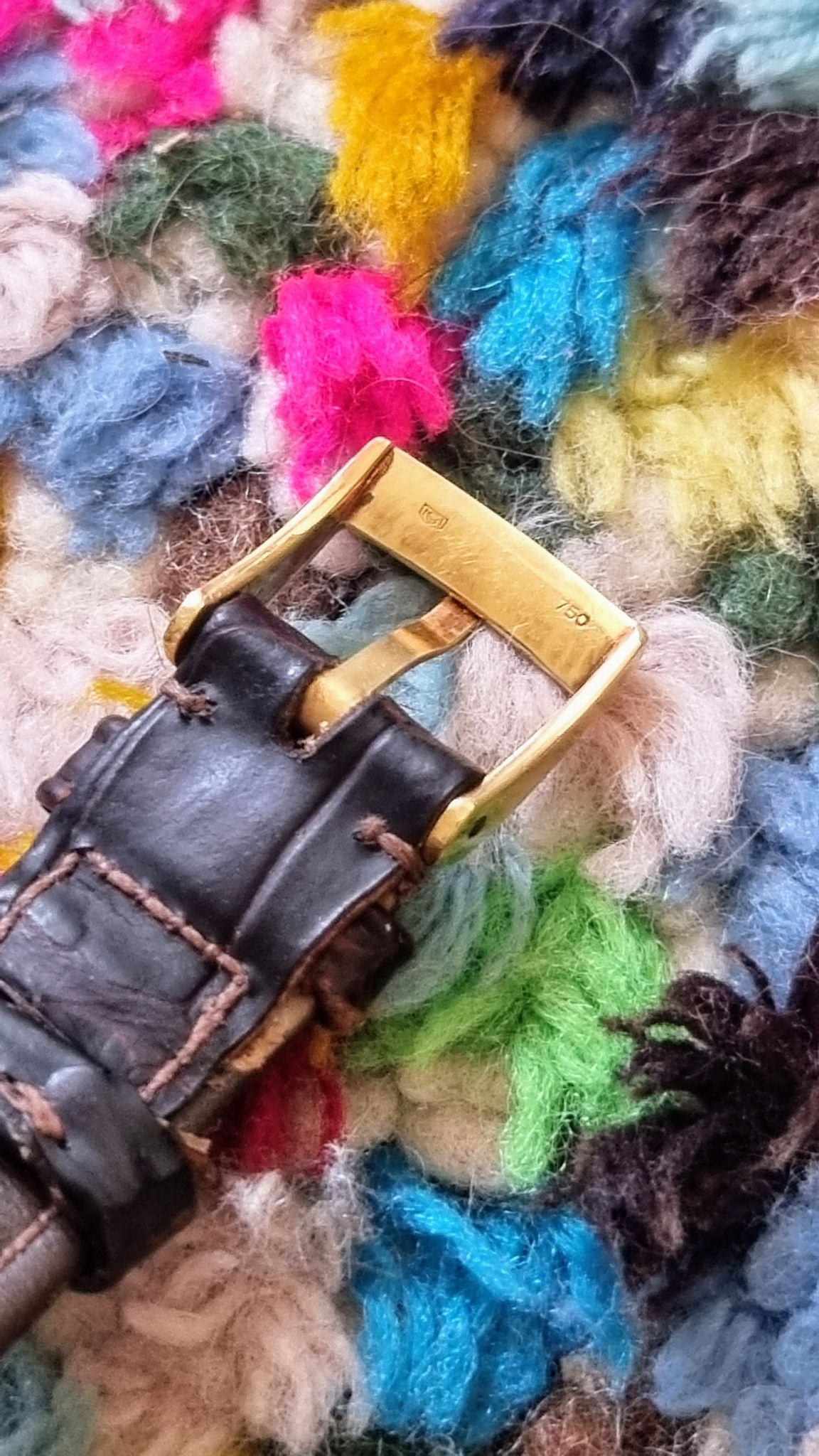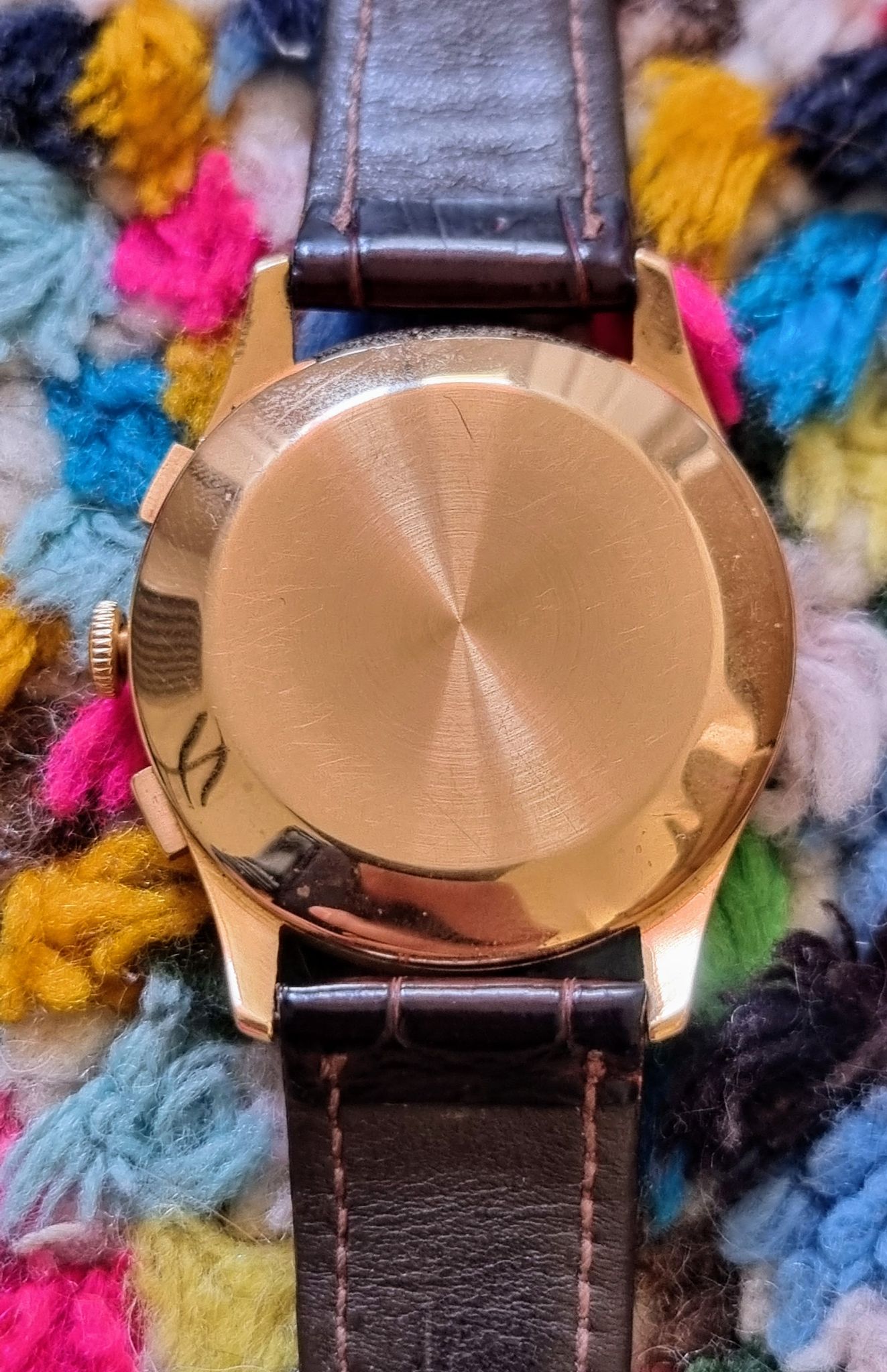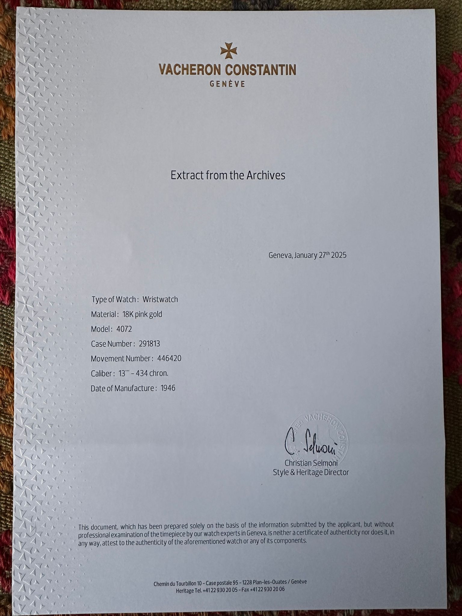 Iconic chronograph 4072 in harder to find pink gold. Manufactured in 1946 and still in excellent condition. The lovely linen effect dial is also the rare imperial measure style with units in miles rather than kilometeres. Although confirmed that this variation exists, I have had a hard time finding another.