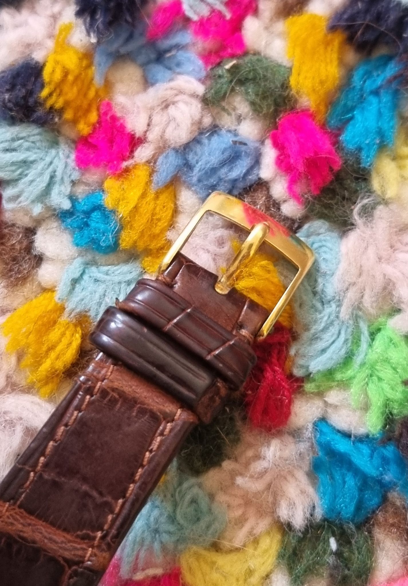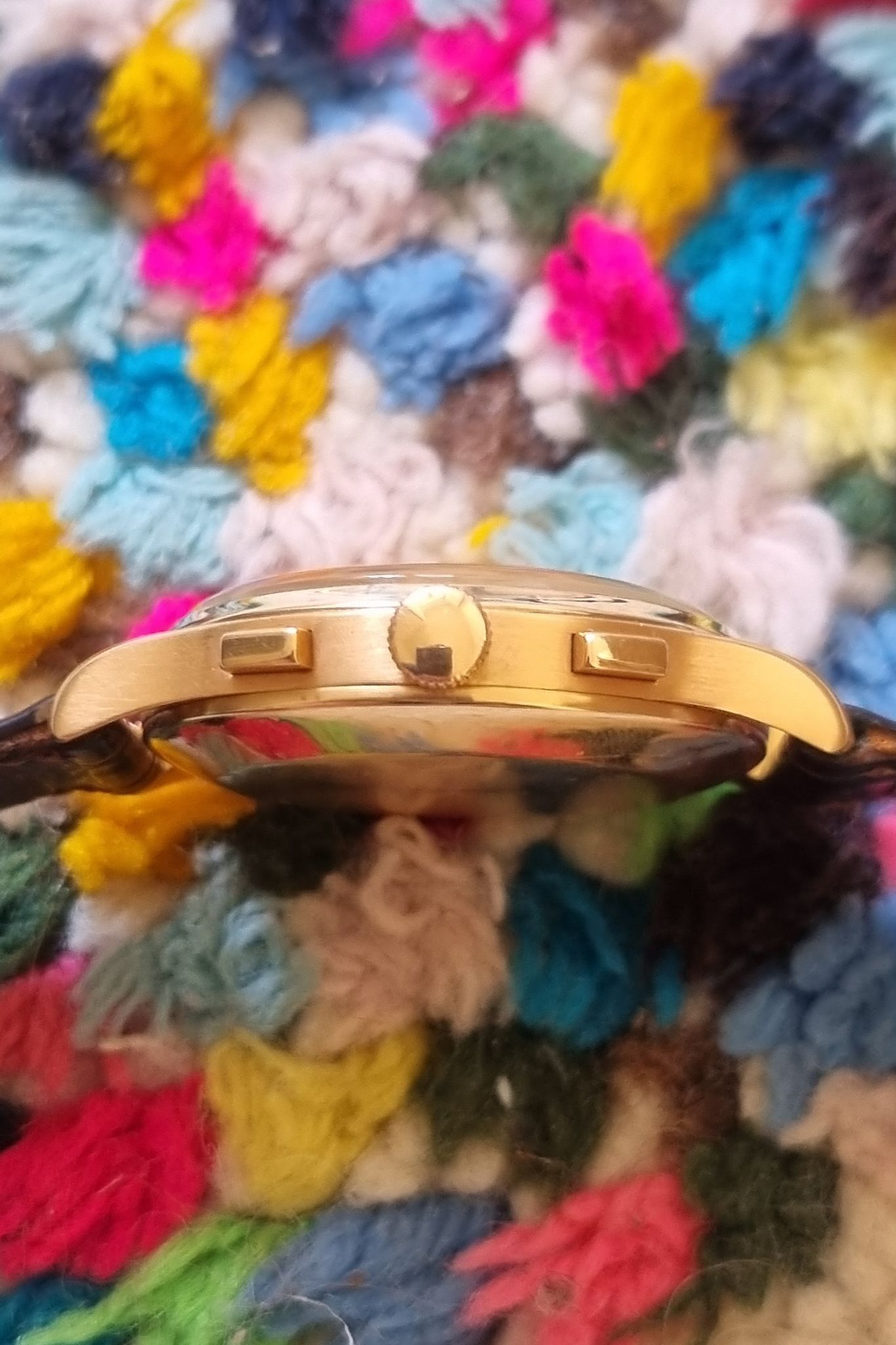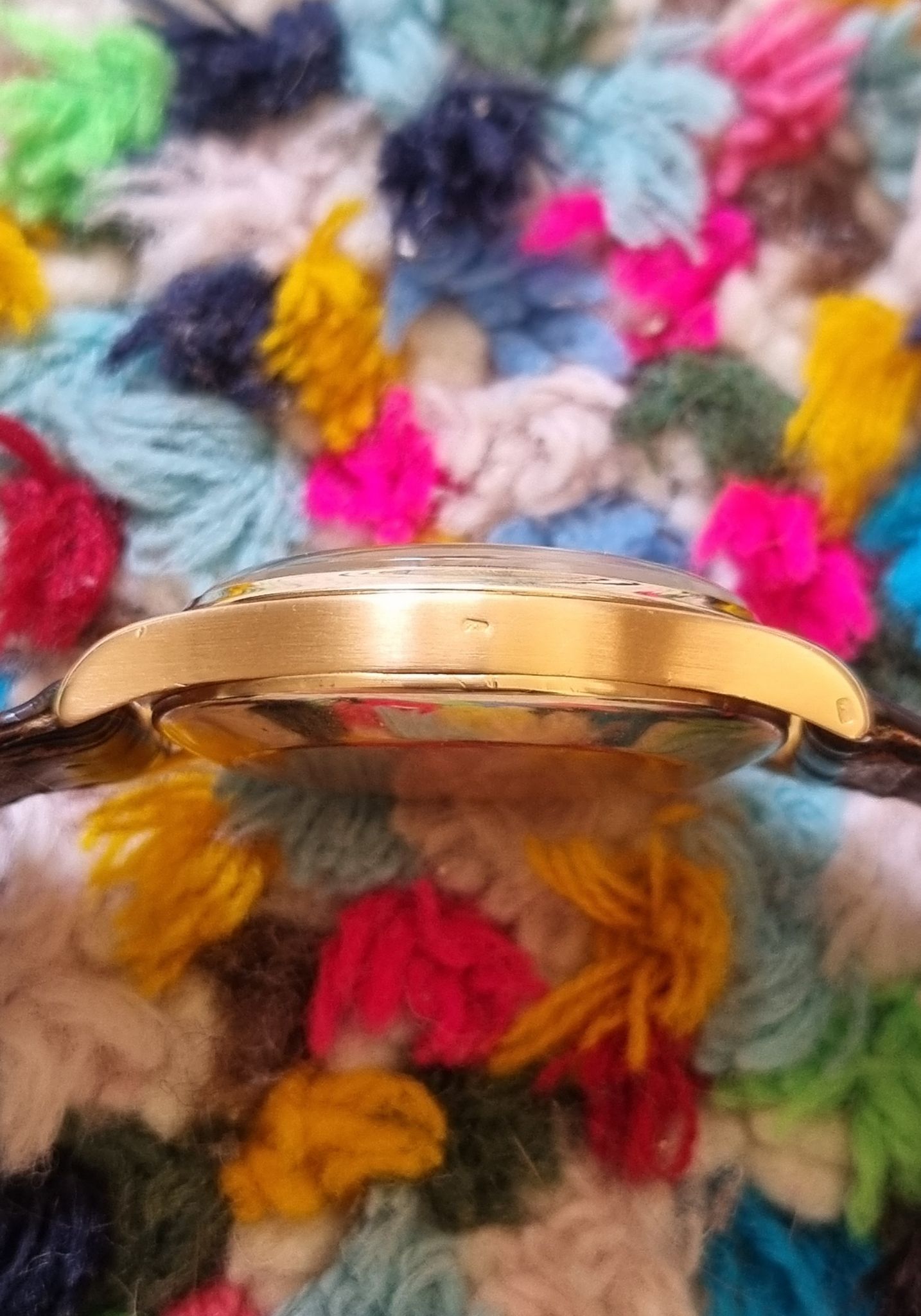 Iconic chronograph 4072 in harder to find pink gold. Manufactured in 1946 and still in excellent condition. The lovely linen effect dial is also the rare imperial measure style with units in miles rather than kilometeres. Although confirmed that this variation exists, I have had a hard time finding another.