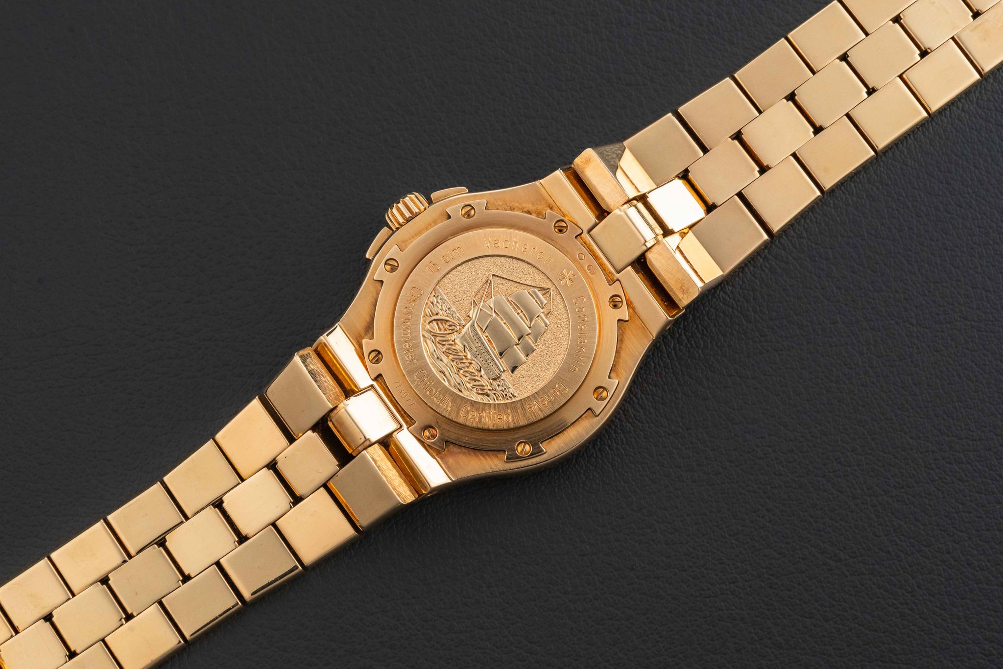 Up for grabs is a lovely example of the original 1990s Vacheron Constantin “Jumbo”-sized Overseas in solid 18kt yellow gold, reference 42042J. This model was produced in a larger 37mm (versus the 35mm reference), and comes with its original Vacheron Constantin box, Certificate of Origin (originally sold in July of 2002), COSC certification, and instruction booklet . The condition of this Vacheron Constantin Overseas is great, with a very lightly detailed case, and absolutely perfect dial and original tritium lume. The bracelet shows minimal wear, and will fit an approximate 7.5″ wrist.