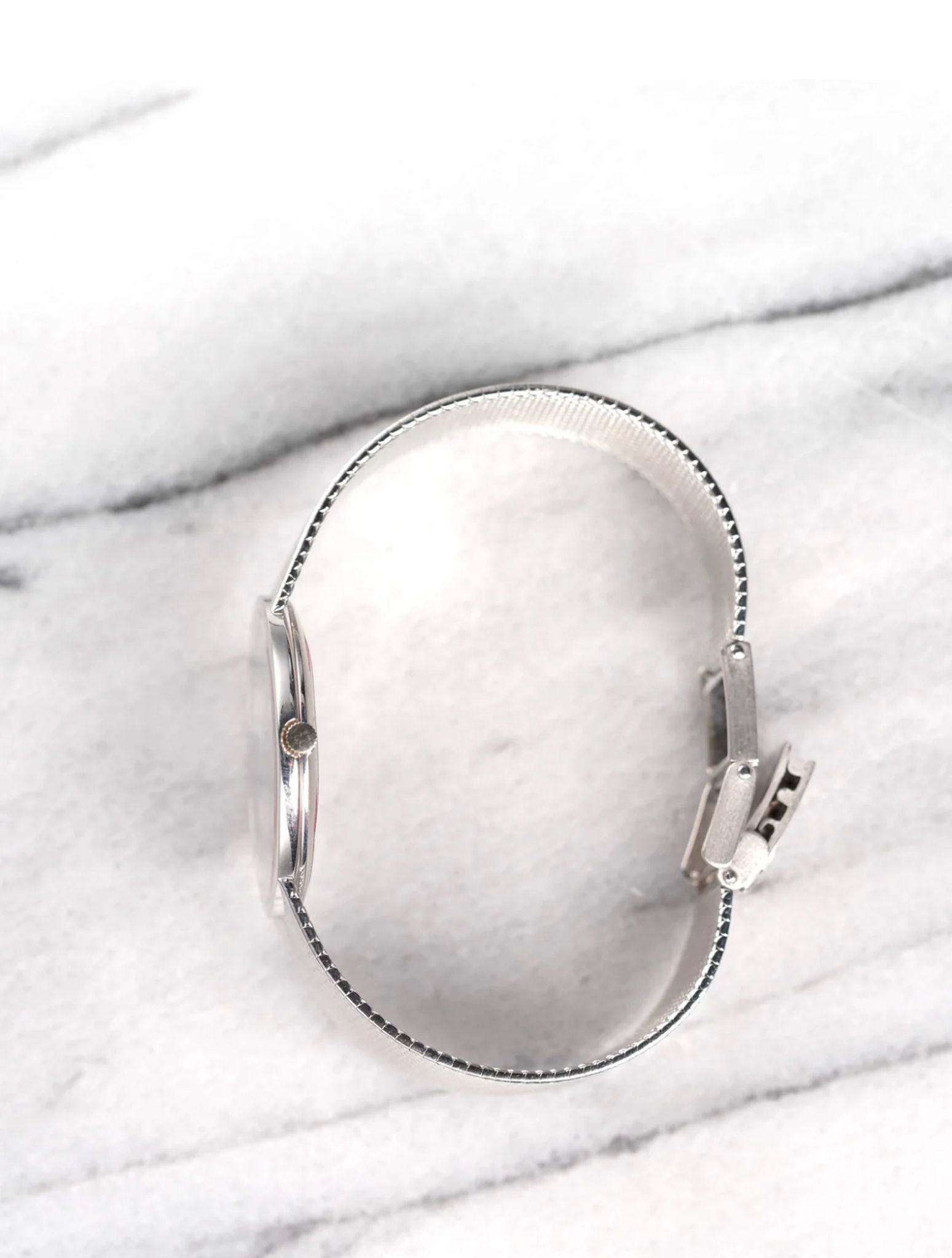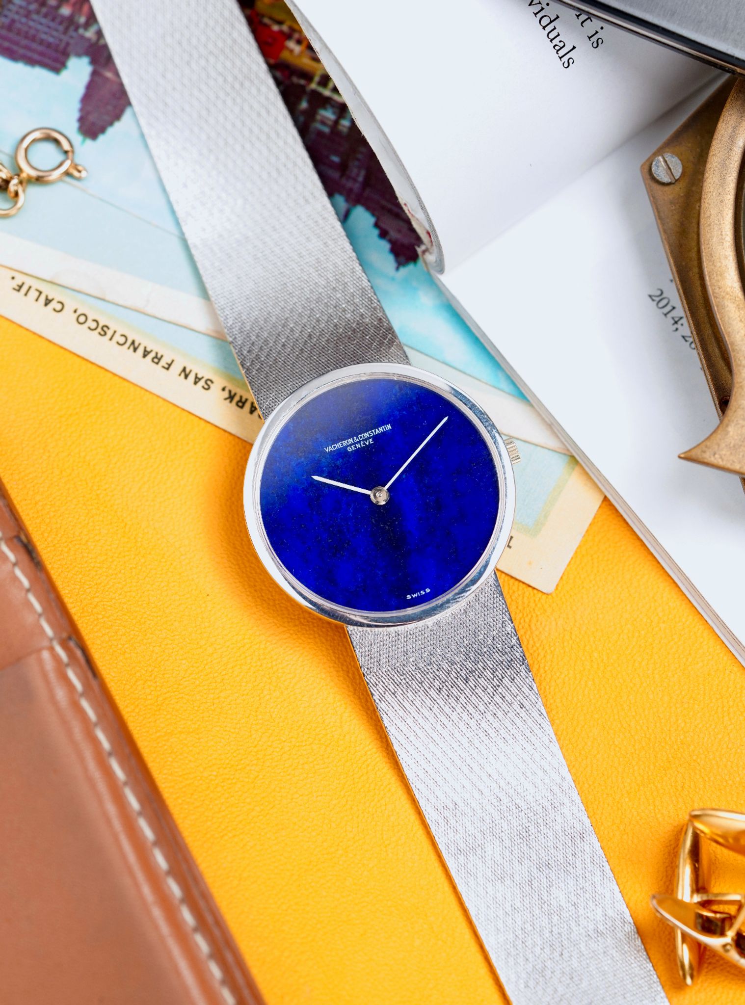 Here's a vintage Vacheron Constantin manual wind in 18K white gold with a factory lapis dial from the 70s. Keeps great time and is fully functional. Measurements include a 33 mm case size across and an integrated bracelet (signed clasp) that fits up to a 7 inch wrist. White stick hands. 18K White gold case and bracelet. The piece is unisex,it can be worn by both men and women. We’ve never seen an example like this! The piece is great alternative and value from other pieces offered by Vacheron. All parts are original including the dial, case, and movement. the dial and case are in great cosmetic, untouched condition.