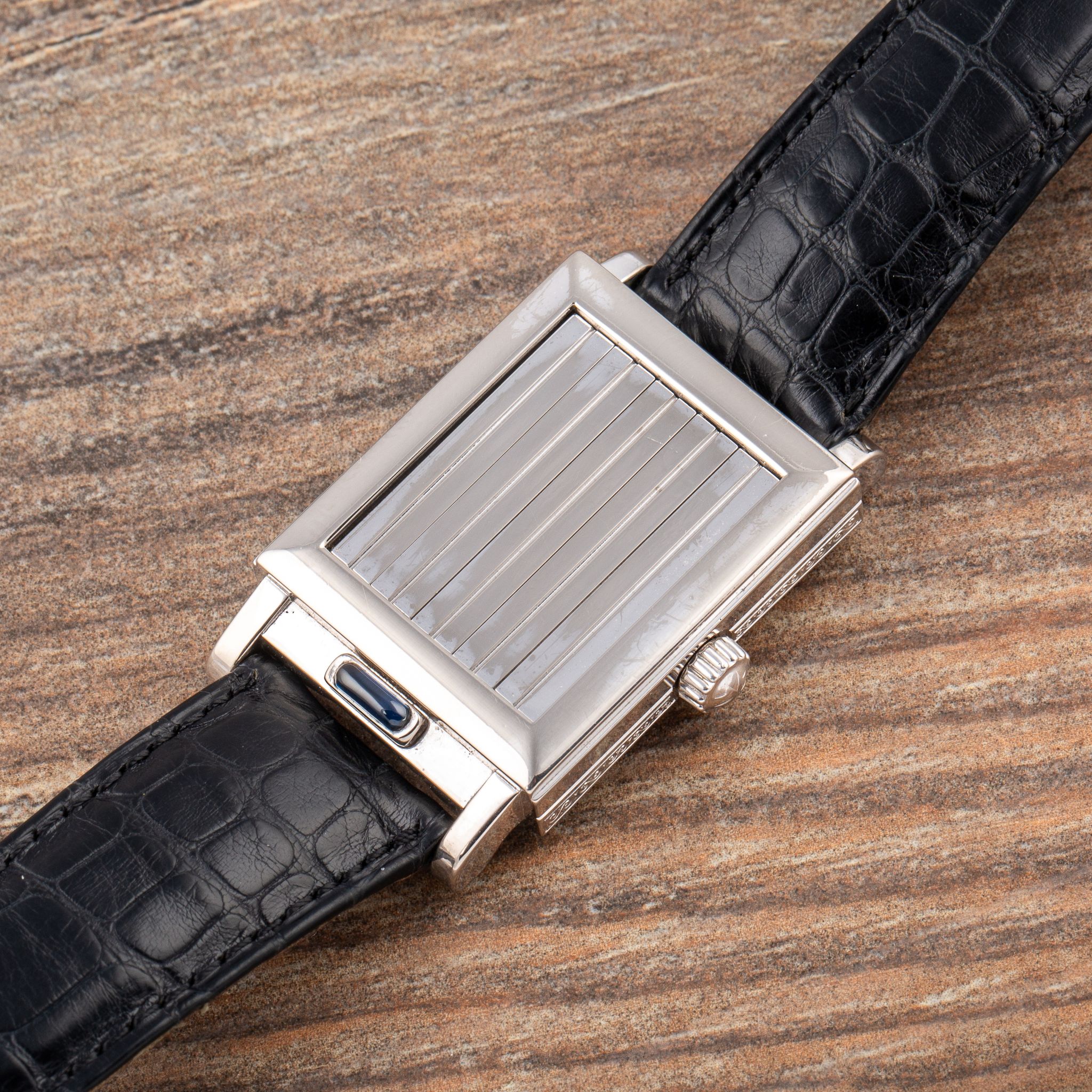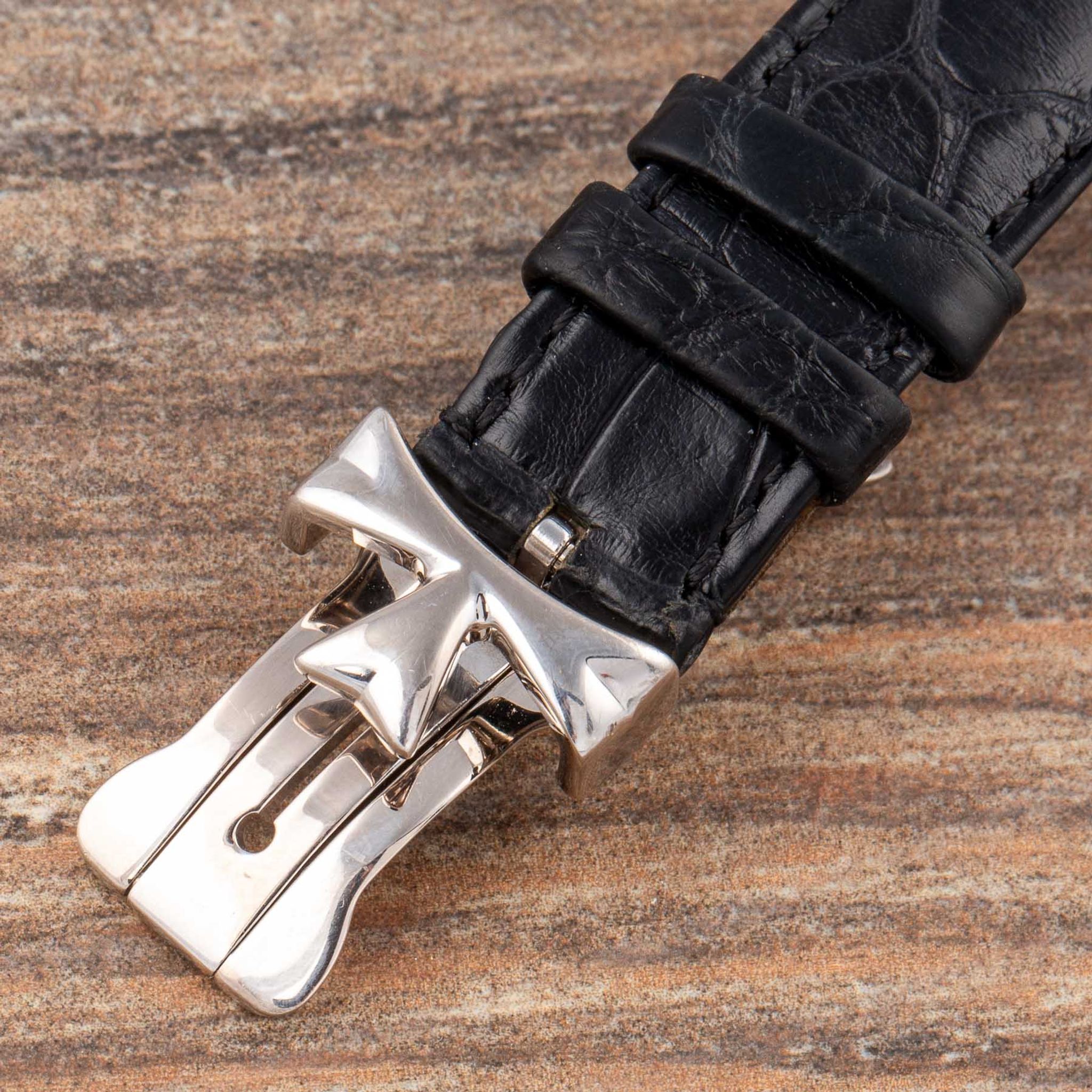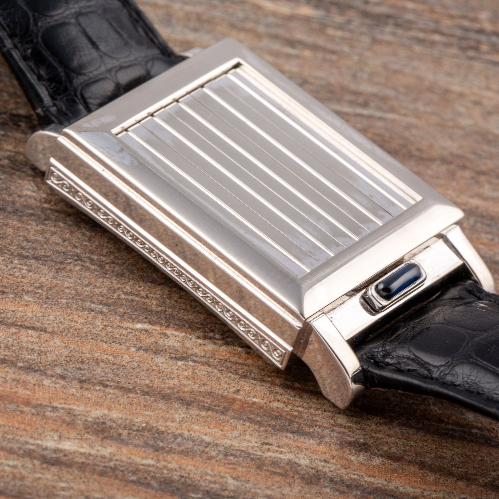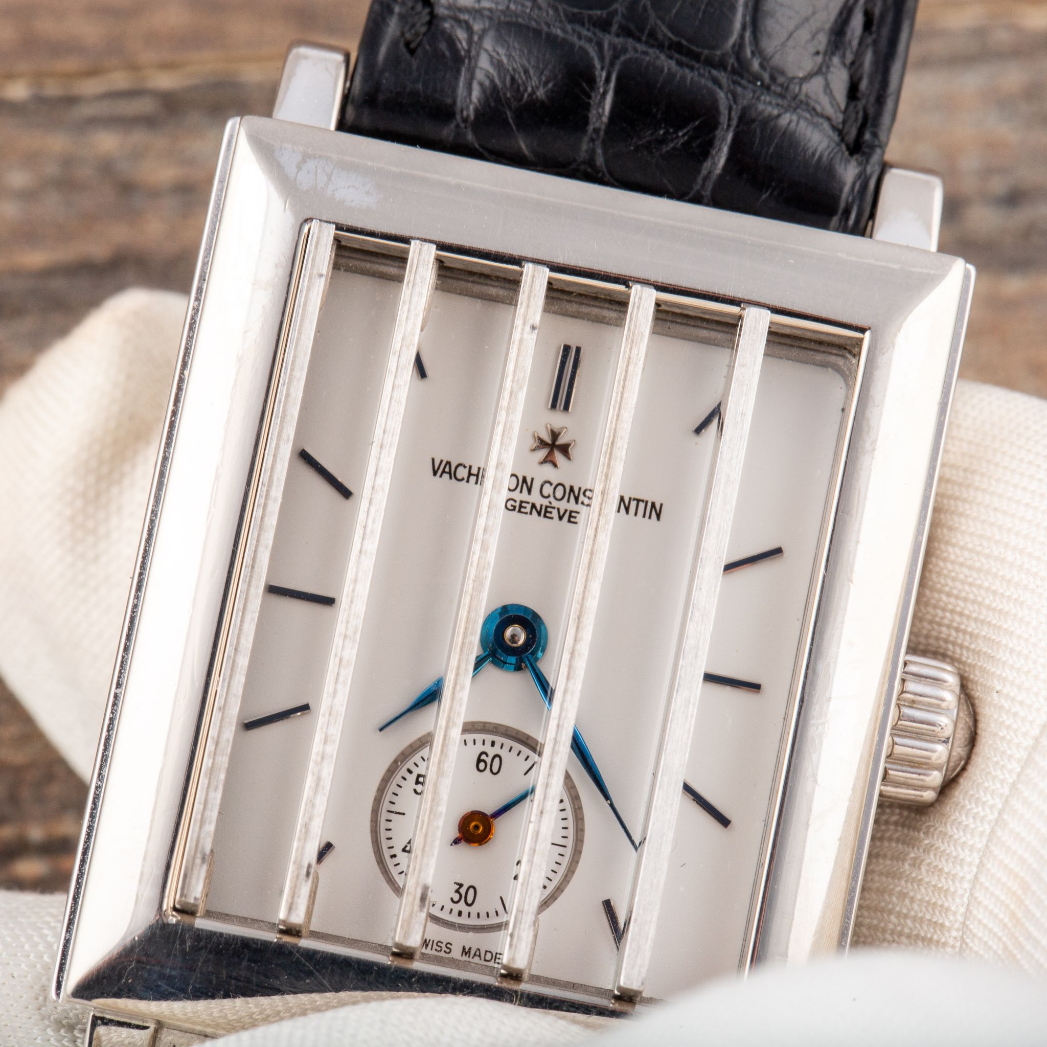 This Vacheron Constantin Jaulosie watch is an exceptionally rare model from the “Historique” line, produced by Vacheron Constantin in the 1990s. The Jaulosie was predominantly crafted in gold, with the white gold version, like the present specimen, being the rarest and produced in limited quantities. Its rectangular case is intricately adorned with decorative motifs on the sides. When the lever at 6 o’clock is not engaged, the watch is concealed by a complex mechanism resembling grates, which open upon pushing the lever and activating the mechanism. Beneath the cover lies a simple yet elegant timepiece with a silver dial and a subsidiary dial at 6 o’clock, adorned with blue steel hands. This mechanical, manual-winding watch is based on a JLC caliber, a characteristic occasionally found in Vacheron Constantin timepieces. In terms of condition, the watch is exceptionally well-preserved, showing minimal signs of handling on the case. The original leather strap, accompanied by a matching Vacheron Constantin deployant clasp, adds to its allure. Undoubtedly, this is a truly special and rare addition to any Vacheron Constantin-themed collection.