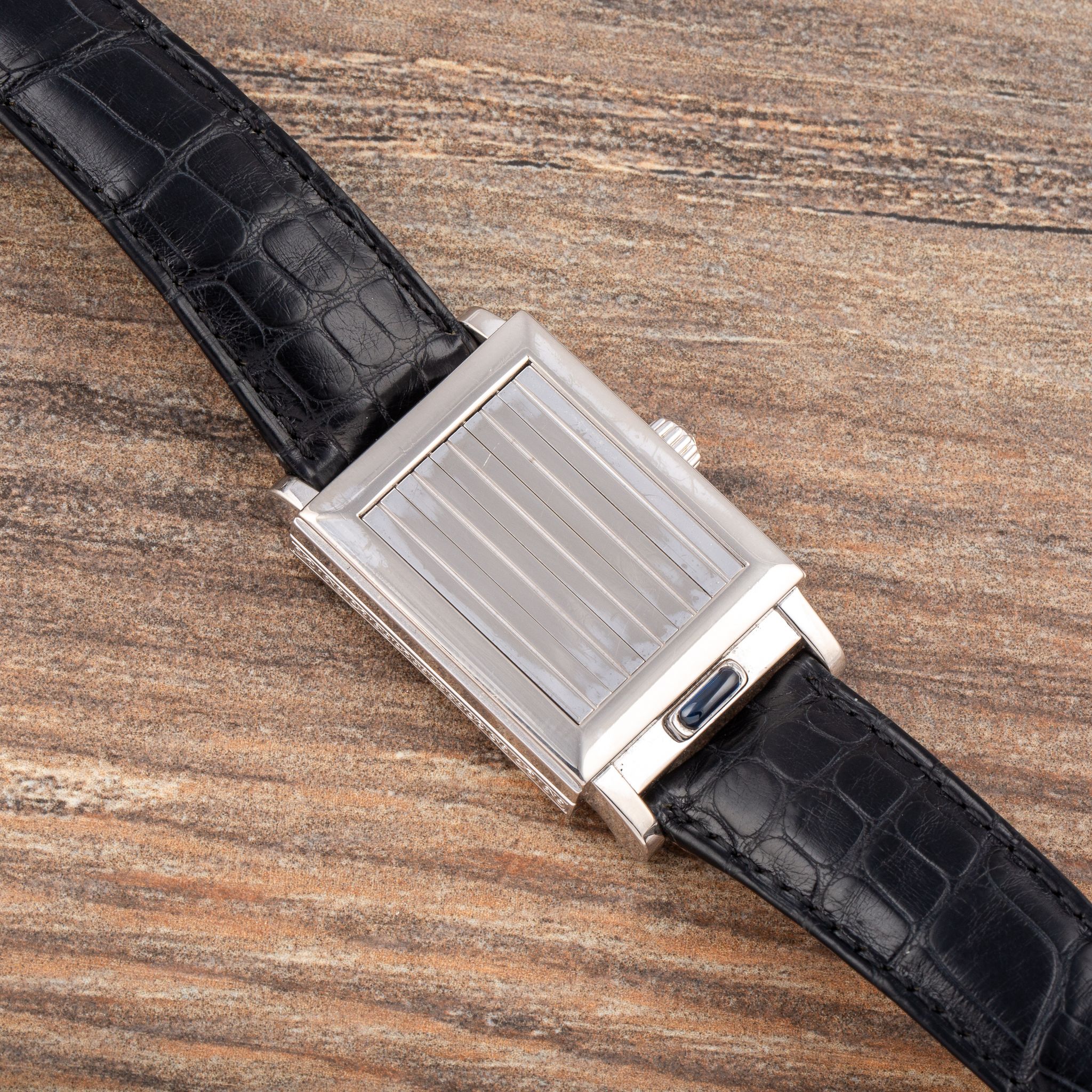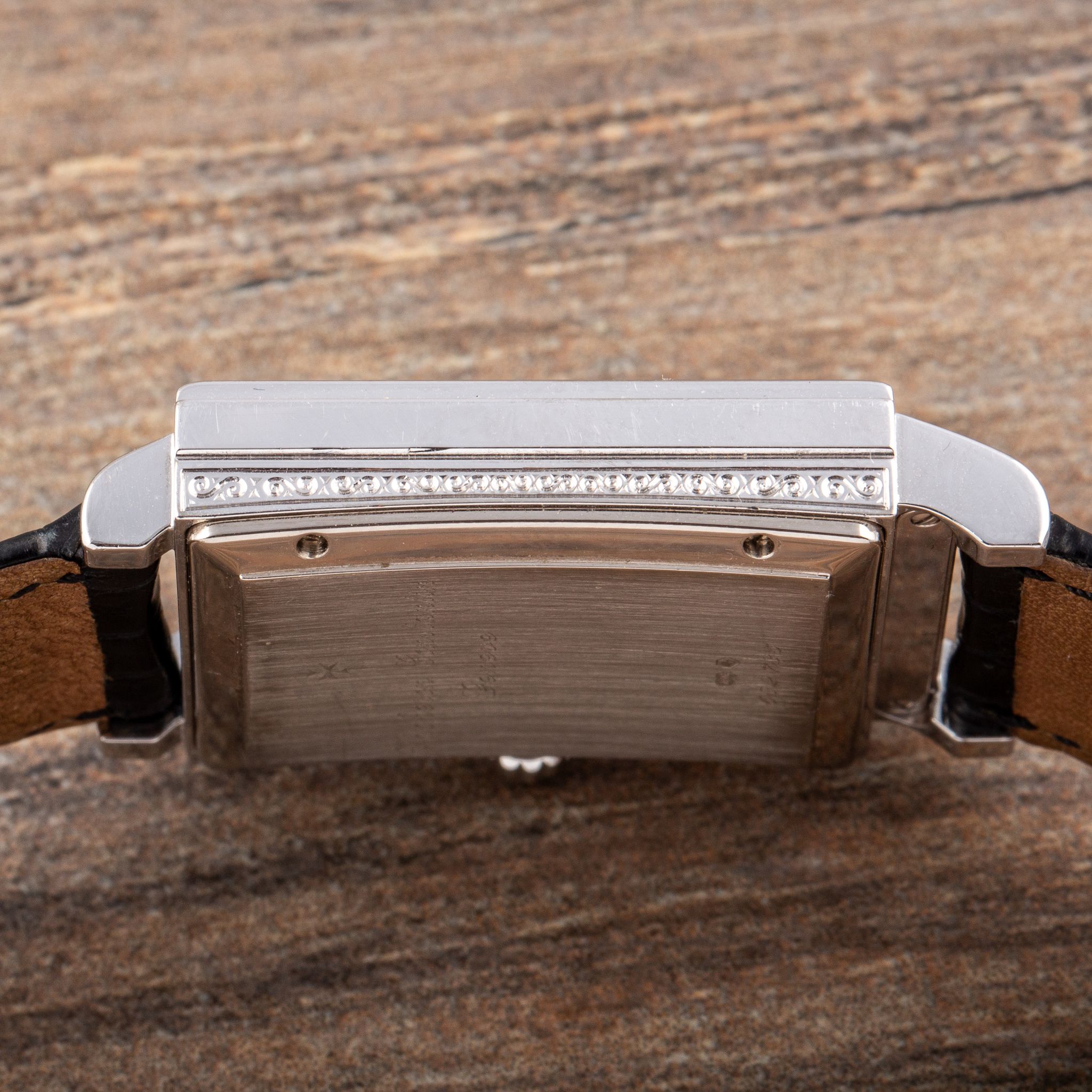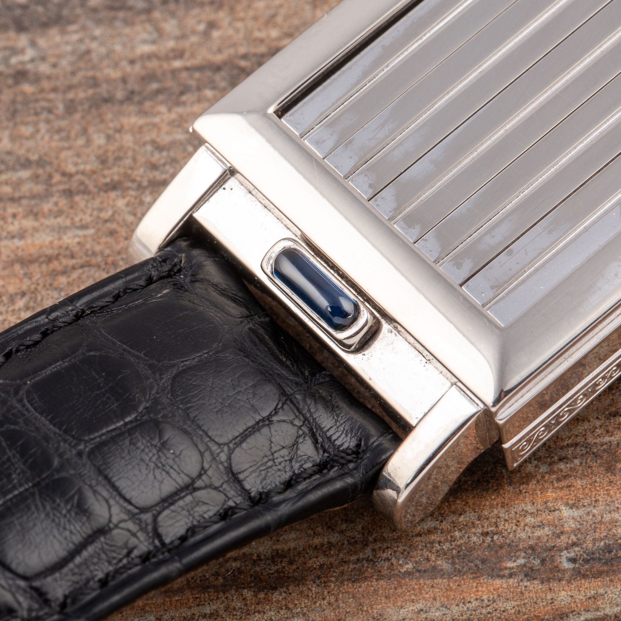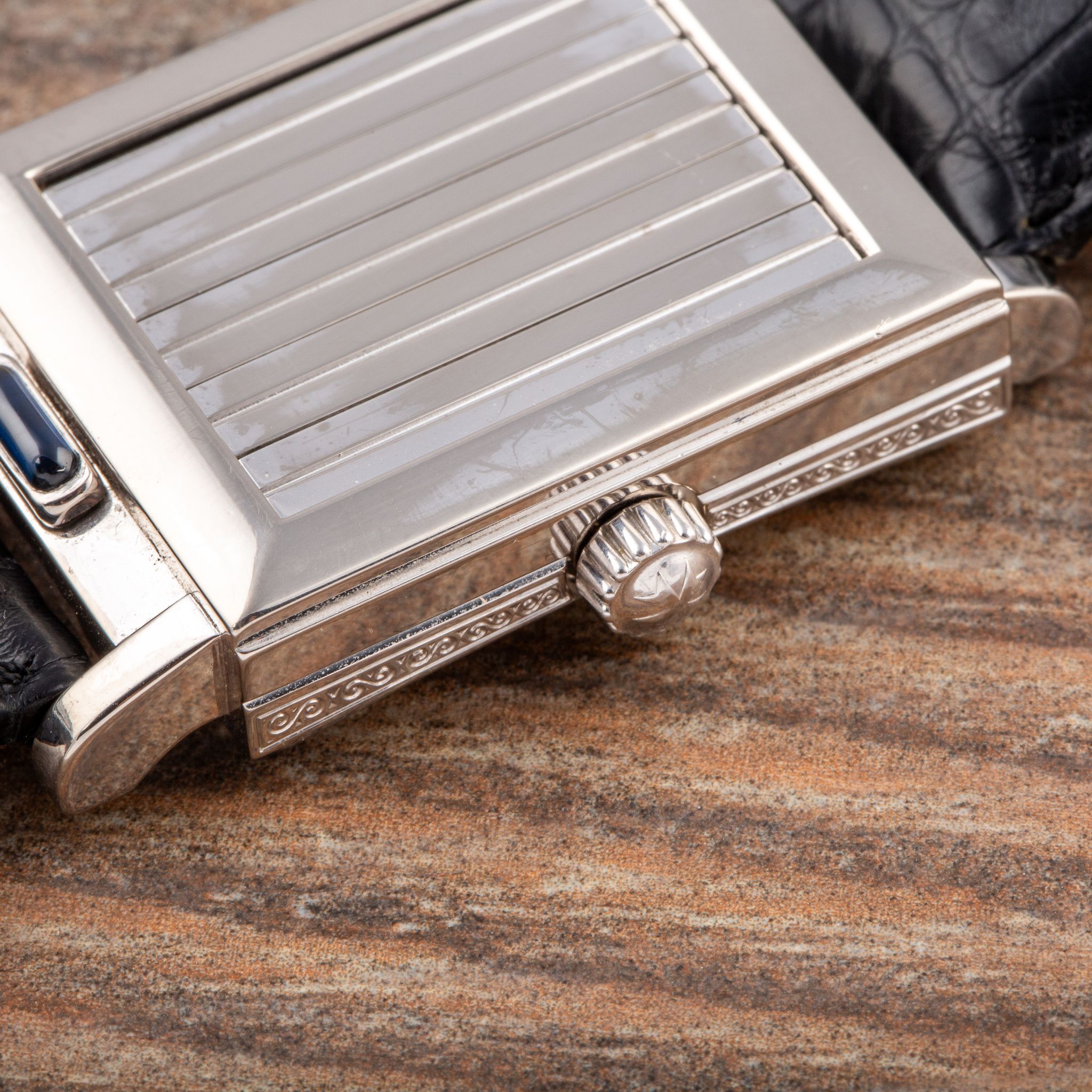 This Vacheron Constantin Jaulosie watch is an exceptionally rare model from the “Historique” line, produced by Vacheron Constantin in the 1990s. The Jaulosie was predominantly crafted in gold, with the white gold version, like the present specimen, being the rarest and produced in limited quantities. Its rectangular case is intricately adorned with decorative motifs on the sides. When the lever at 6 o’clock is not engaged, the watch is concealed by a complex mechanism resembling grates, which open upon pushing the lever and activating the mechanism. Beneath the cover lies a simple yet elegant timepiece with a silver dial and a subsidiary dial at 6 o’clock, adorned with blue steel hands. This mechanical, manual-winding watch is based on a JLC caliber, a characteristic occasionally found in Vacheron Constantin timepieces. In terms of condition, the watch is exceptionally well-preserved, showing minimal signs of handling on the case. The original leather strap, accompanied by a matching Vacheron Constantin deployant clasp, adds to its allure. Undoubtedly, this is a truly special and rare addition to any Vacheron Constantin-themed collection.