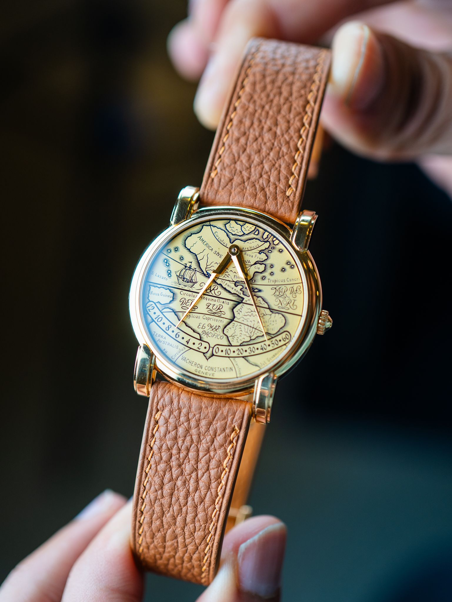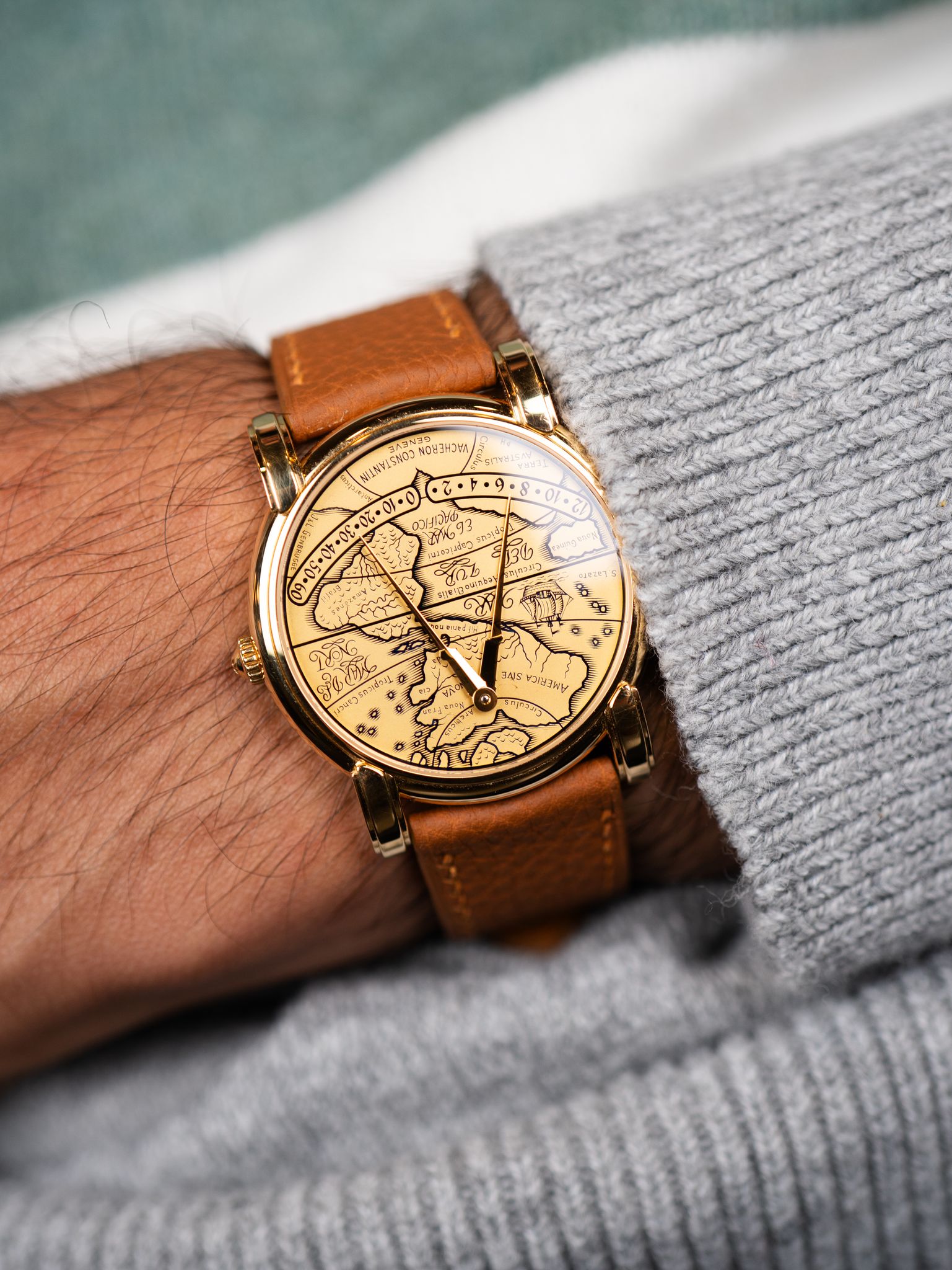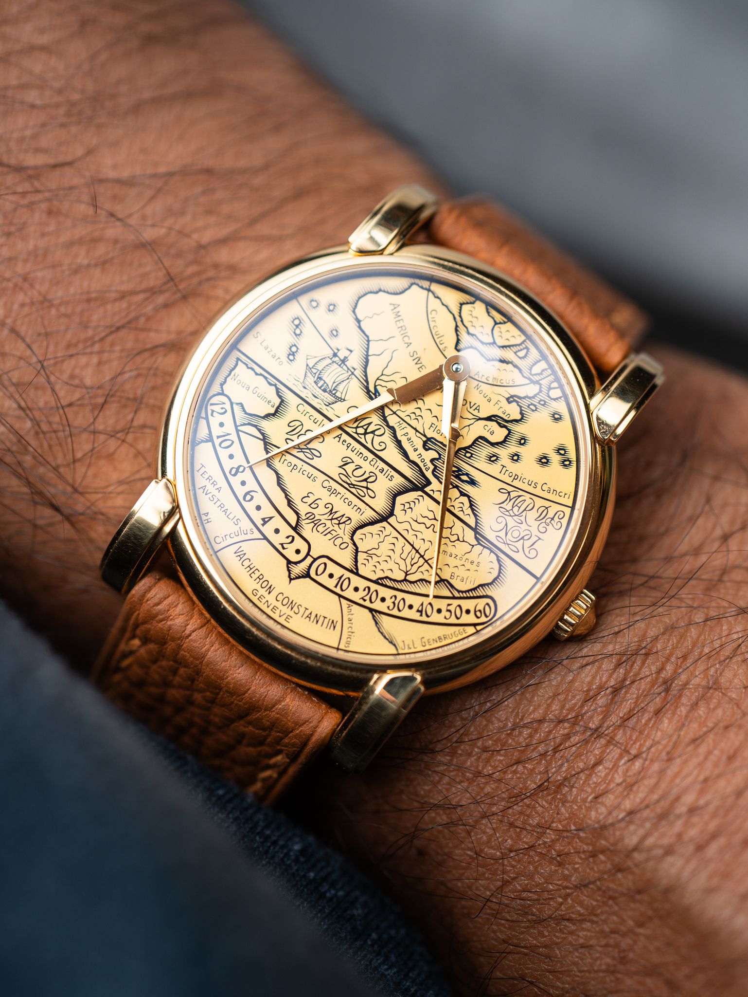 Vacheron Constantin Mercator ref.43050 in YG. This watch was introduced first in 1994 for the 400th anniversary of Gerardus Mercator, the inventor of map projection! This example features the map of americas, although there are many other variations of the dial! The dials on this watch are hand engraved and filled with black enamel, the dial maker’s initials are visible at 4o clock( jean and lucie genbrugge). VC produced 638 examples of this watch across various metals, dial variations over a span of 10 years! It features the cal 1120 based on JLC 920 ebauche and the watch wears delightfully well at 36mm!