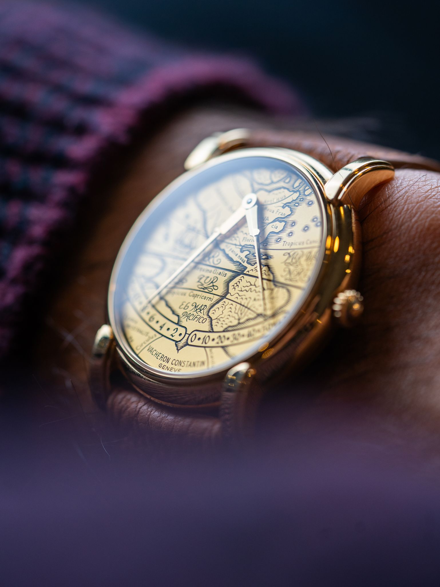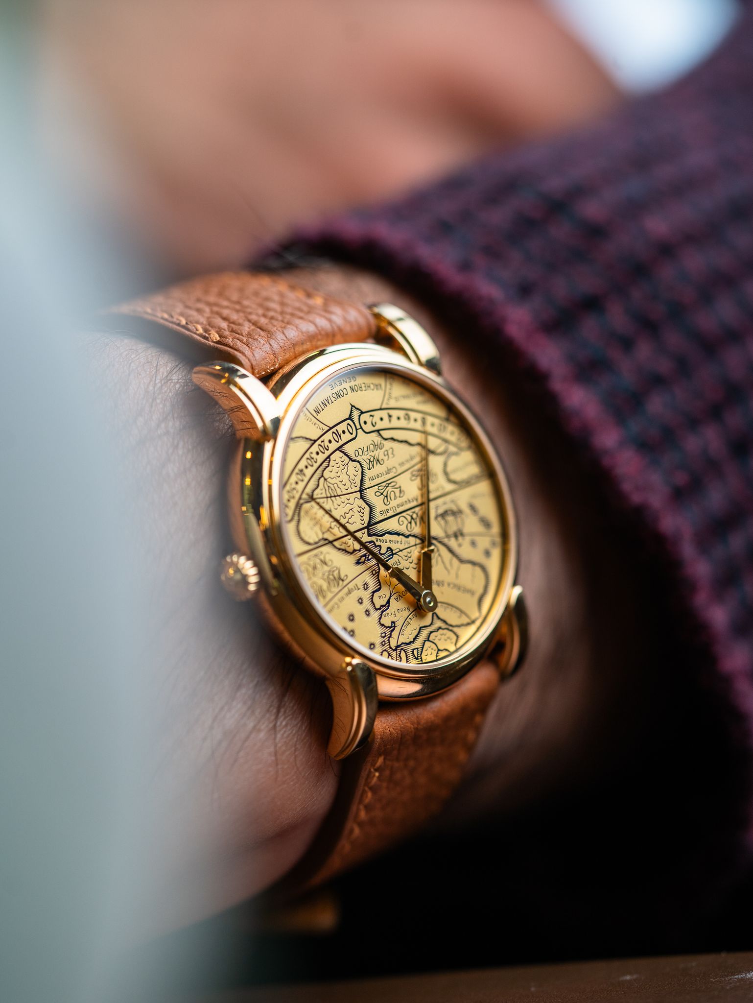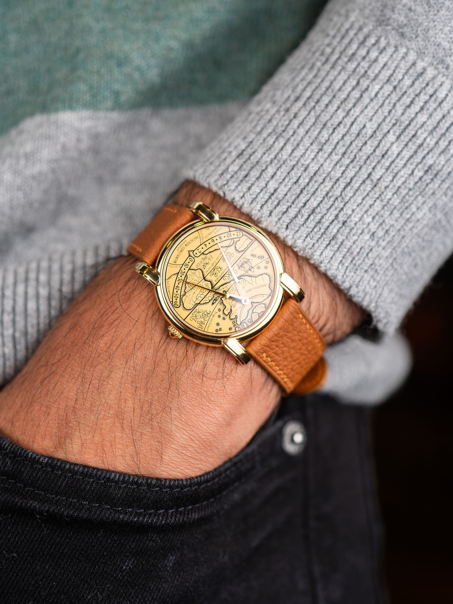 Vacheron Constantin Mercator ref.43050 in YG. This watch was introduced first in 1994 for the 400th anniversary of Gerardus Mercator, the inventor of map projection! This example features the map of americas, although there are many other variations of the dial! The dials on this watch are hand engraved and filled with black enamel, the dial maker’s initials are visible at 4o clock( jean and lucie genbrugge). VC produced 638 examples of this watch across various metals, dial variations over a span of 10 years! It features the cal 1120 based on JLC 920 ebauche and the watch wears delightfully well at 36mm!