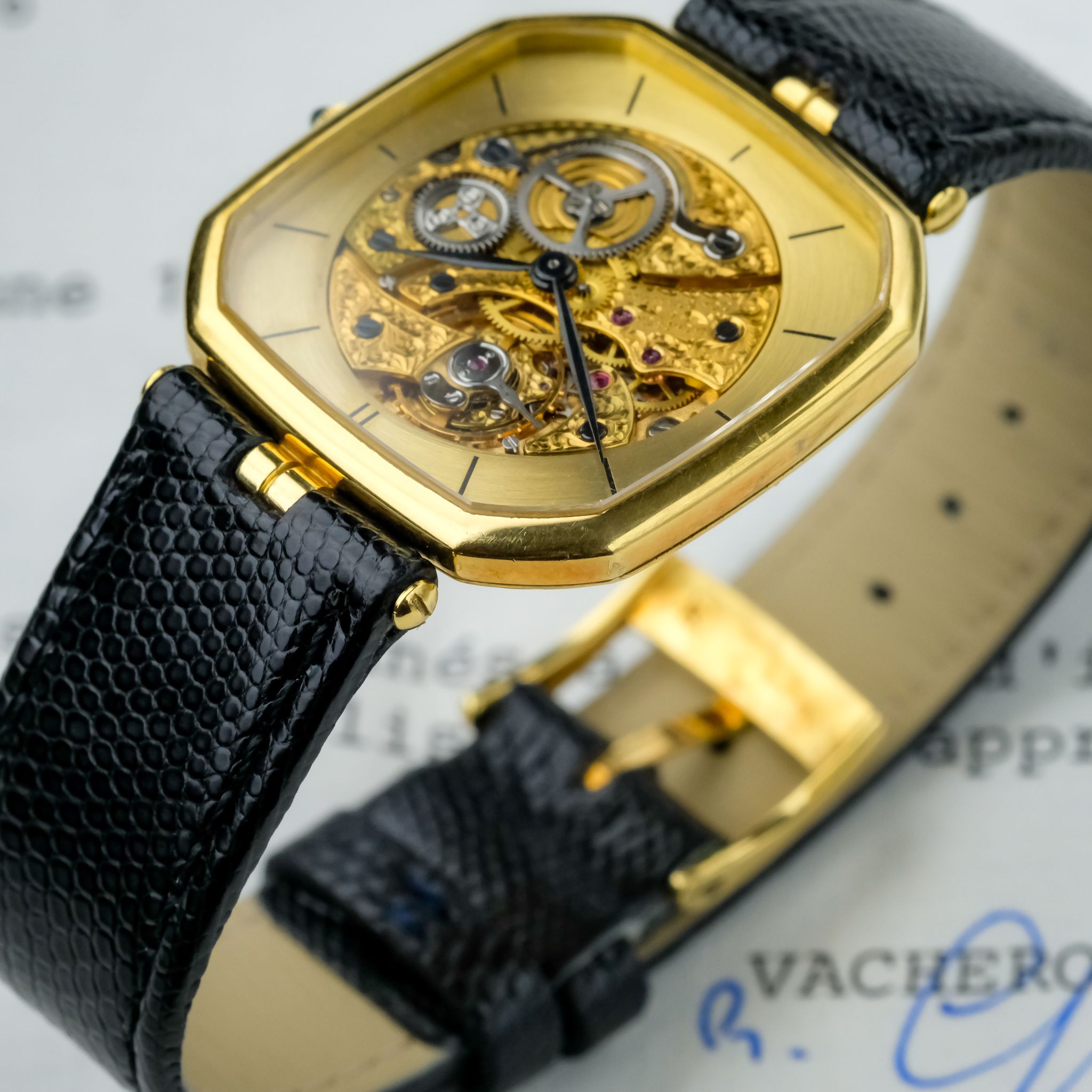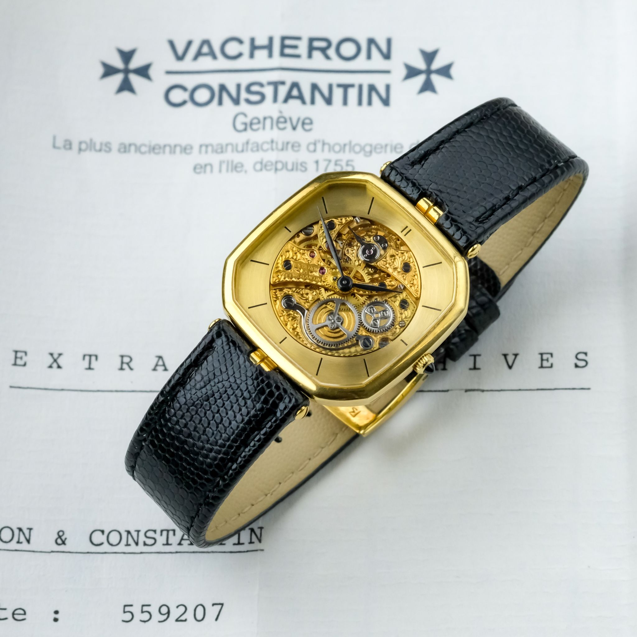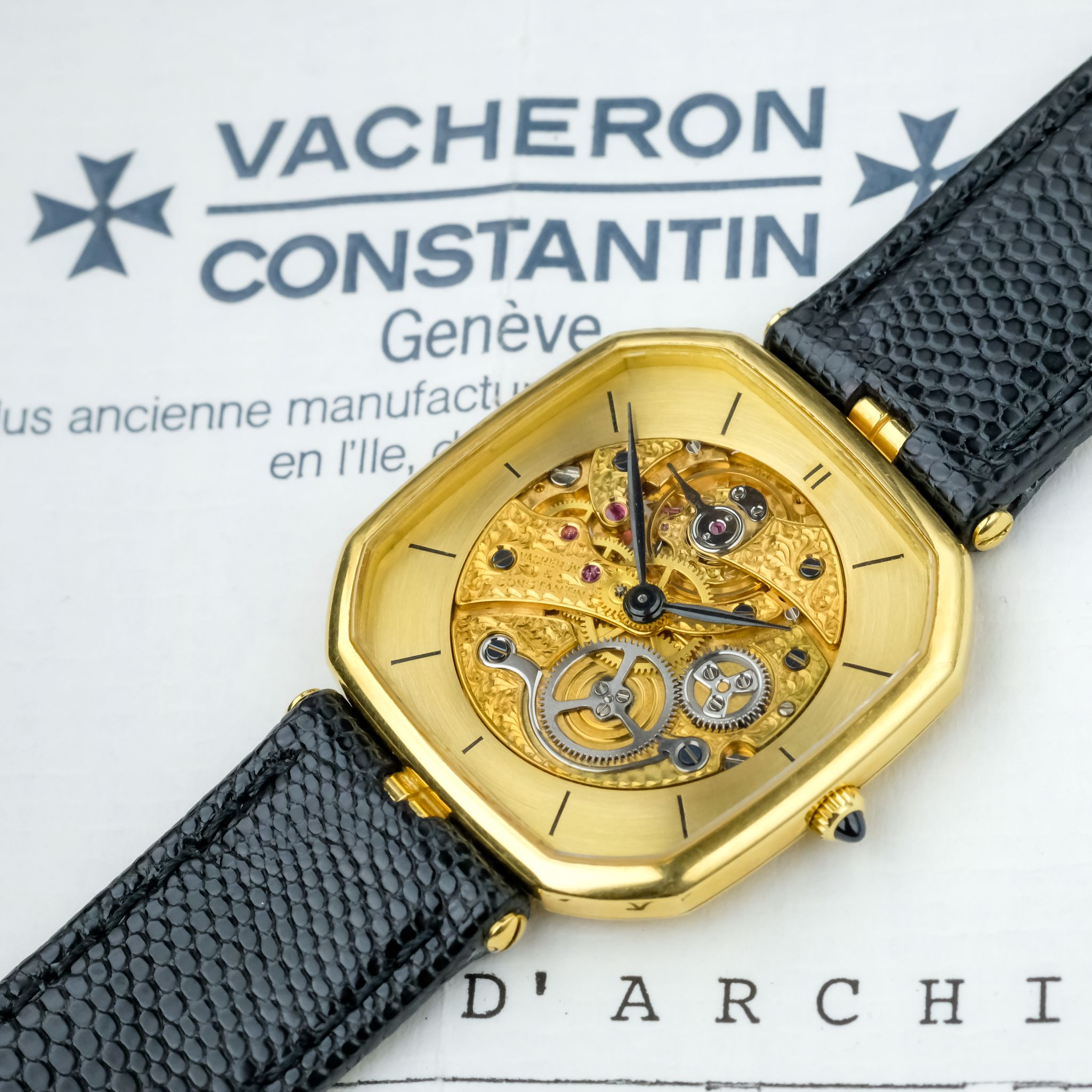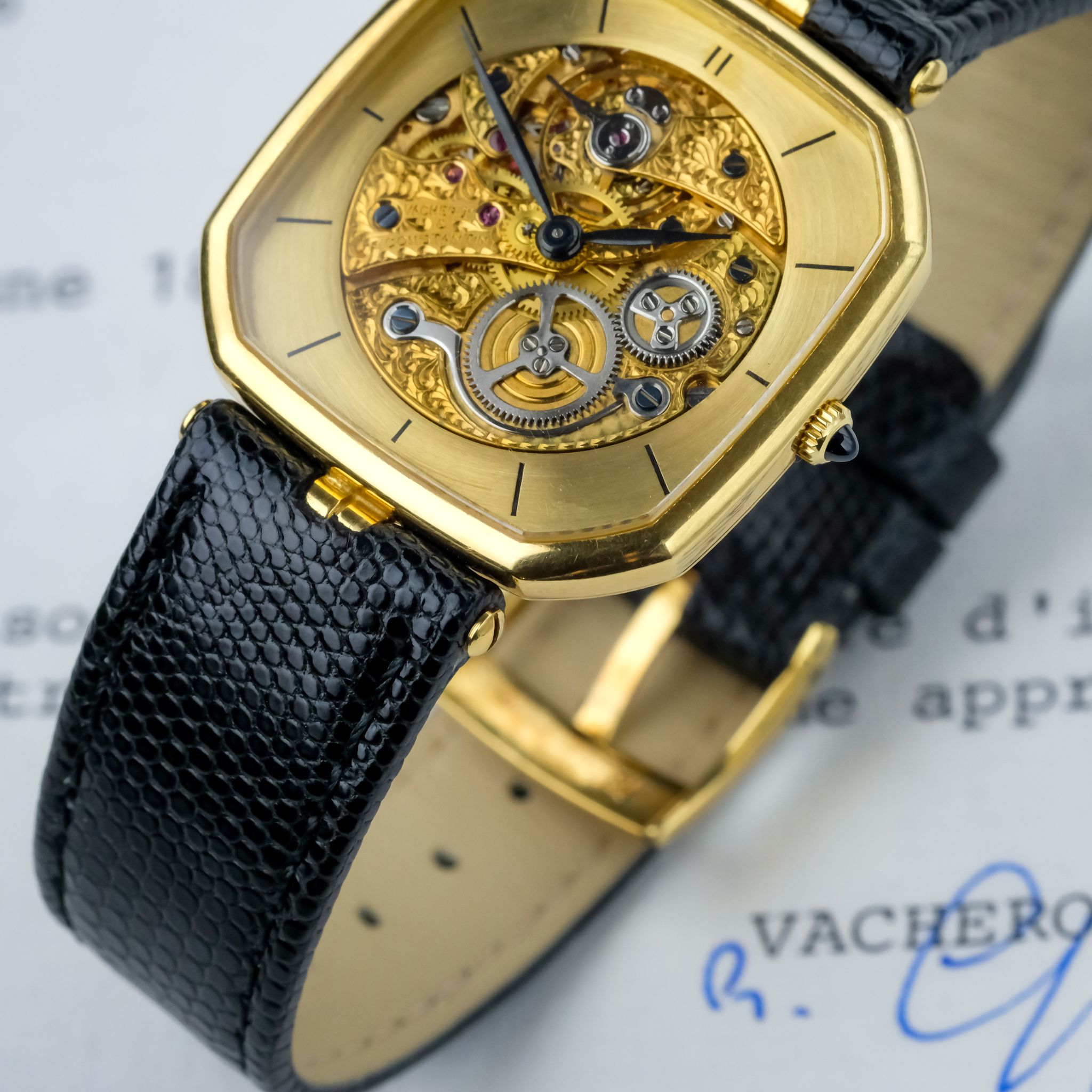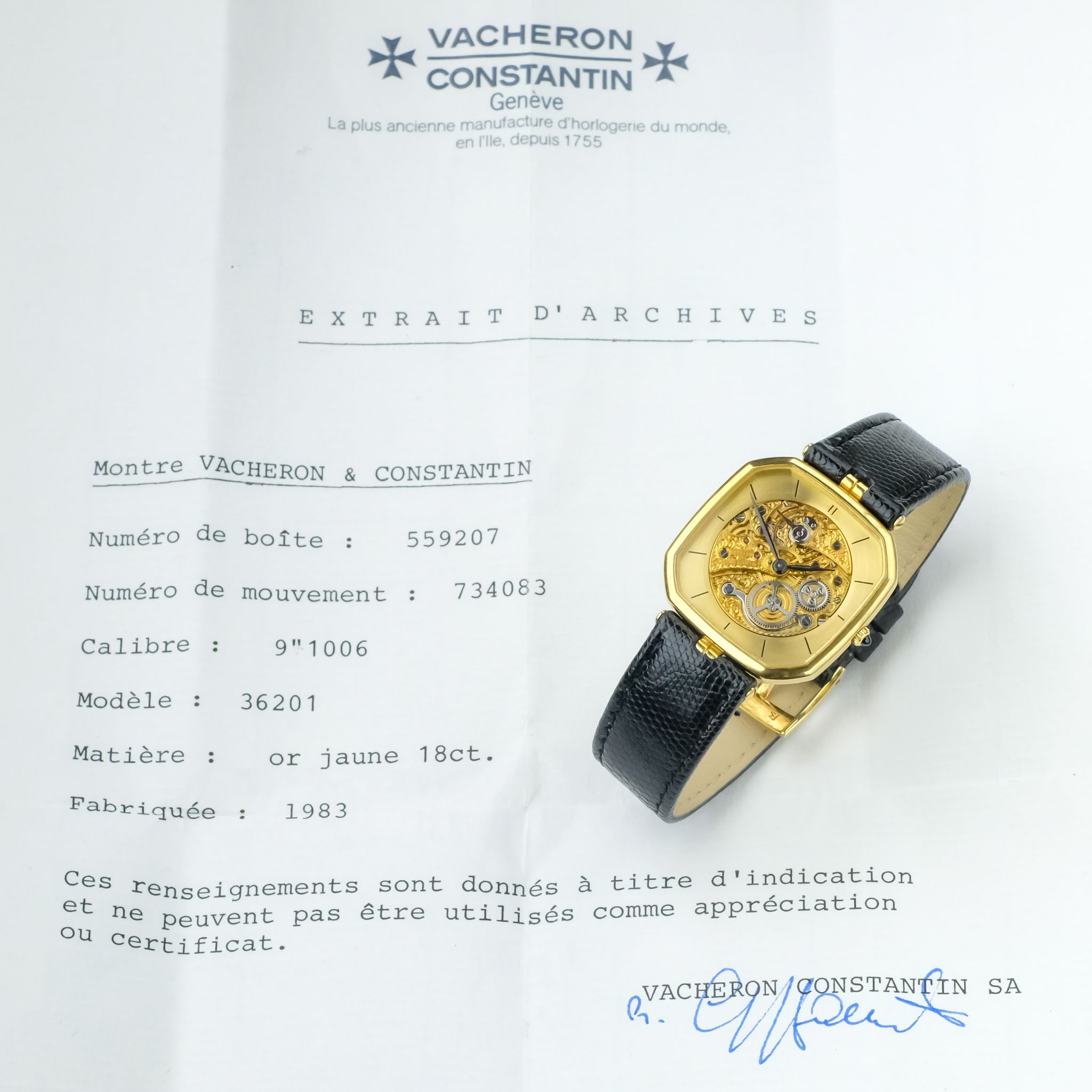 Very special Vacheron Constantin ref. 36201 with octagonal case in 750/ yellow gold and the impressive flipped movement cal. 1006 as "dial".. beautifully engraved by hand, watch from 1983, accompanied by an extract of the archives from 1988.
