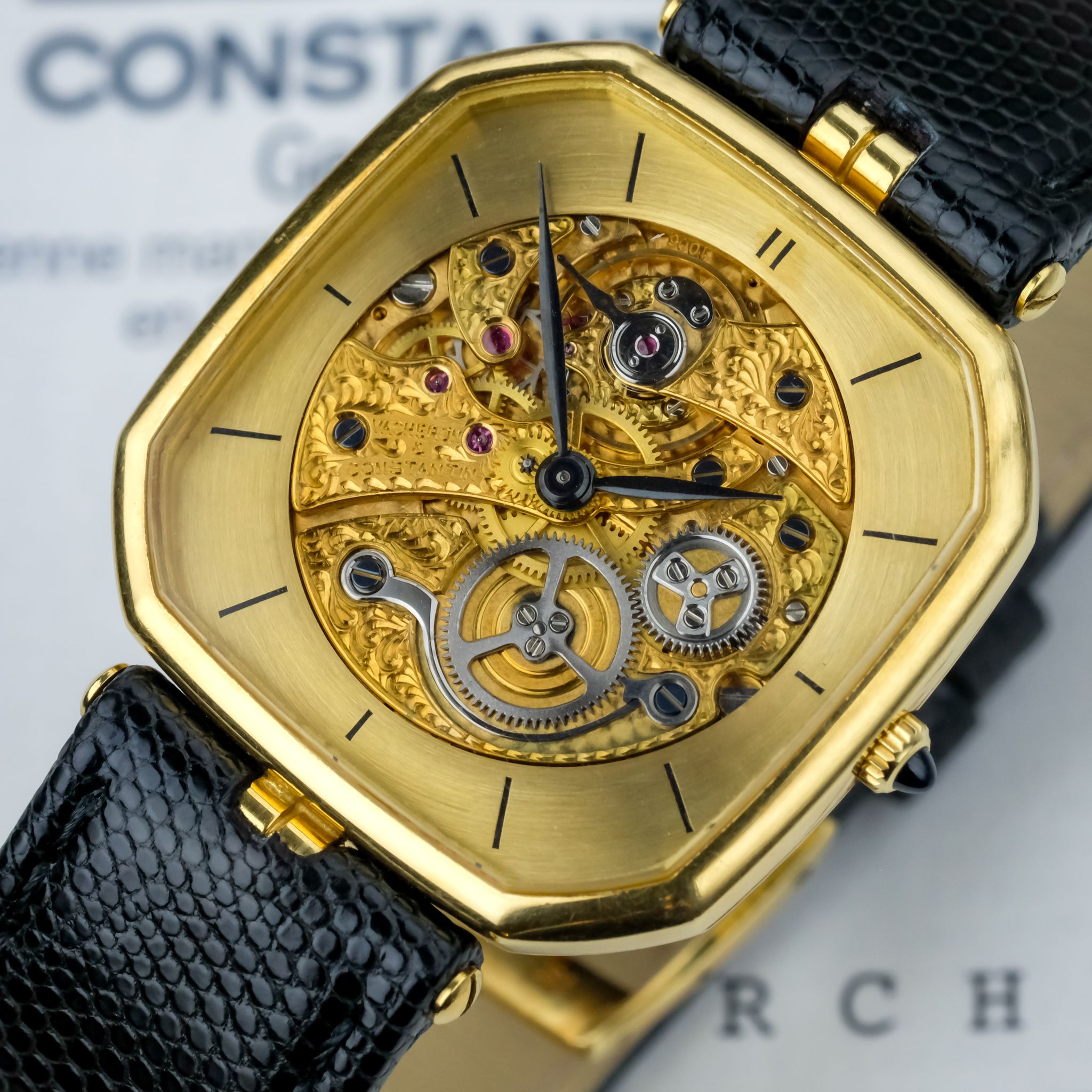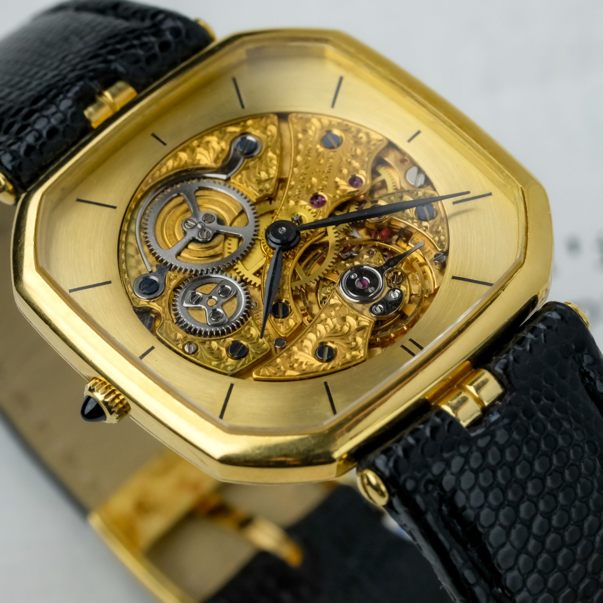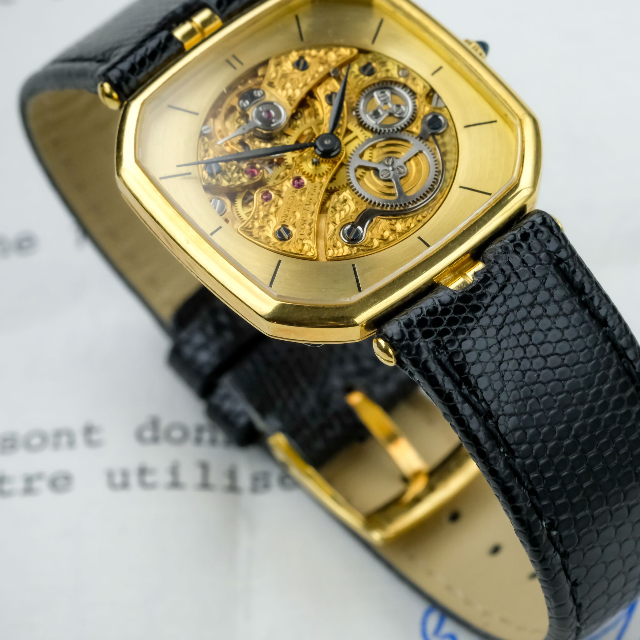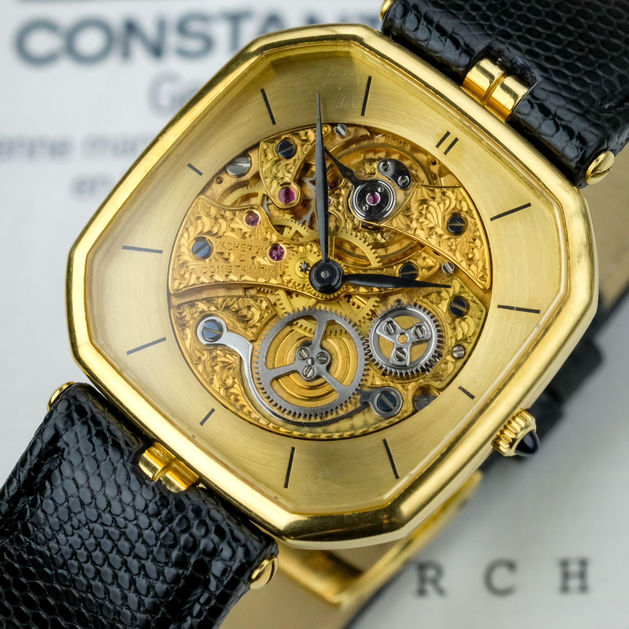 Very special Vacheron Constantin ref. 36201 with octagonal case in 750/ yellow gold and the impressive flipped movement cal. 1006 as "dial".. beautifully engraved by hand, watch from 1983, accompanied by an extract of the archives from 1988.
