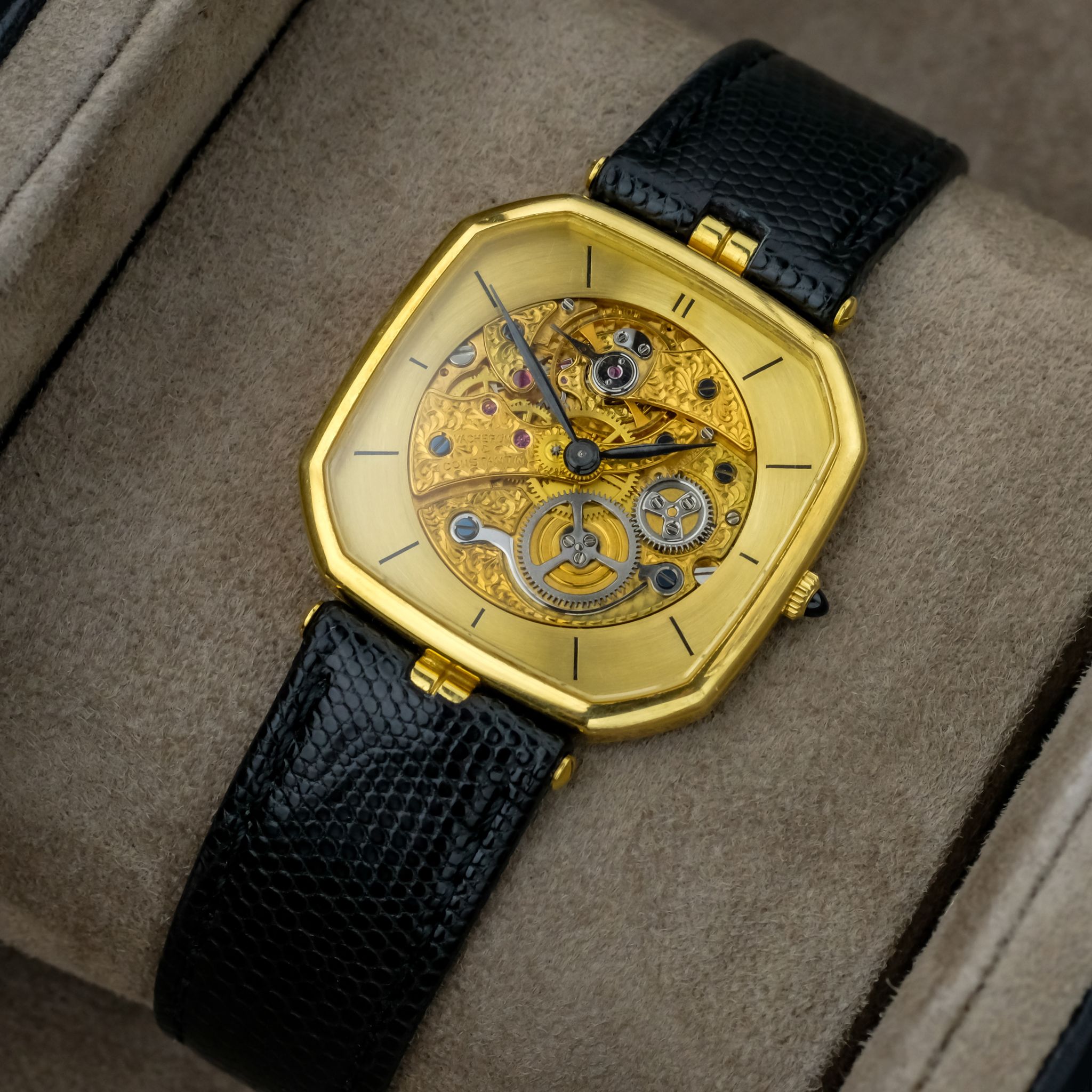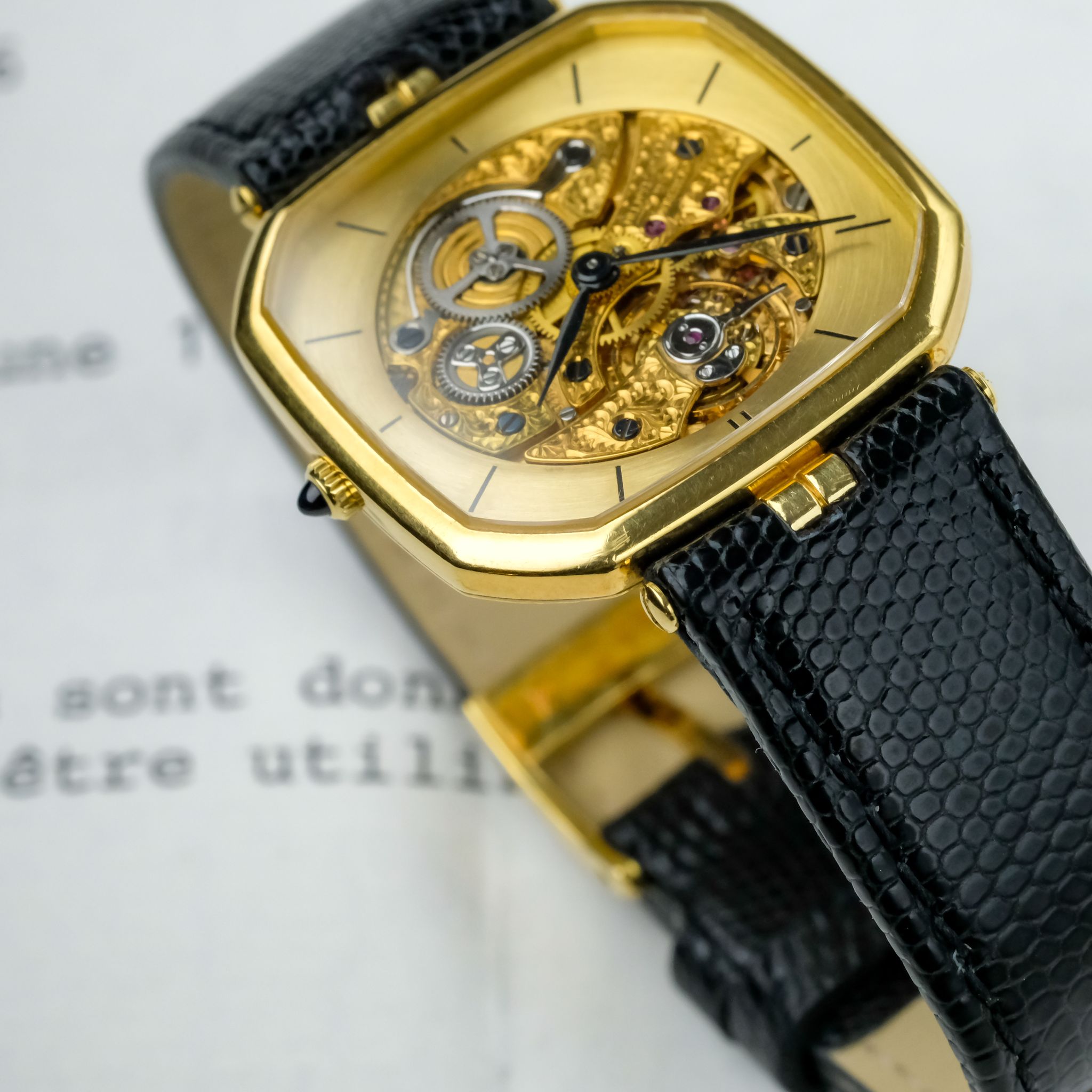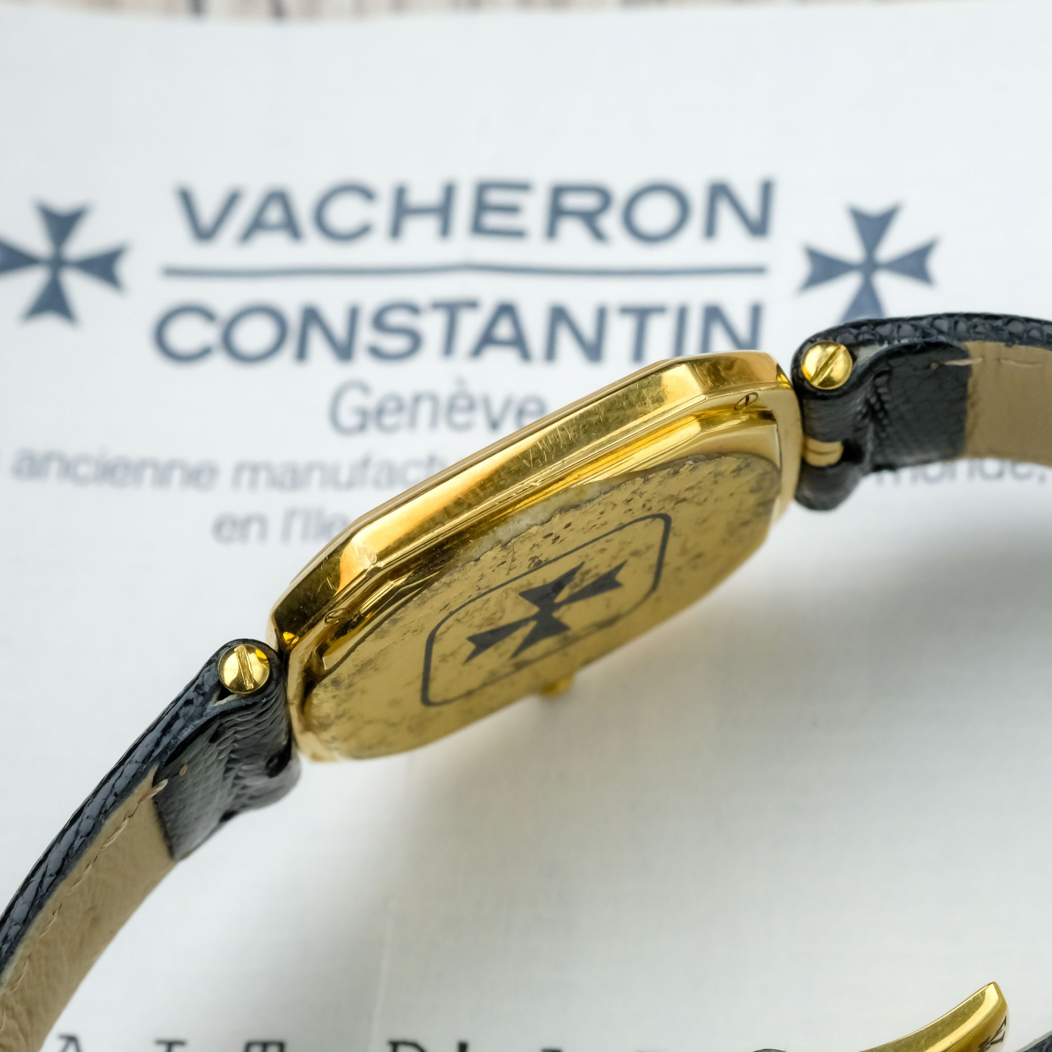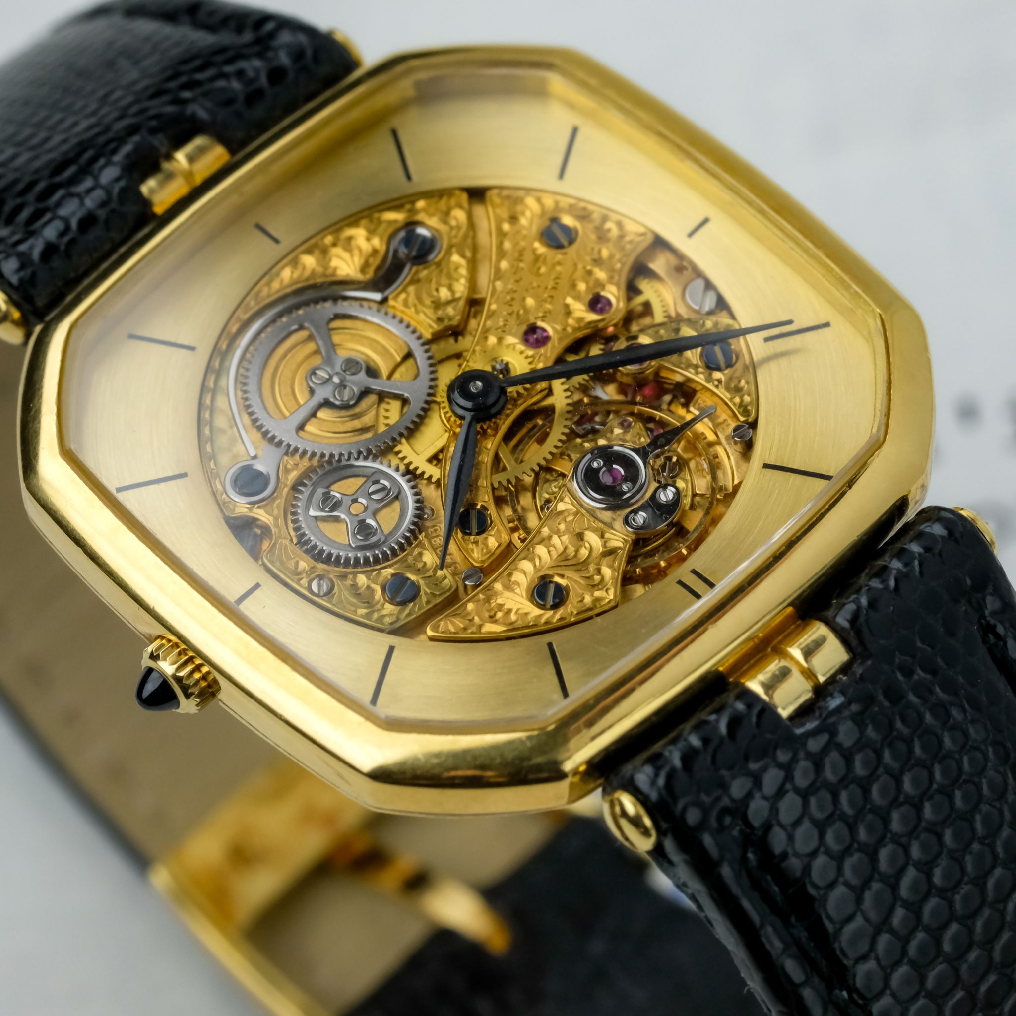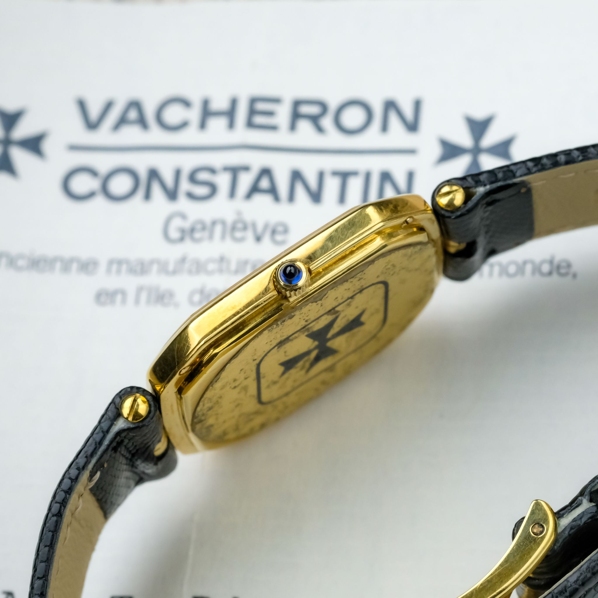 Very special Vacheron Constantin ref. 36201 with octagonal case in 750/ yellow gold and the impressive flipped movement cal. 1006 as "dial".. beautifully engraved by hand, watch from 1983, accompanied by an extract of the archives from 1988.