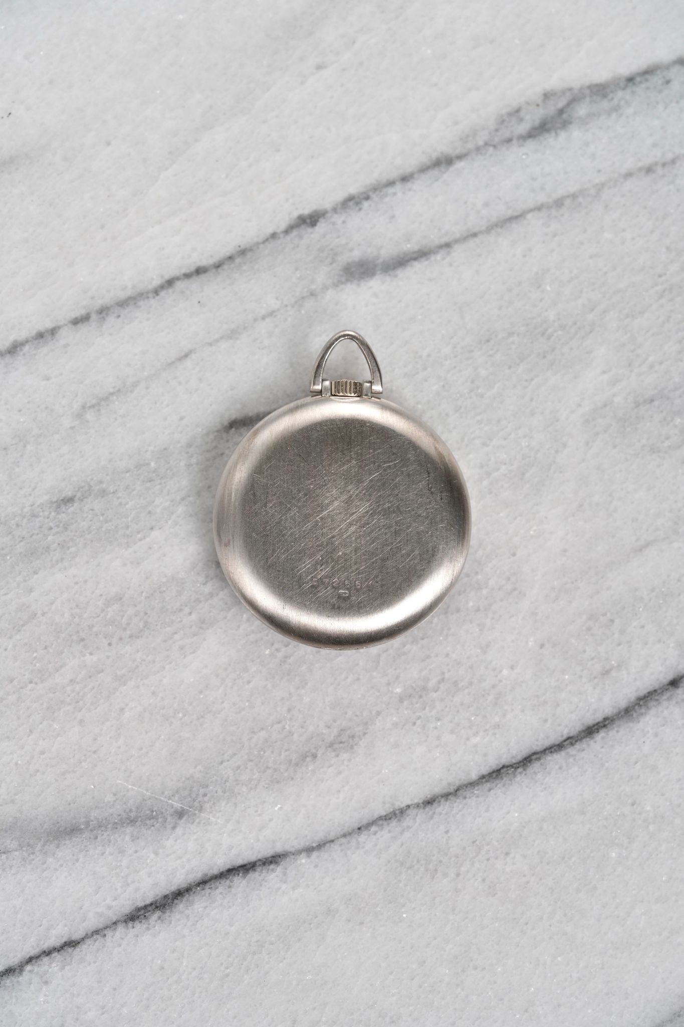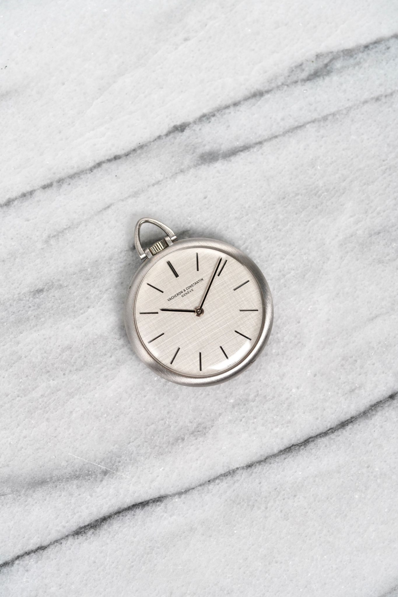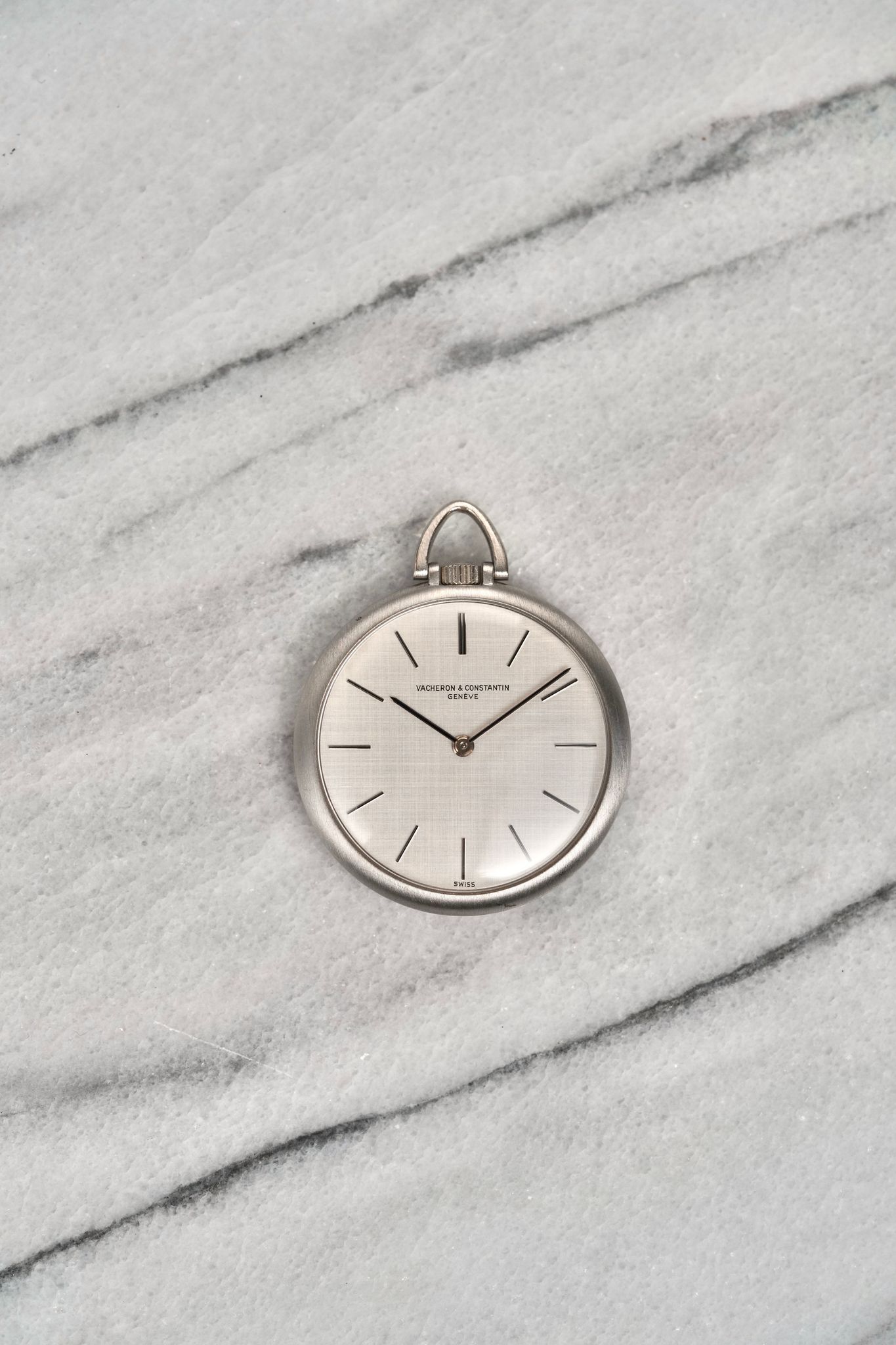 Here’s a Vacheron Constantin pocket watch manual wind in 18K white gold with a silver linen dial from the 1970s. Measurements include a 33mm case. Matching stick hands and hour markers. 26.4 grams. In honest condition Original case, dial, bracelet, and movement. Fully functional and keeping time.