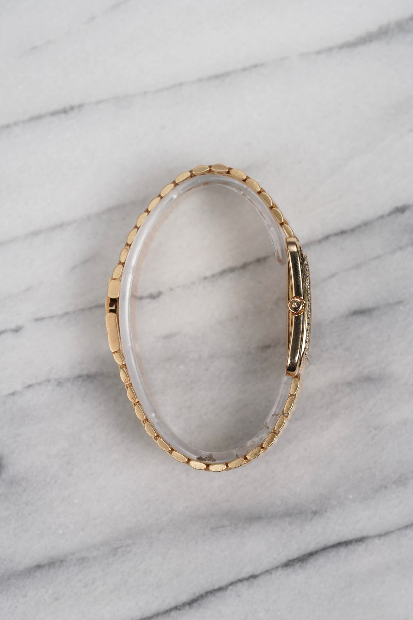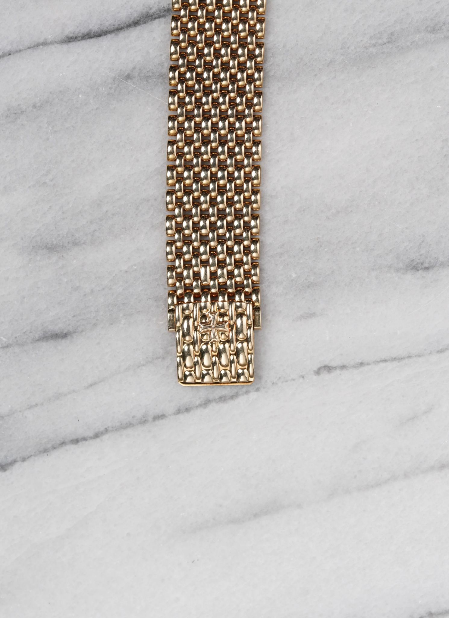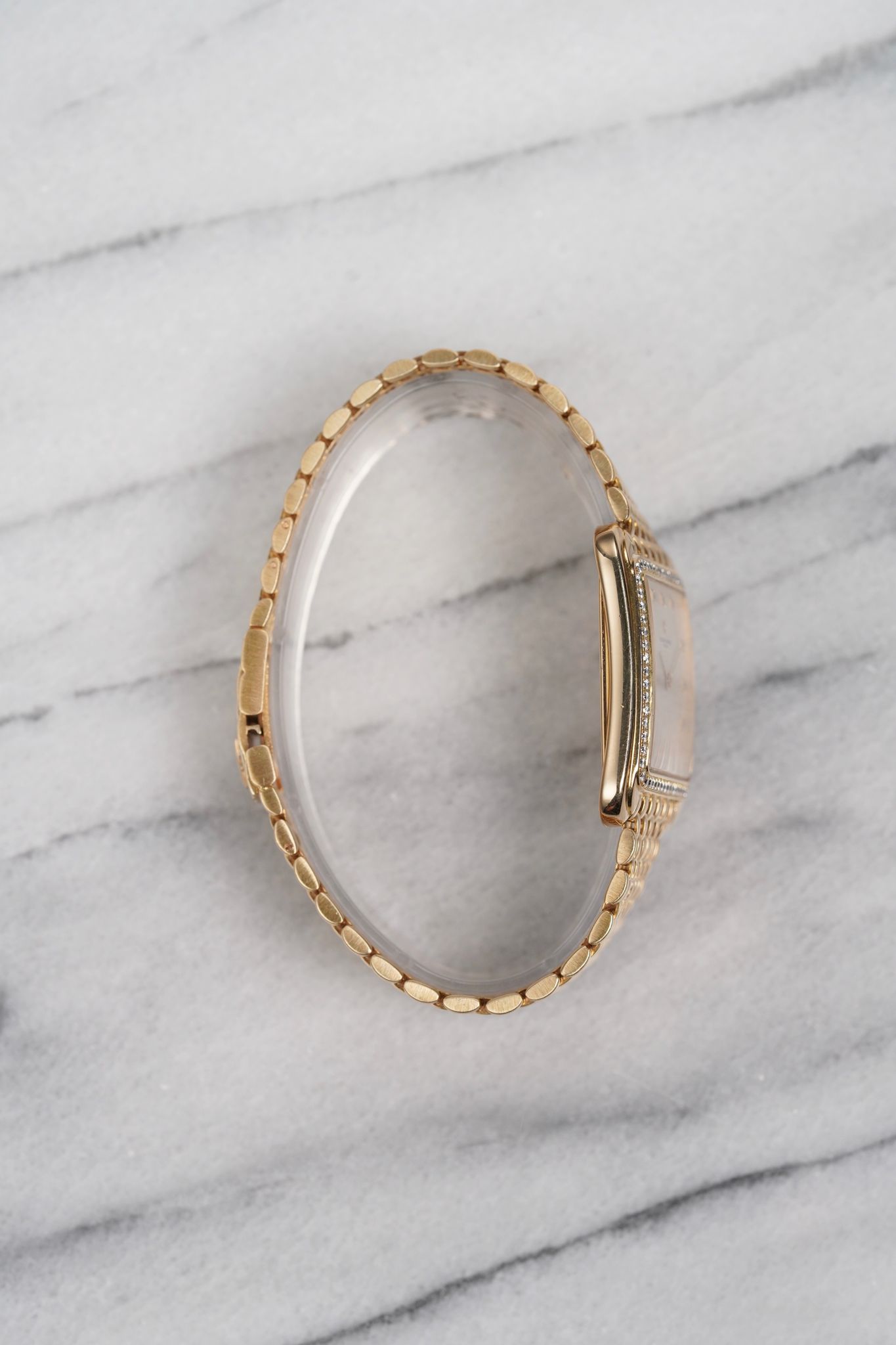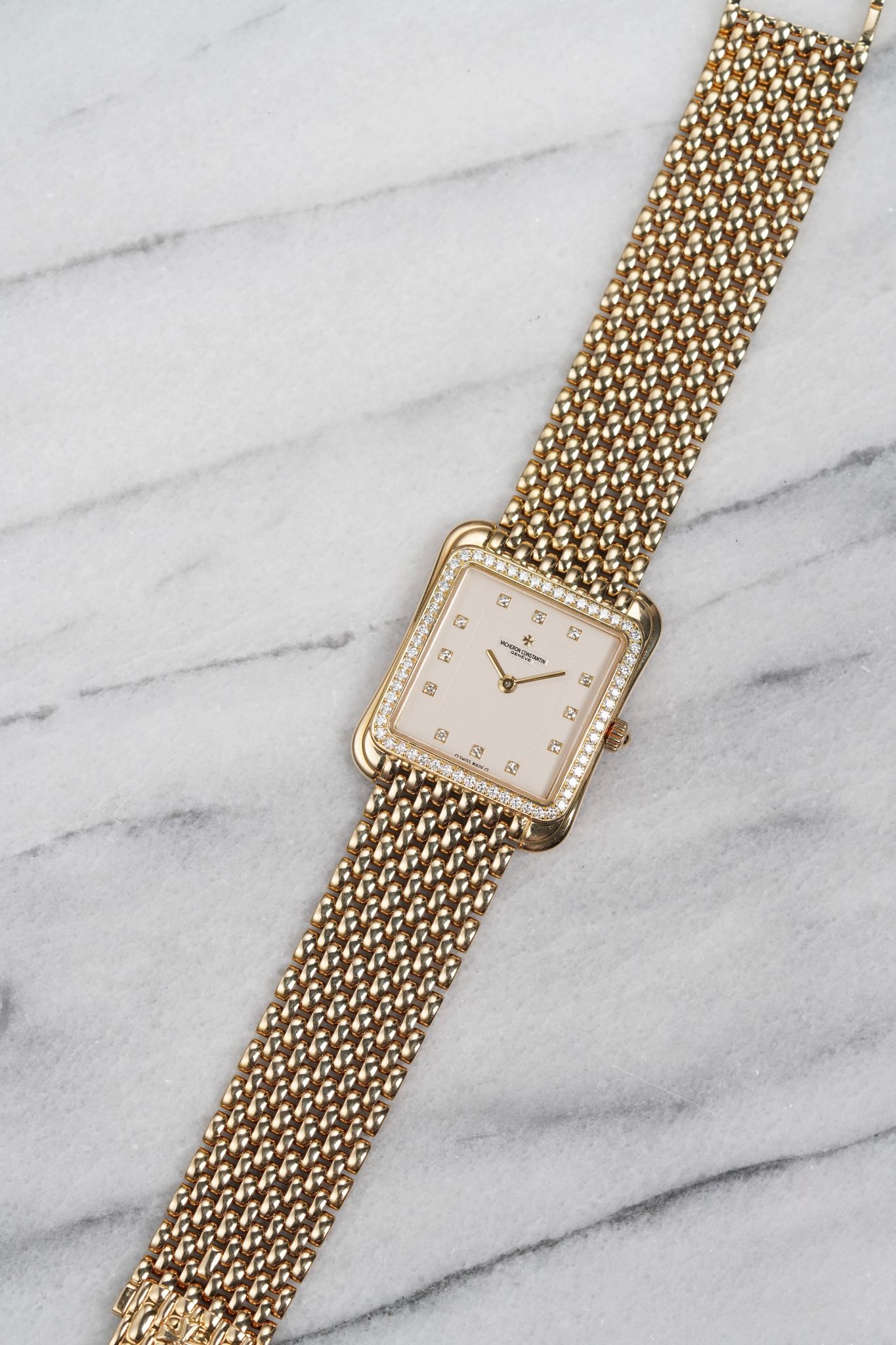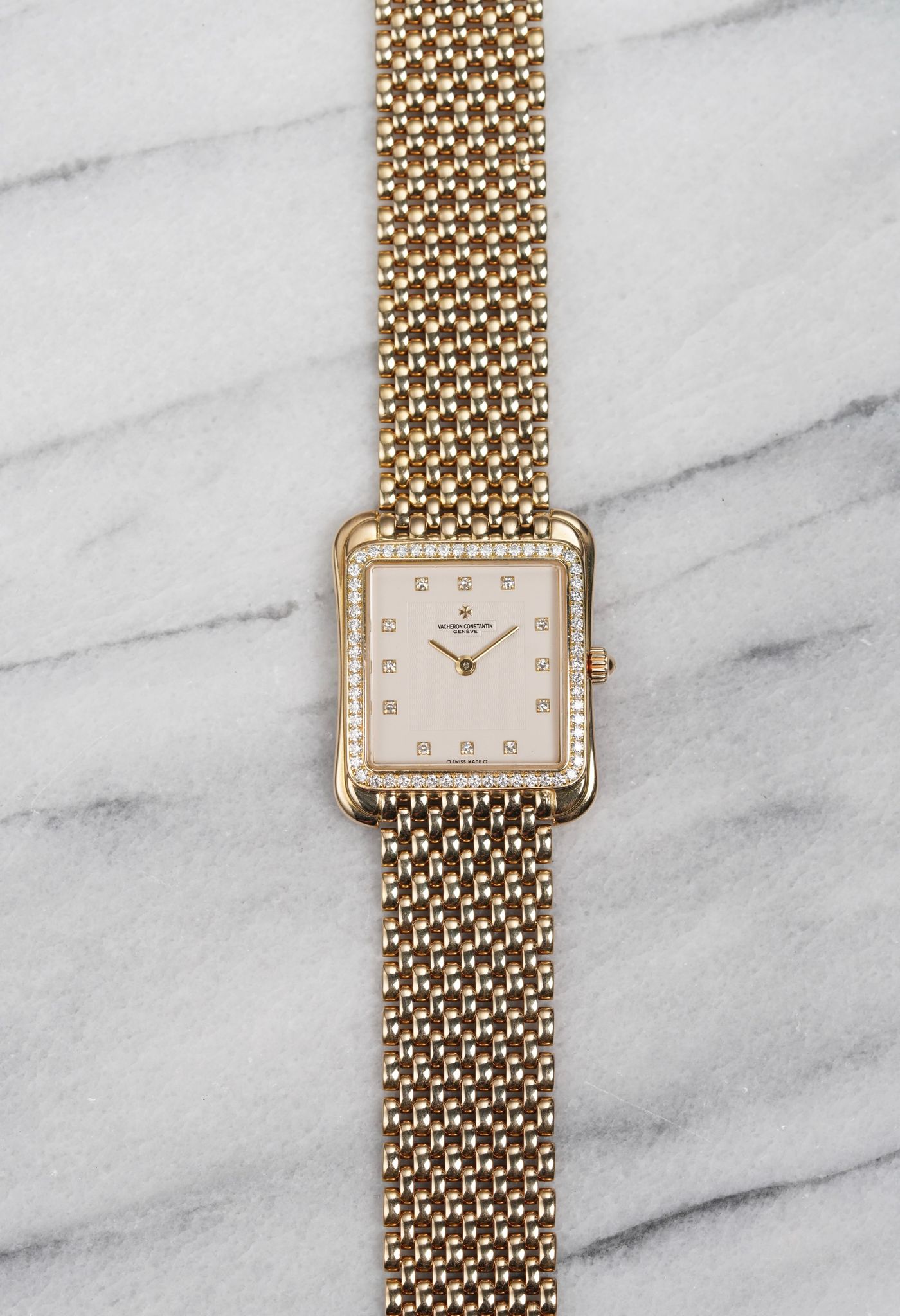 Here’s a Vacheron Constantin Toledo in 18k yellow gold with a factory diamond bezel and white dial from the 1990s. Measurements include a 30mm case and a bracelet that fits up to a 7.25 inch wrist. Slim and elegant profile. Weighs 79.9 grams. Beaded mesh bracelet that is quite comfortable on the wrist. Unisex example that can be worn by both men and women. Original case, dial, and movement.