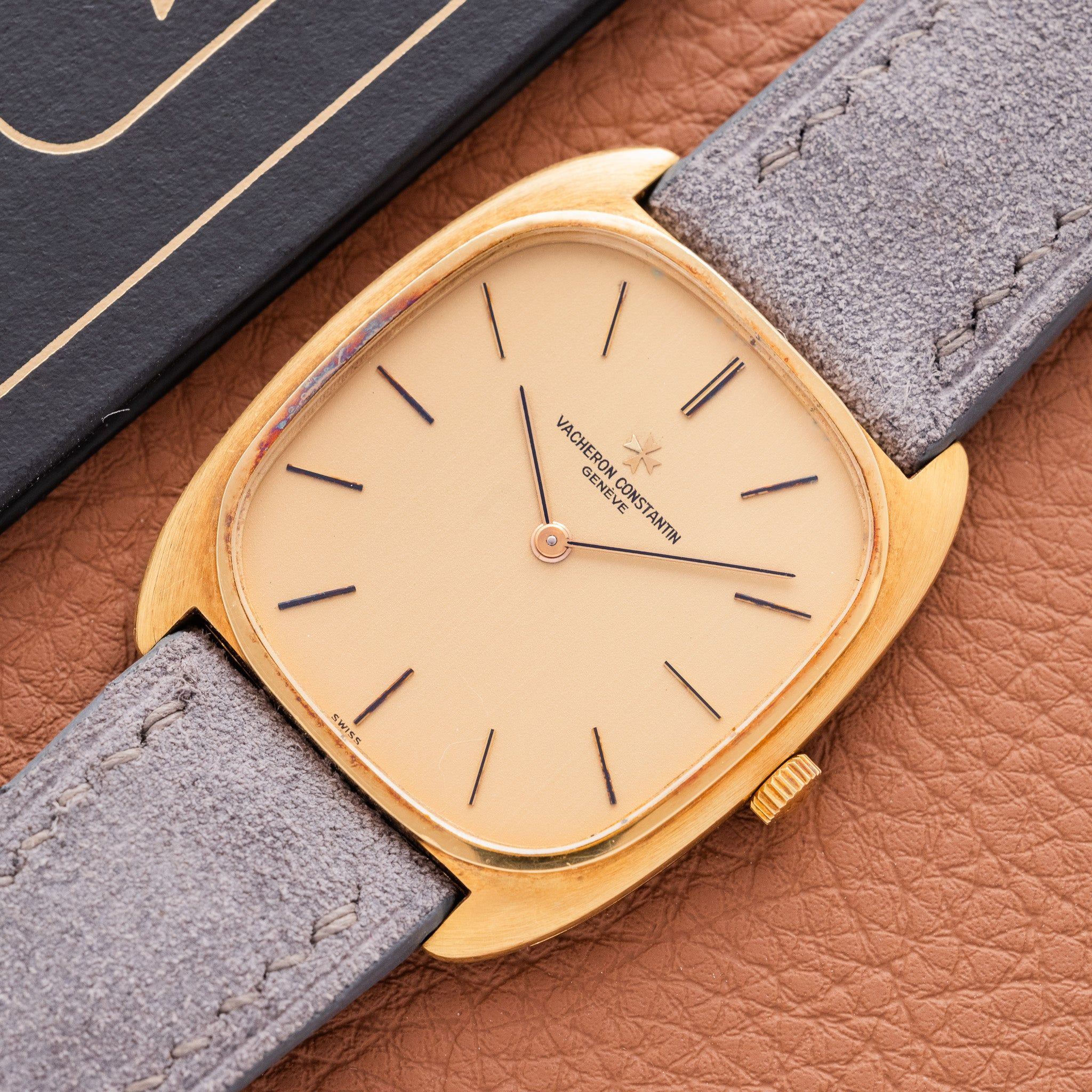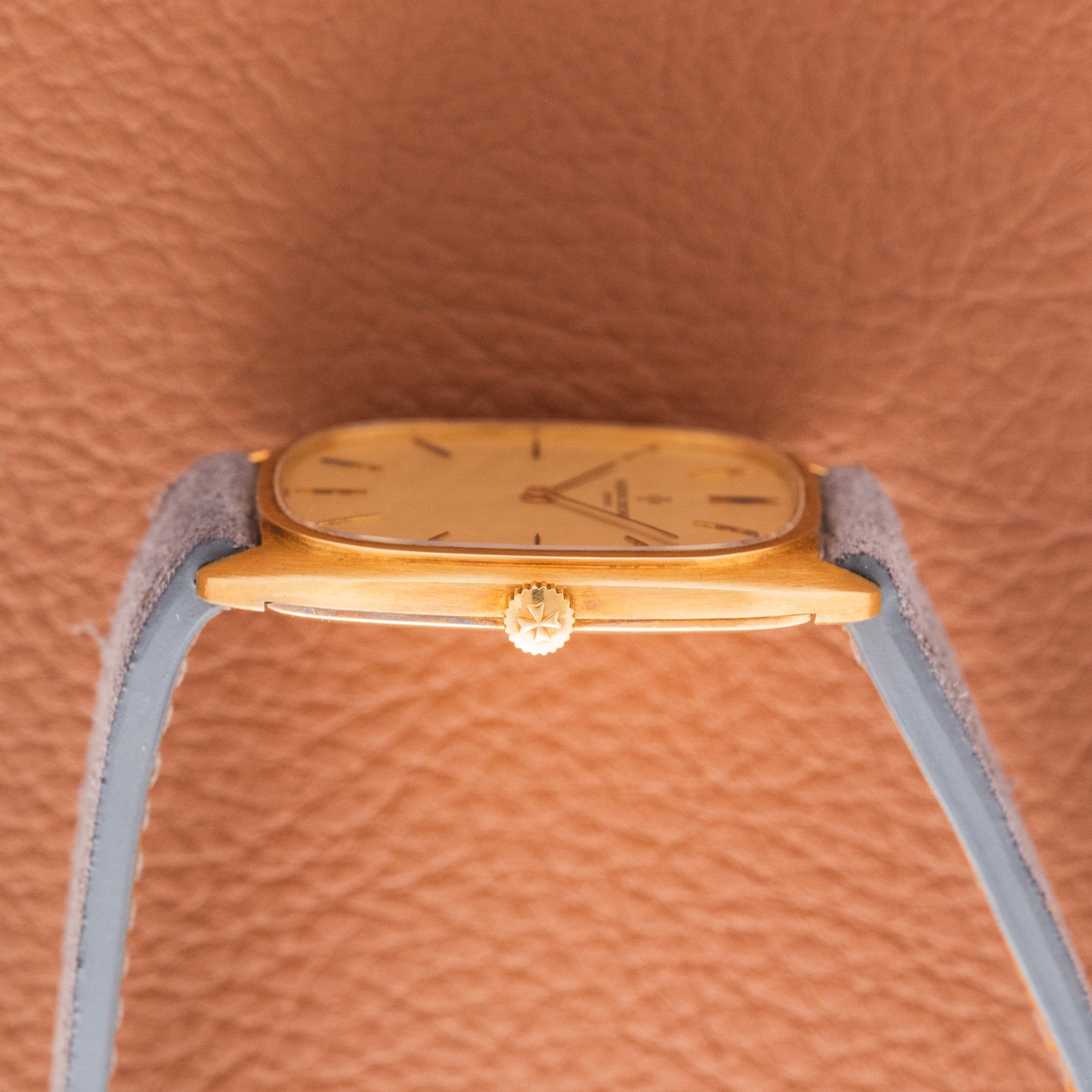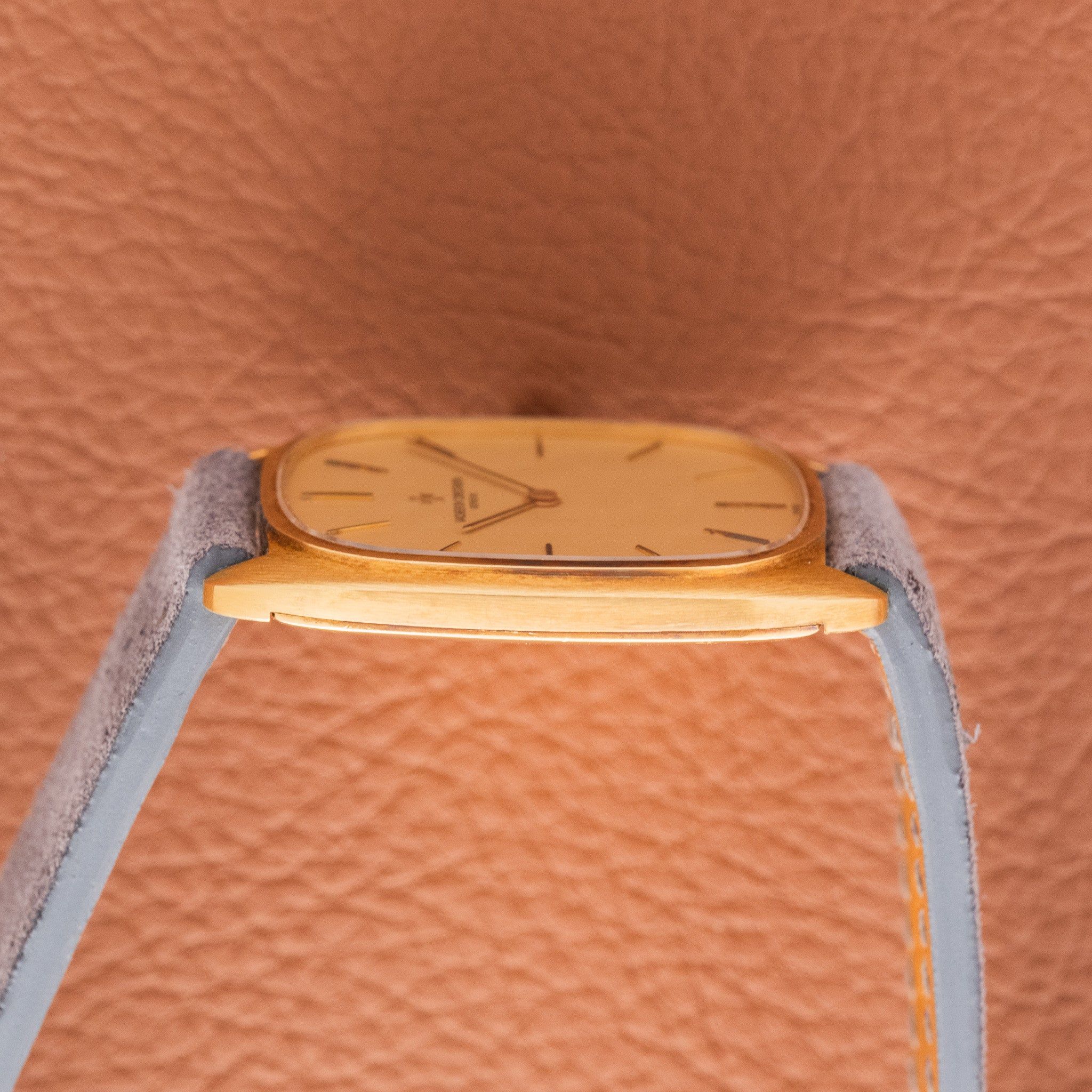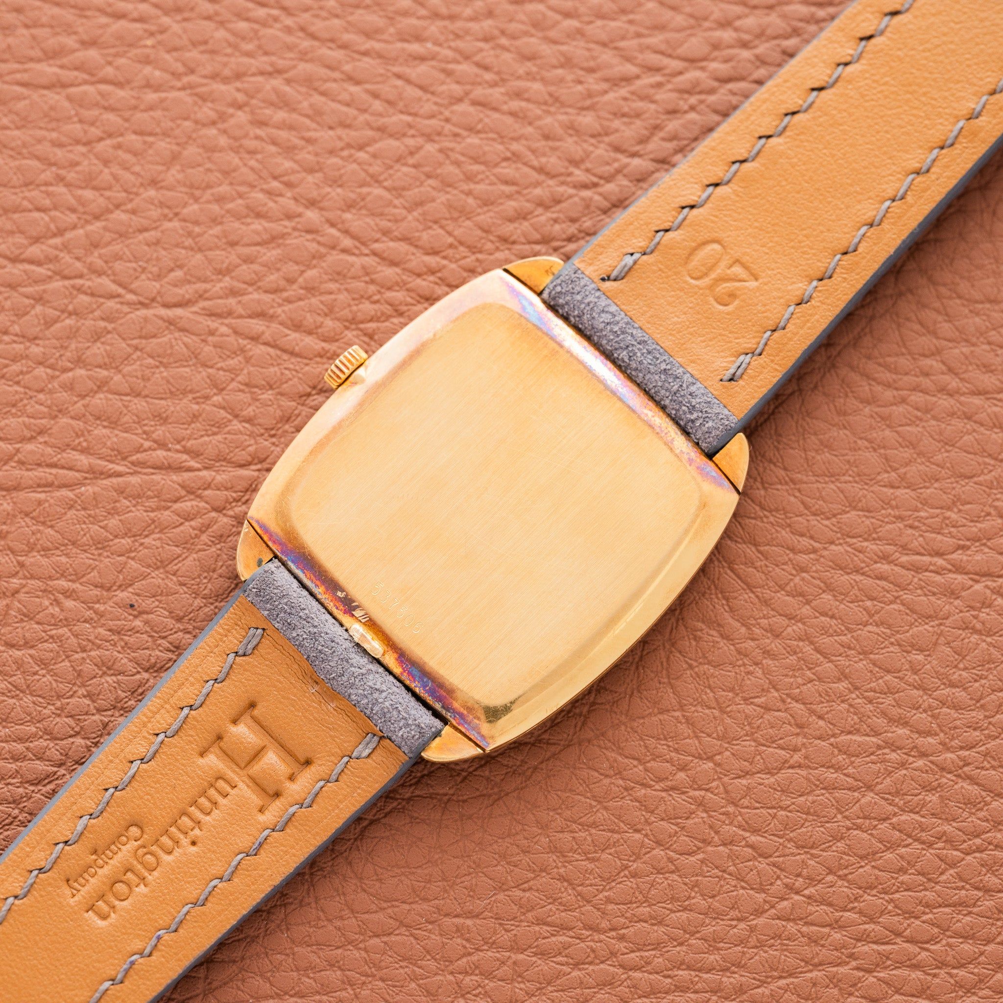 Case: The case is unpolished with its orignal brushed finish. It is constructed in 18k yellow gold and the size is 38 by 32 millimeters, but don't let that fool you. The Case wears very large thanks to the thin case and large dial. The watch also has a 20mm lug width, when most dress watches from the 70s were seen with 16-18mm lug width. The extra few millimeters make a big difference in the way this watch wears.