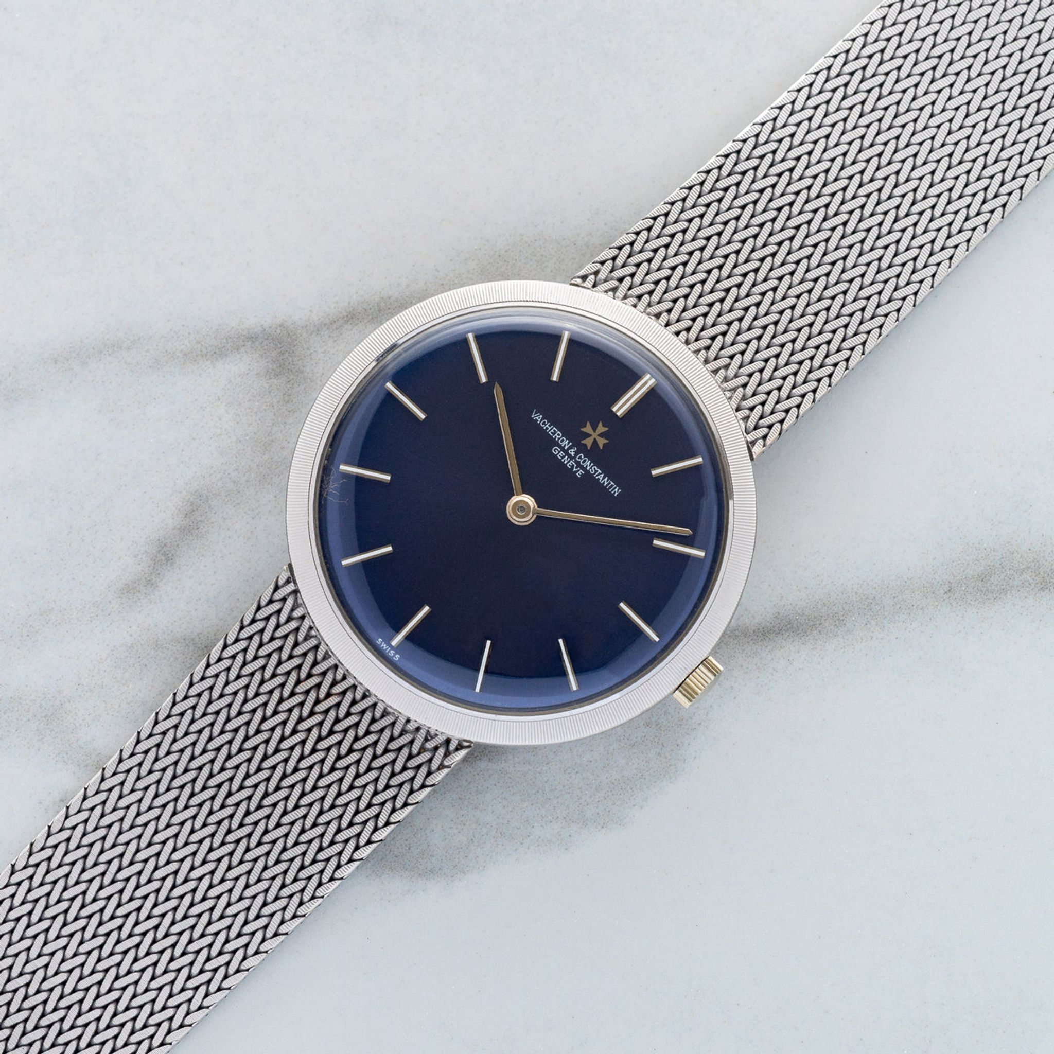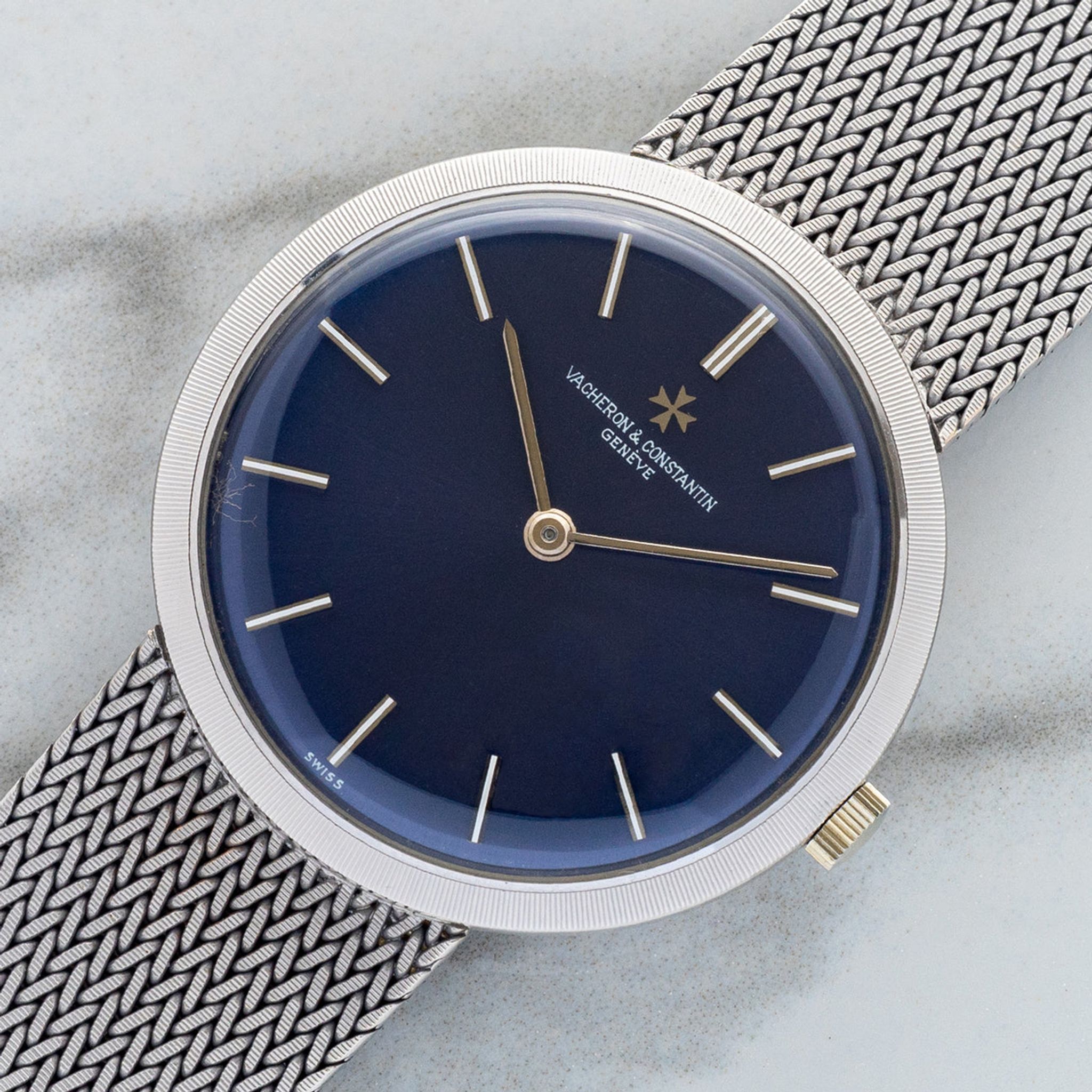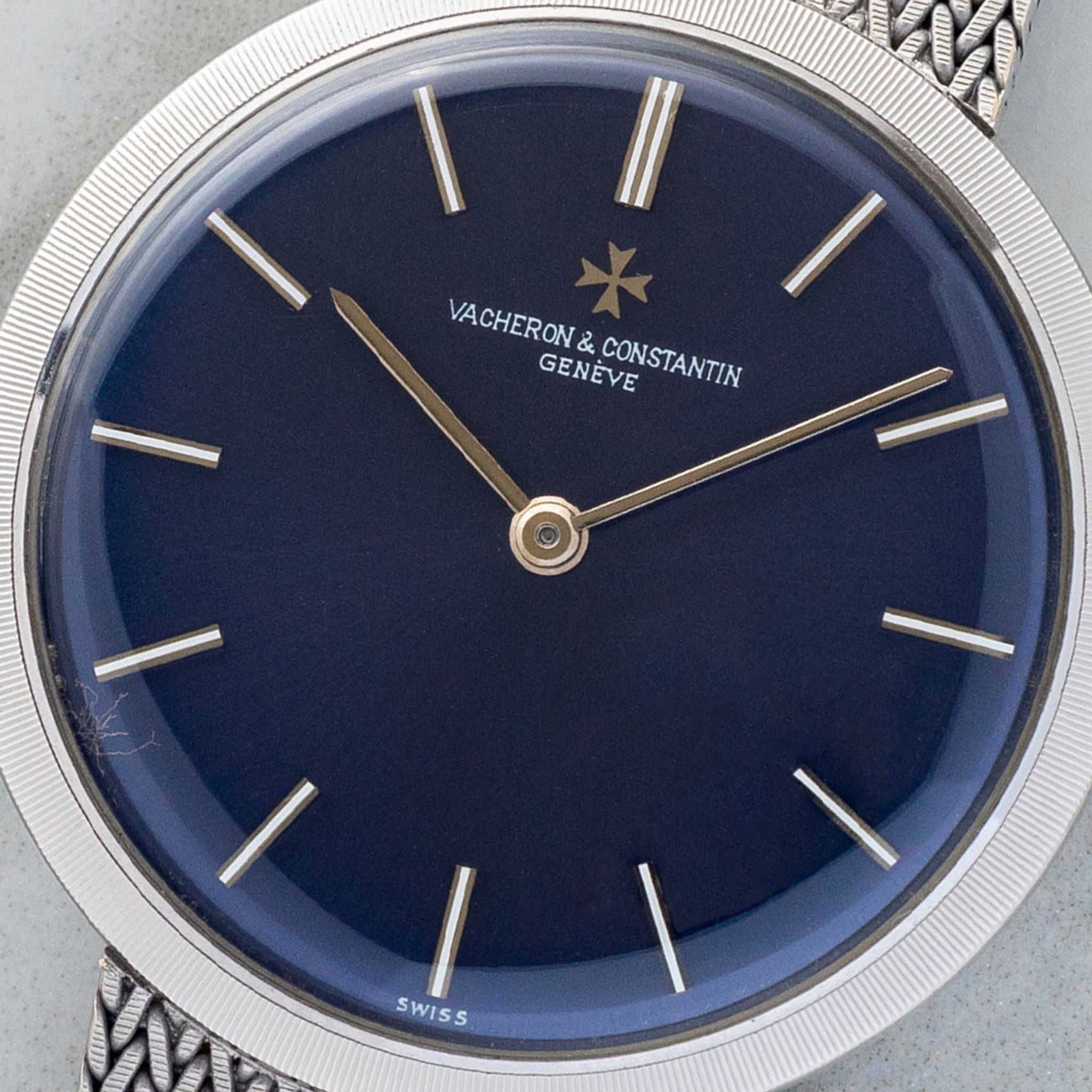 This particular piece piece is one of our favorite integrated bracelet watches we've come across to date. Housed in 18k white gold, it features a gorgeous blue dial in an elegant 32mm case. The mesh bracelet will fit an approximate 7 inch wrist, is comfortable and feels high quality as one would expect from the brand. For anyone looking for a slightly elevated watch in this style, this VC houses a high-grade K100/2 caliber and remains in excellent vintage condition.