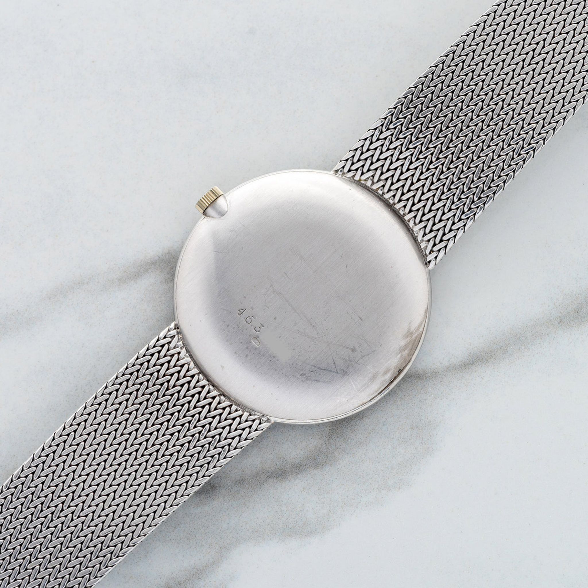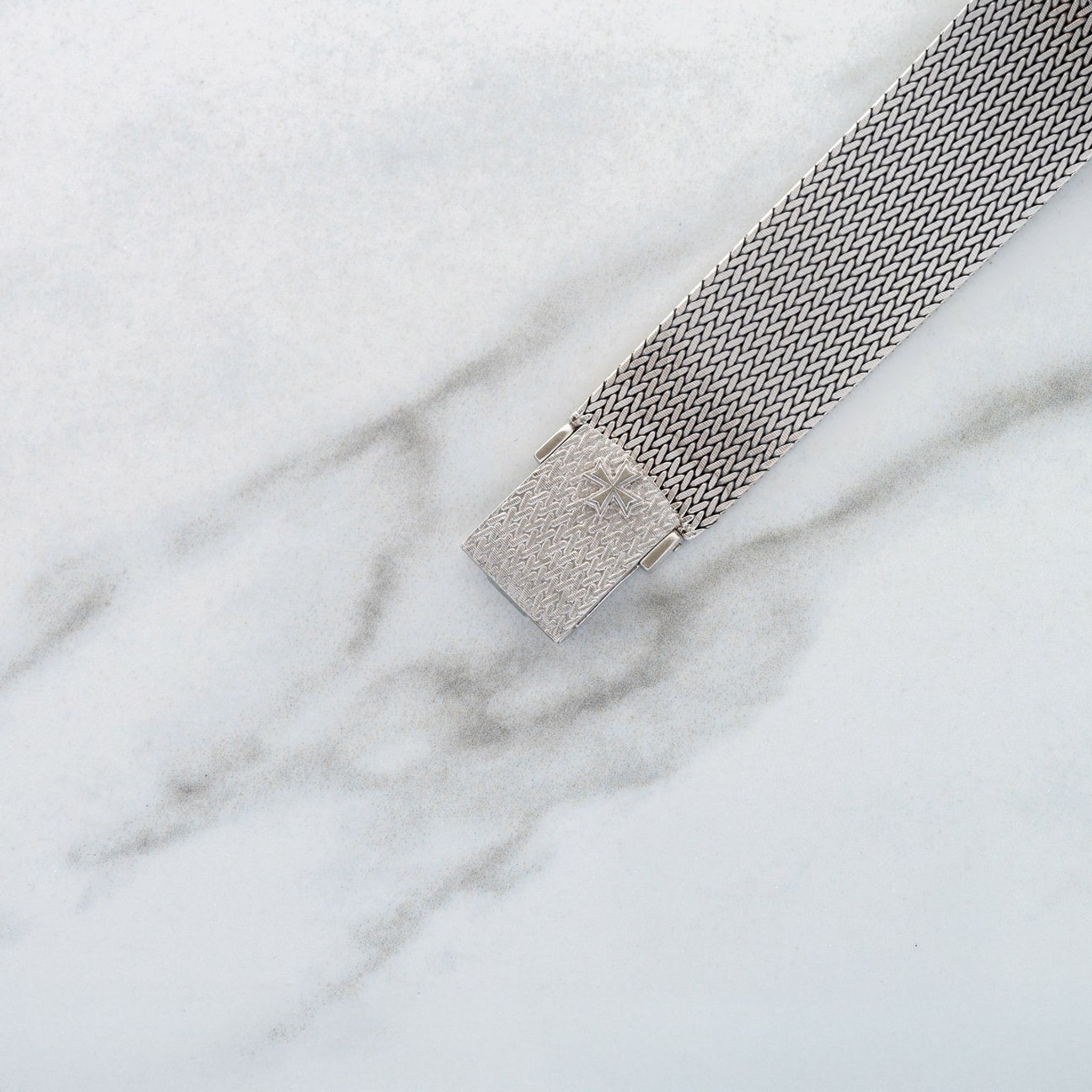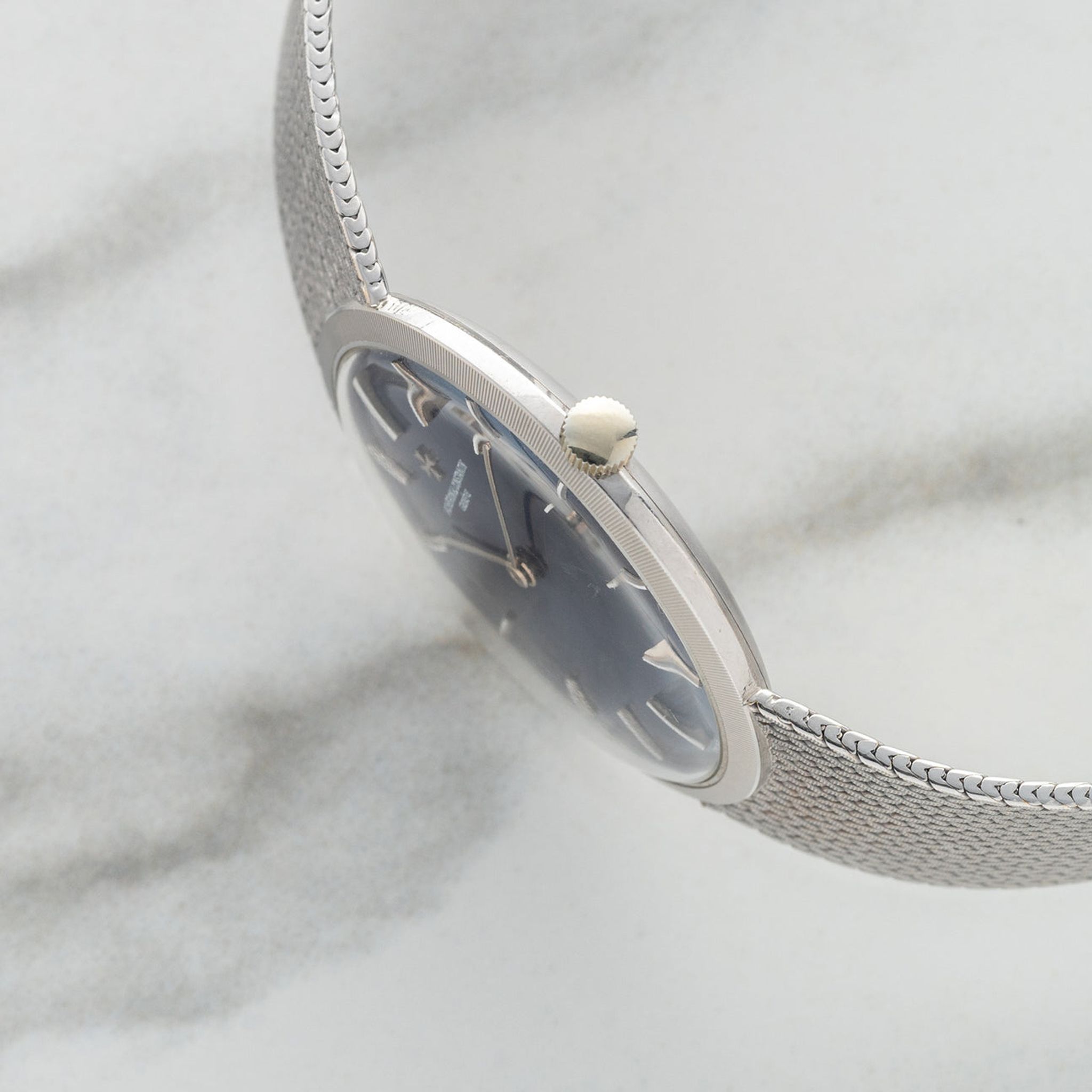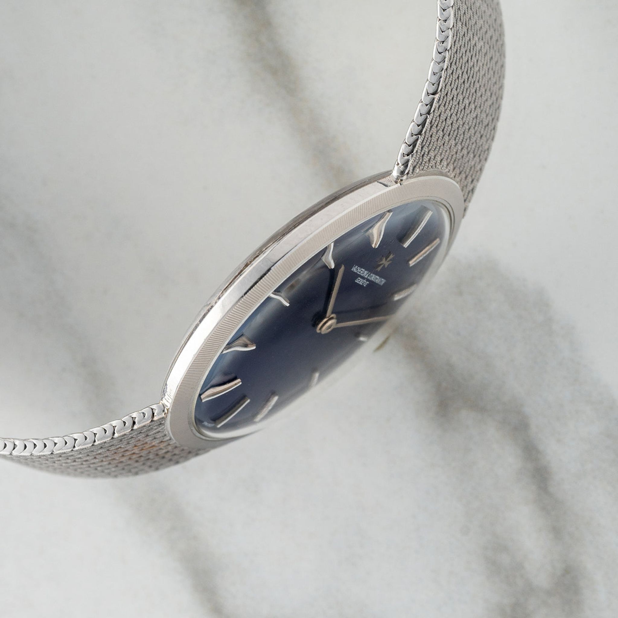 This particular piece piece is one of our favorite integrated bracelet watches we've come across to date. Housed in 18k white gold, it features a gorgeous blue dial in an elegant 32mm case. The mesh bracelet will fit an approximate 7 inch wrist, is comfortable and feels high quality as one would expect from the brand. For anyone looking for a slightly elevated watch in this style, this VC houses a high-grade K100/2 caliber and remains in excellent vintage condition.