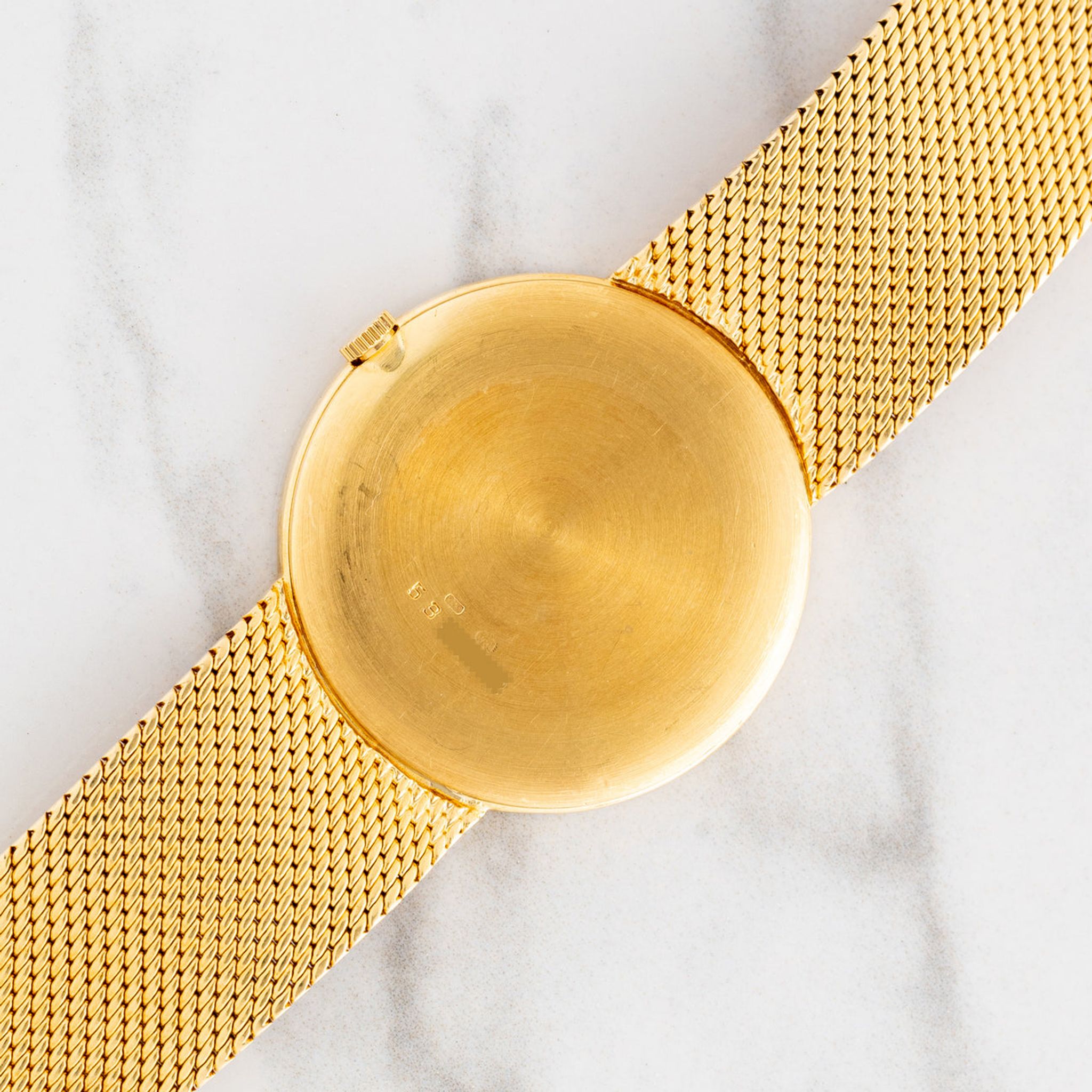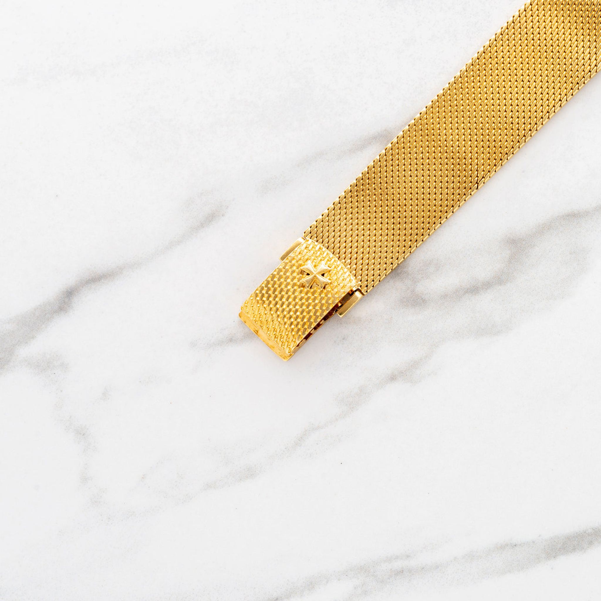 This particular "UFO" style dress watch, circa 1970s features an elegant 31mm case and comfortable integrated mesh bracelet. The dial has some light wear visible in the macro photography but it is not distracting to the naked eye. Overall condition is strong for vintage with crisp hallmarks and tight VC signed bracelet that will fit an approximate 7.25 inch wrist. We love the minimal design language of this piece and believe it suits someone looking for a full gold dress watch that's off the beaten path. It has just come back from a complete overhaul and is ready to enjoy for years to come.