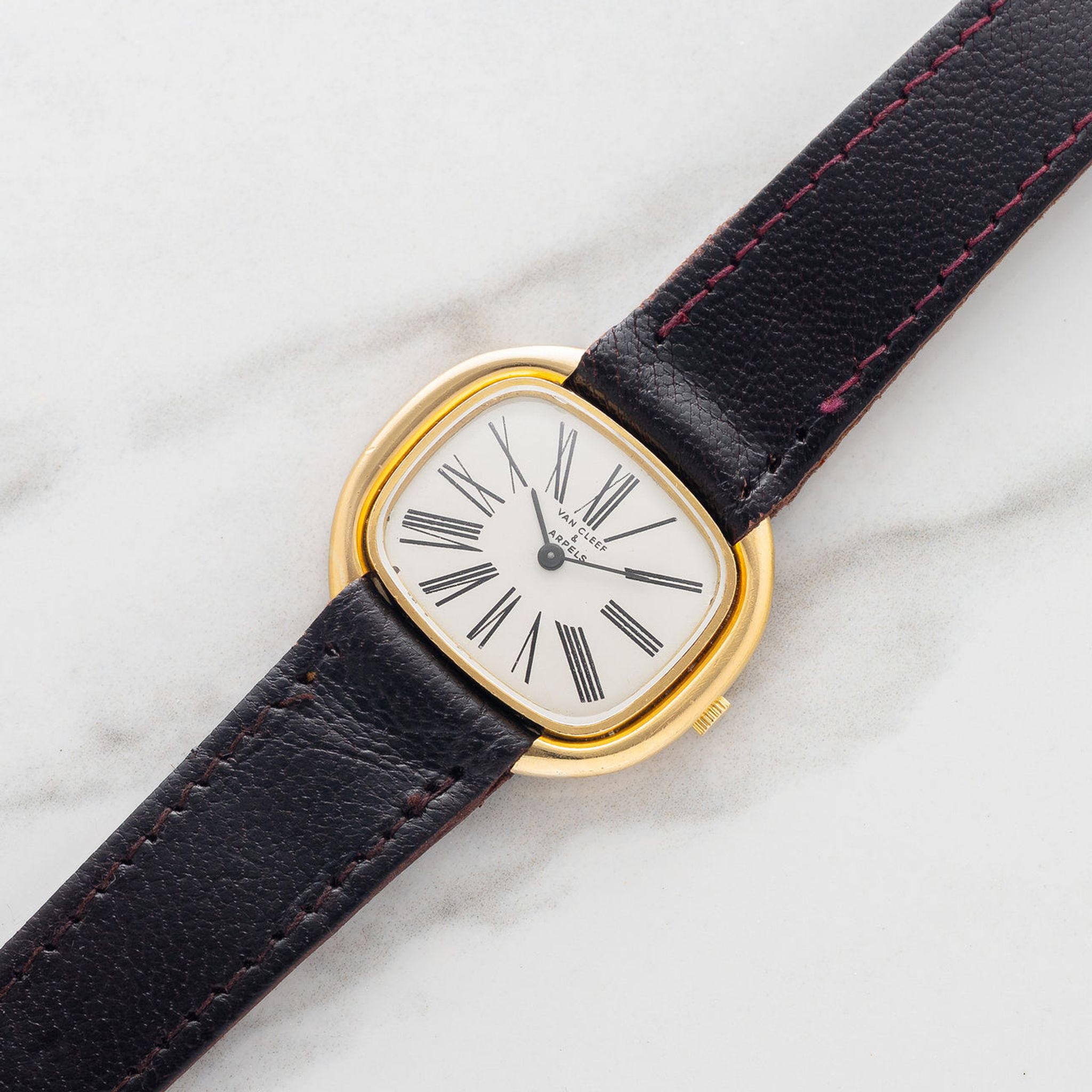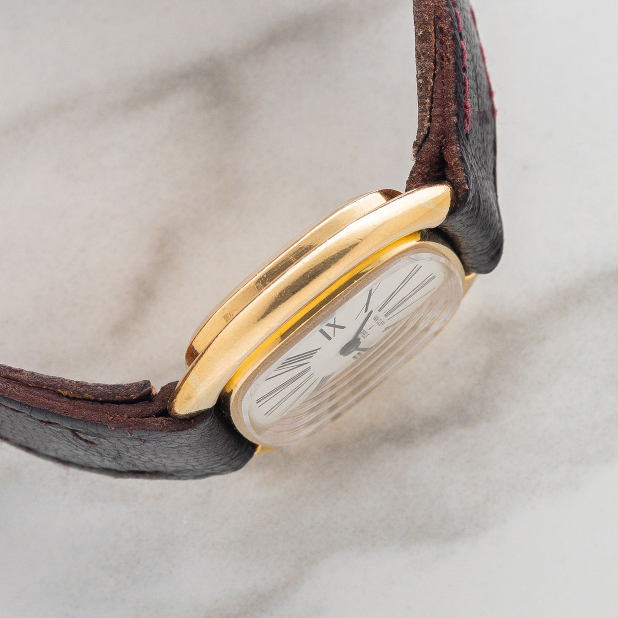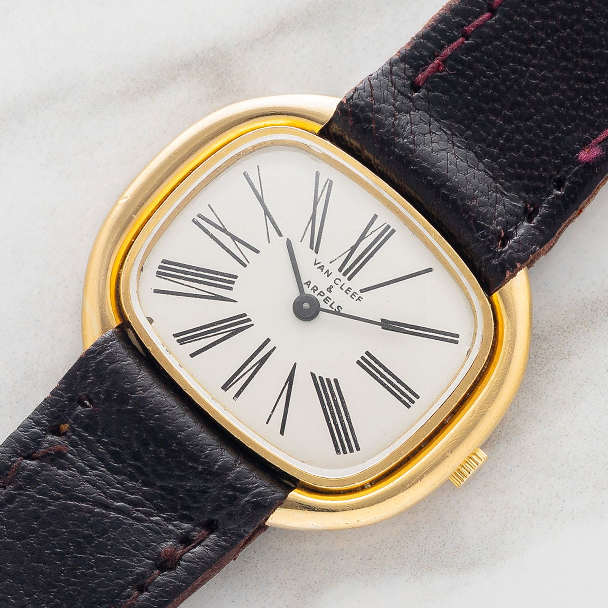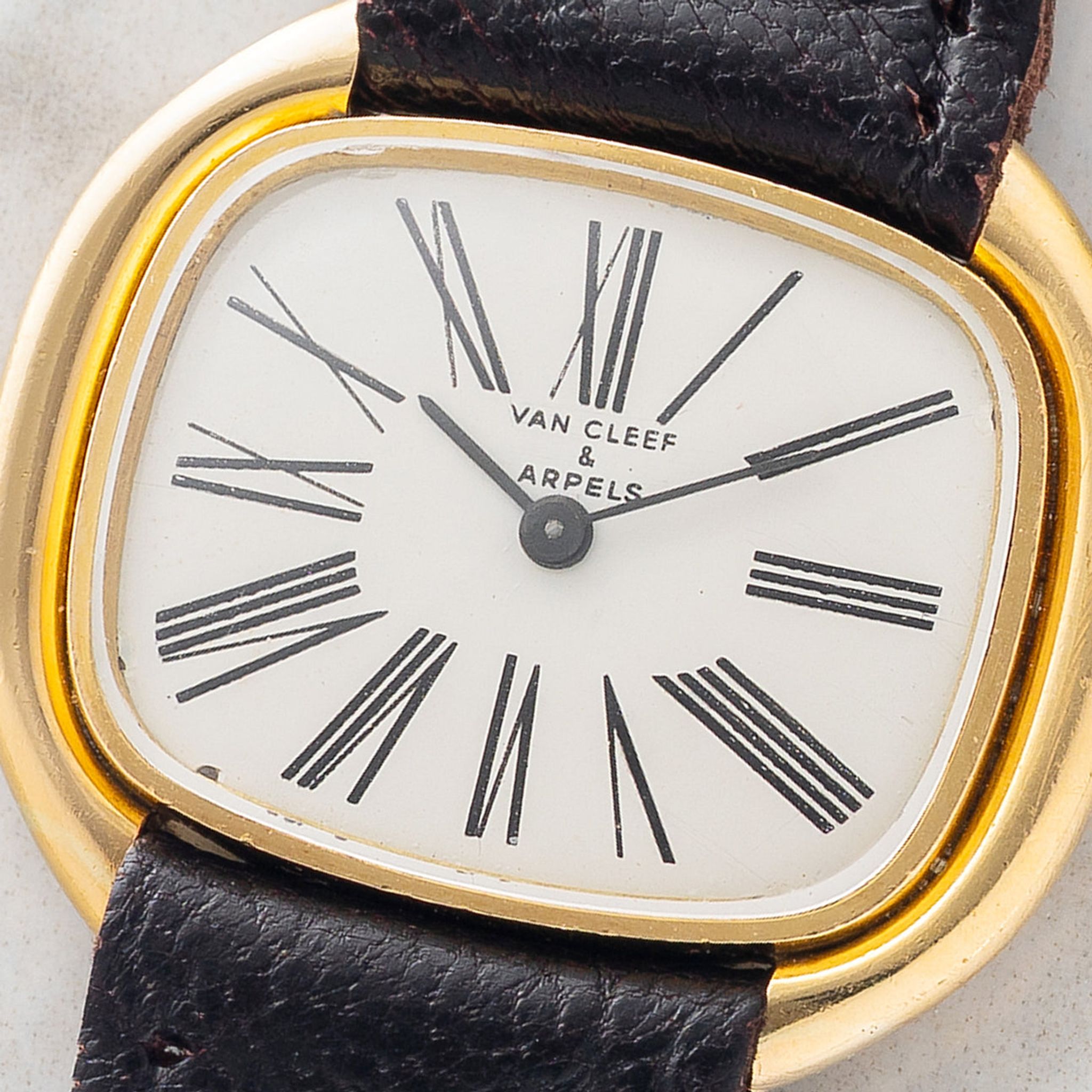 This particular timepiece is reminiscent of a Cartier "Gondole" with oval case shape. Though the dial carries the Van Cleef & Arpels name, the movement inside was produced by UTI Paris (Utinam), a respected French manufacturer, also founded in 1906. Known for its precision instruments, from railway timers to refined wristwatches, UTI was a trusted partner for maisons seeking mechanical excellence beneath elegant exteriors. Likely dating to the 70's, this piece reflects that postwar golden era when even decorative timepieces were built with intention. The French Eagle’s Head hallmark on the case confirms its 18k gold content and origin—a subtle detail for the discerning eye. Surviving examples like this are rare, offering a quiet glimpse into a refined and often overlooked chapter of French horology—one defined by balance, purpose, and timeless Parisian elegance.