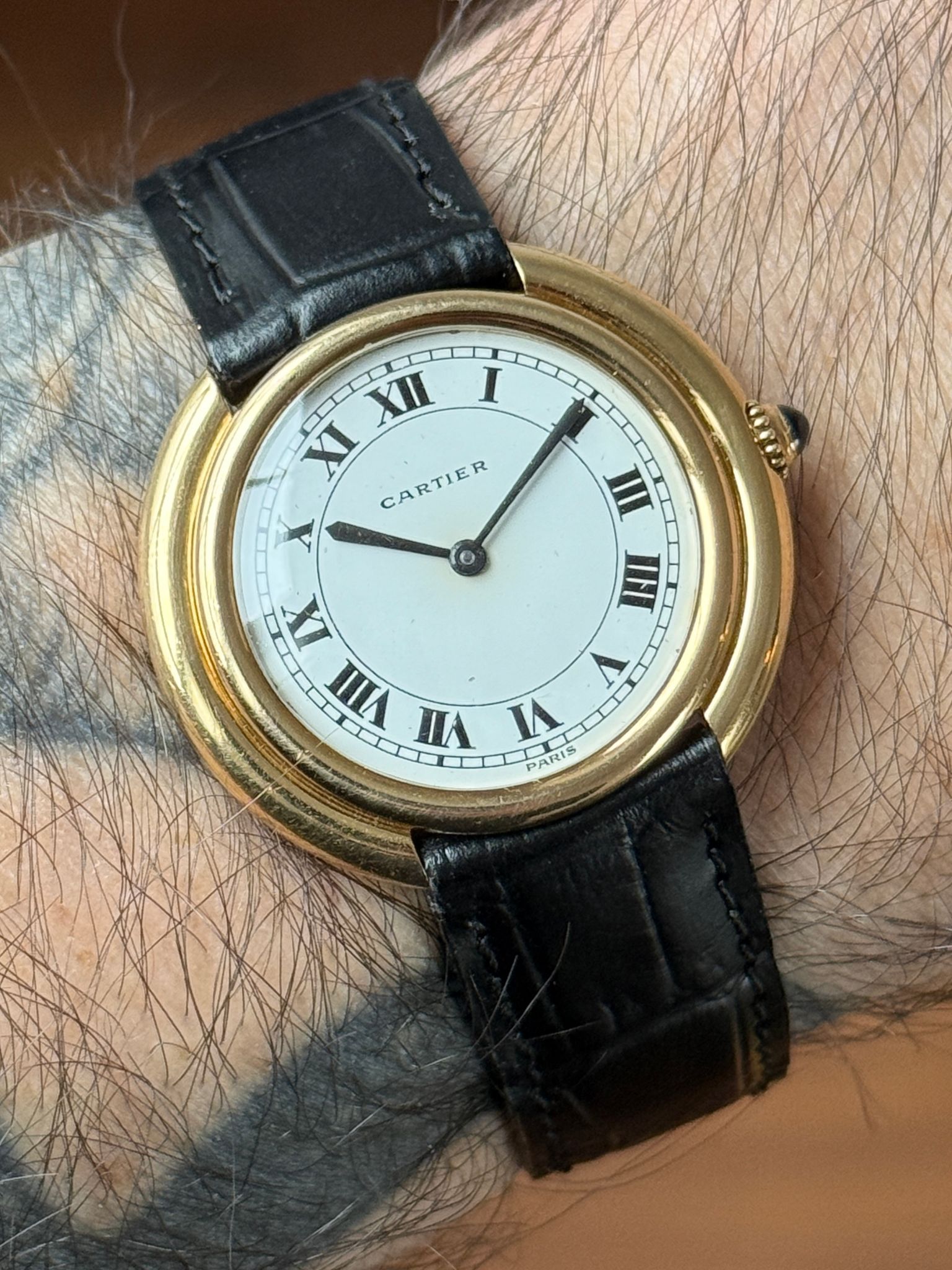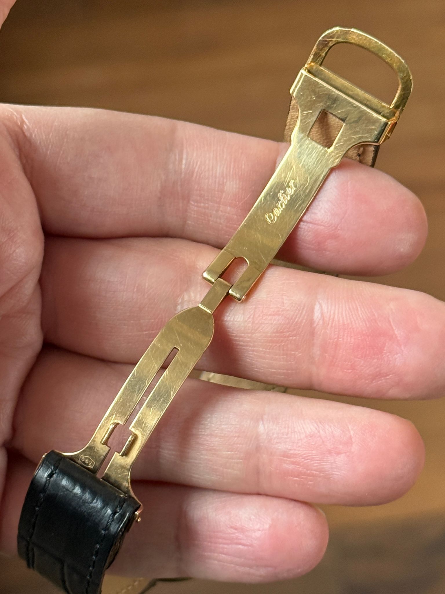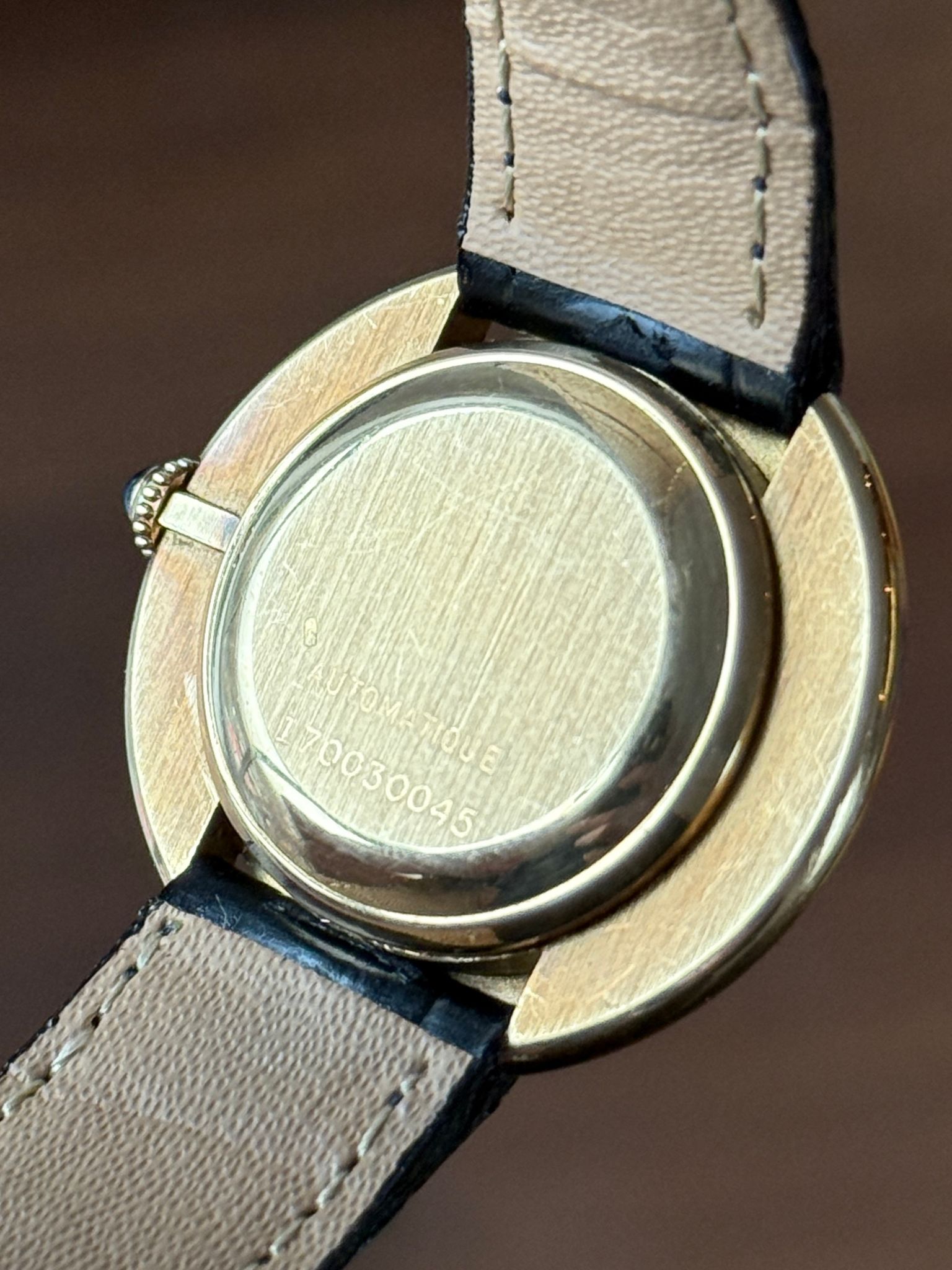 A beautiful early example of the Cartier Vendome Ellipse jumbo automatic with 18k deployant. One of the larger models Cartier produced in the early 1970s, and more rare to see in the automatic version. Beautiful early 70s Cartier logo and low serial number.