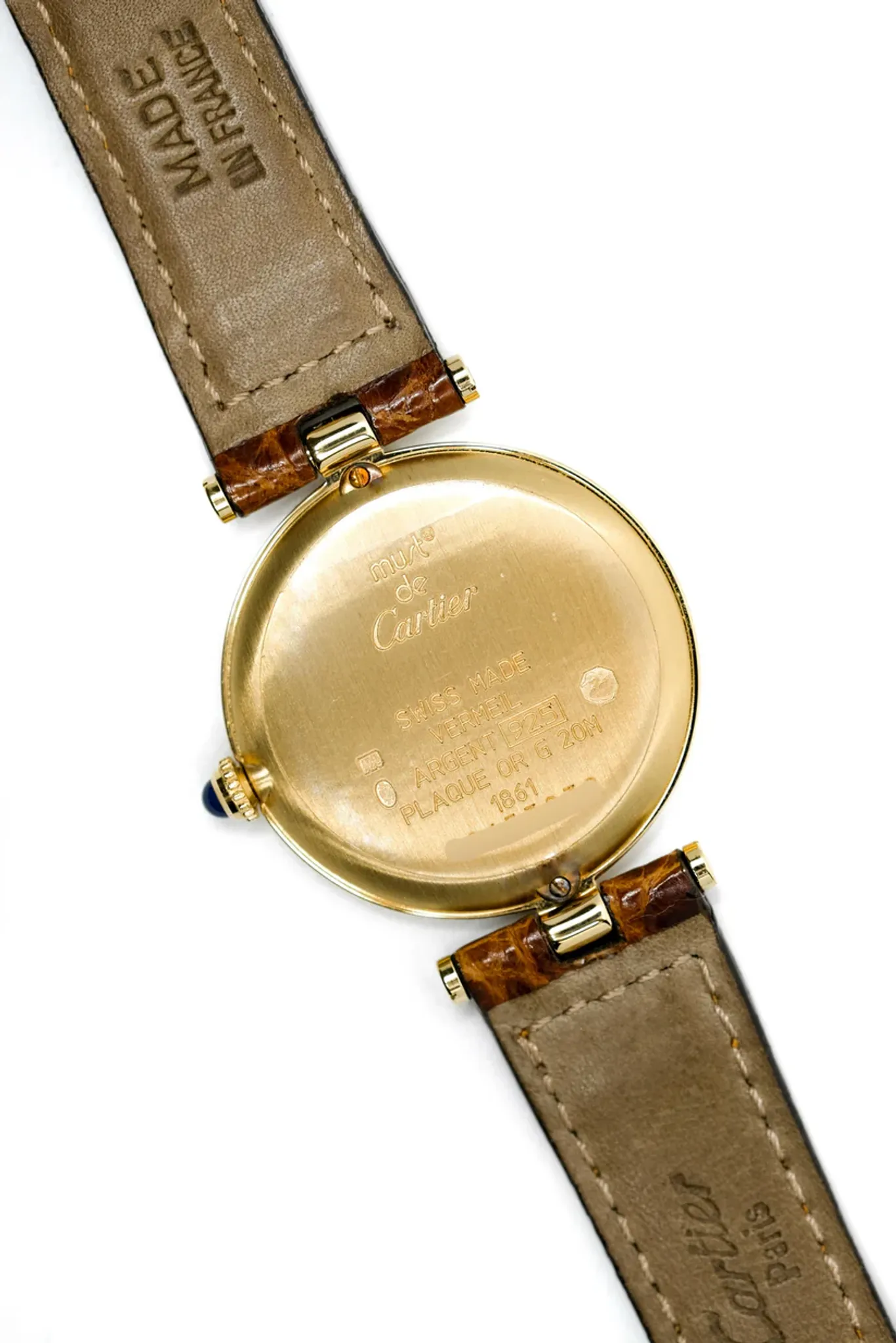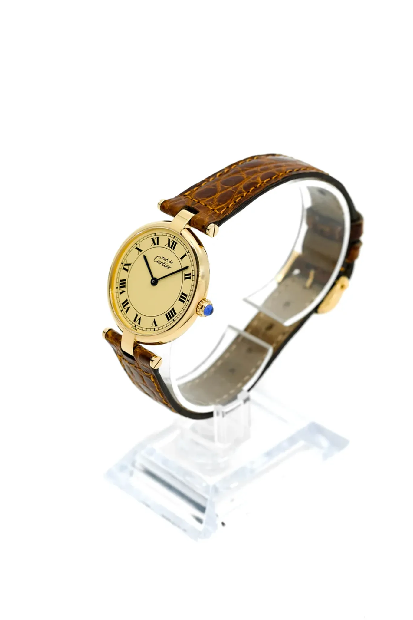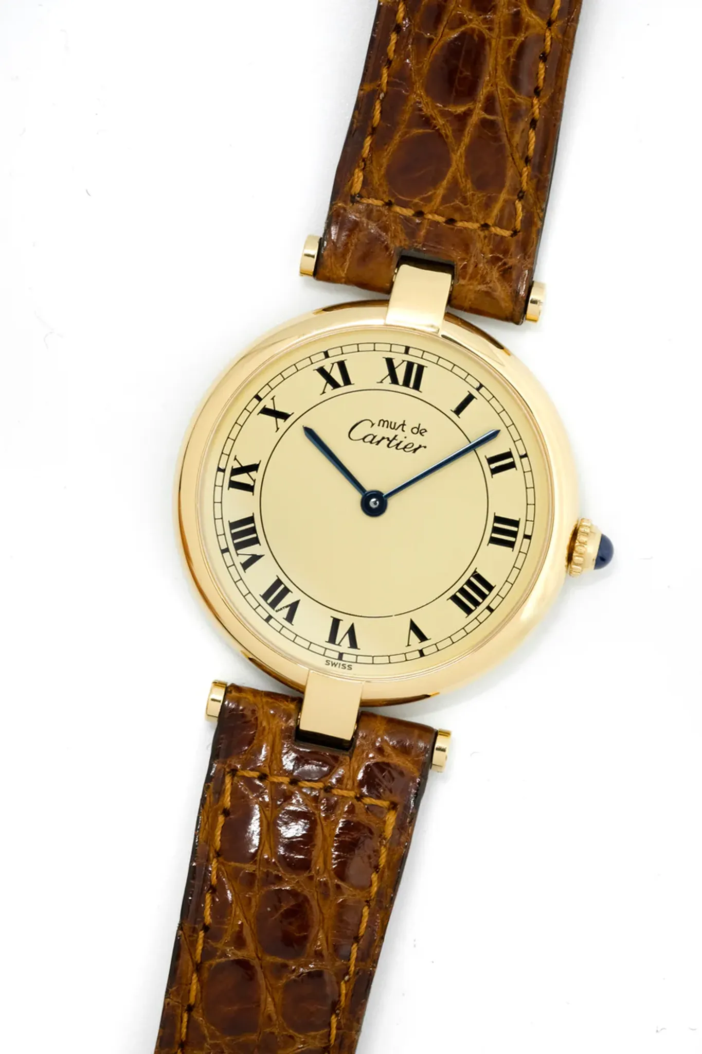 Vermeil (gold-plated silver) case. Cartier brown alligator leather strap. Cartier gold-plated pin buckle.