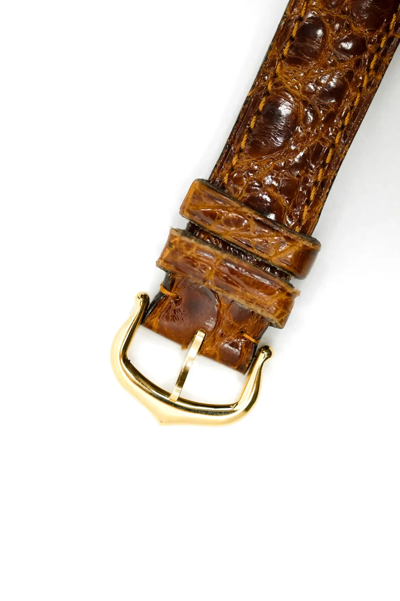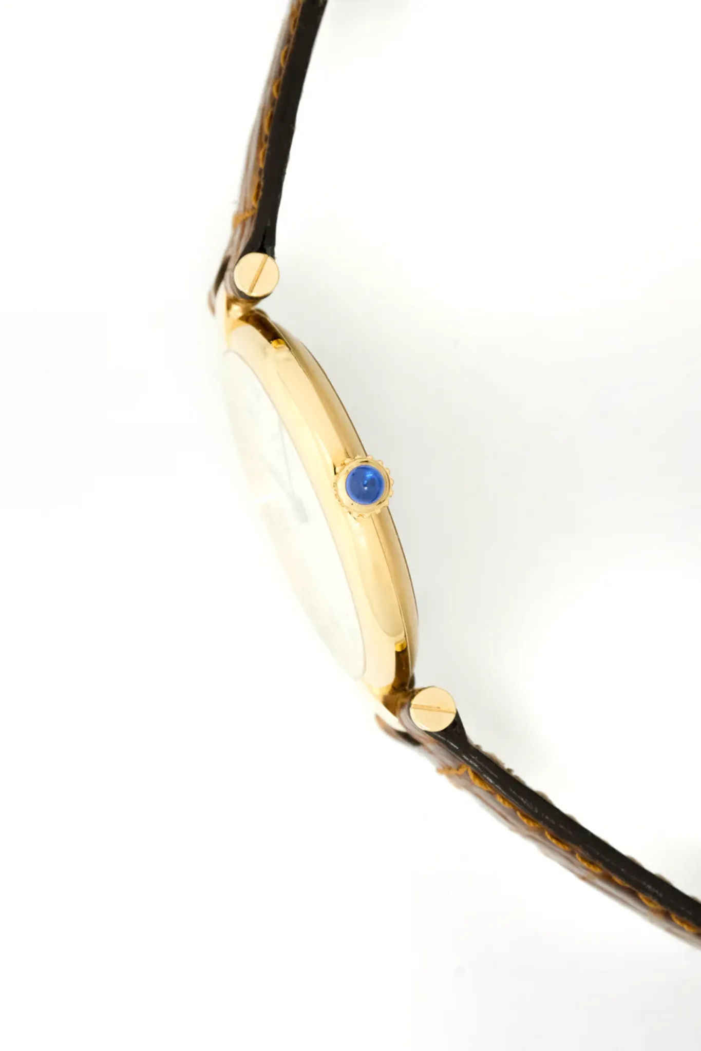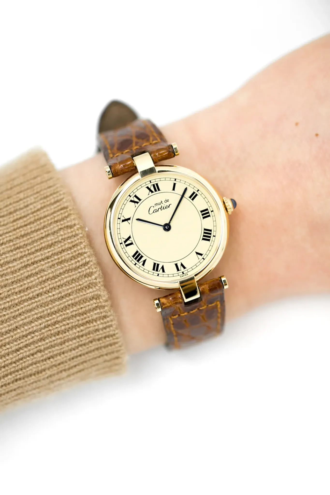 Vermeil (gold-plated silver) case. Cartier brown alligator leather strap. Cartier gold-plated pin buckle.