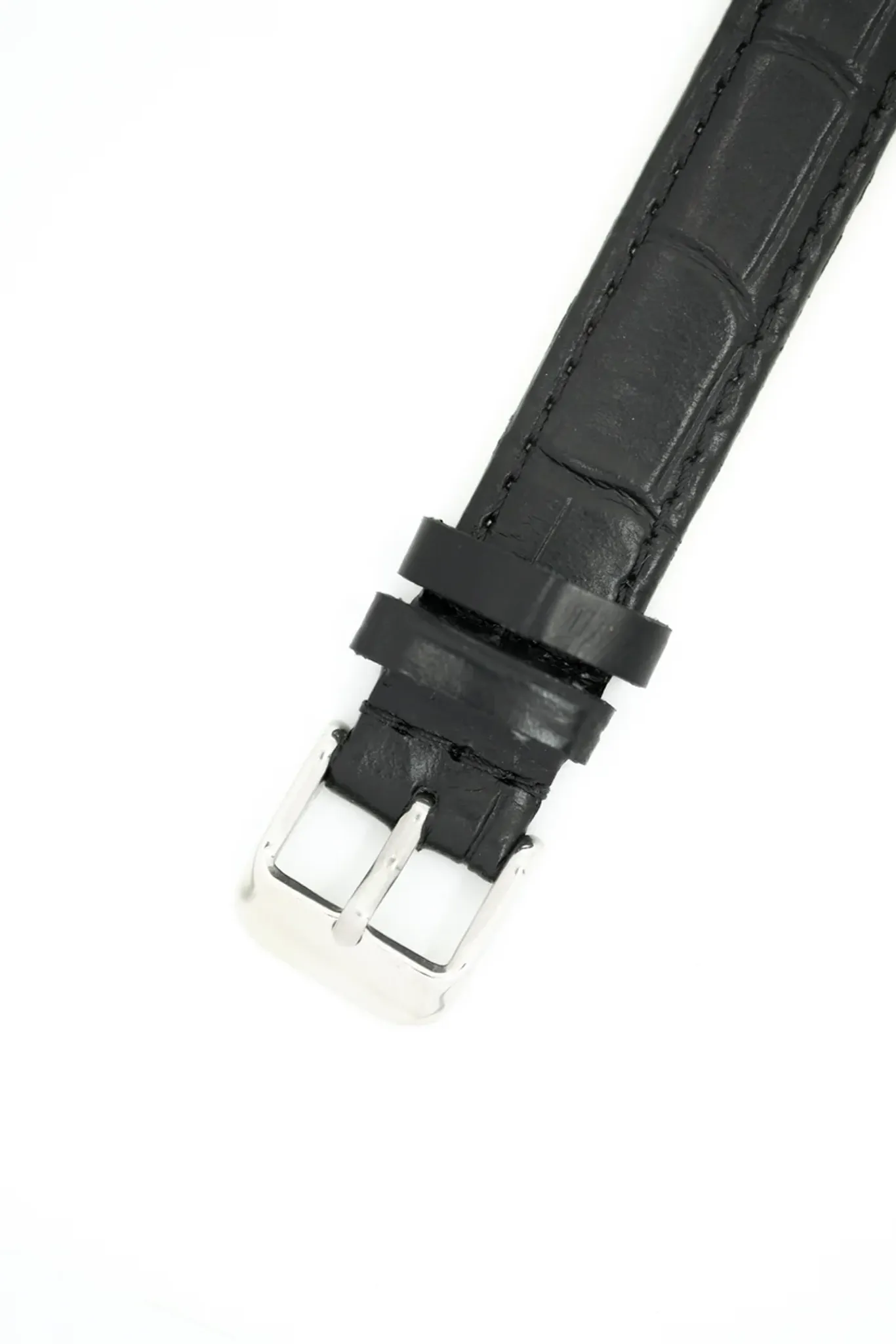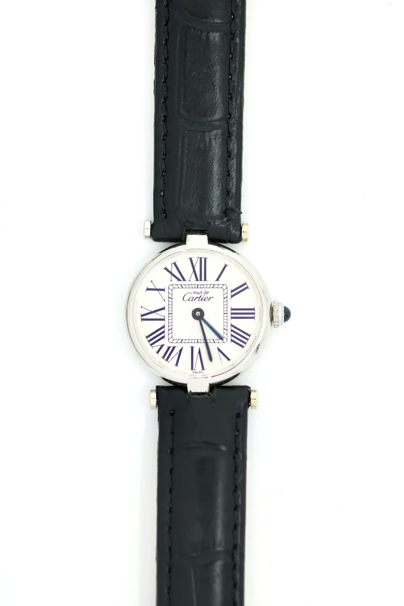 Silver case. Unsigned steel pin buckle. Unsigned black alligator strap. Comes with its original Cartier box.