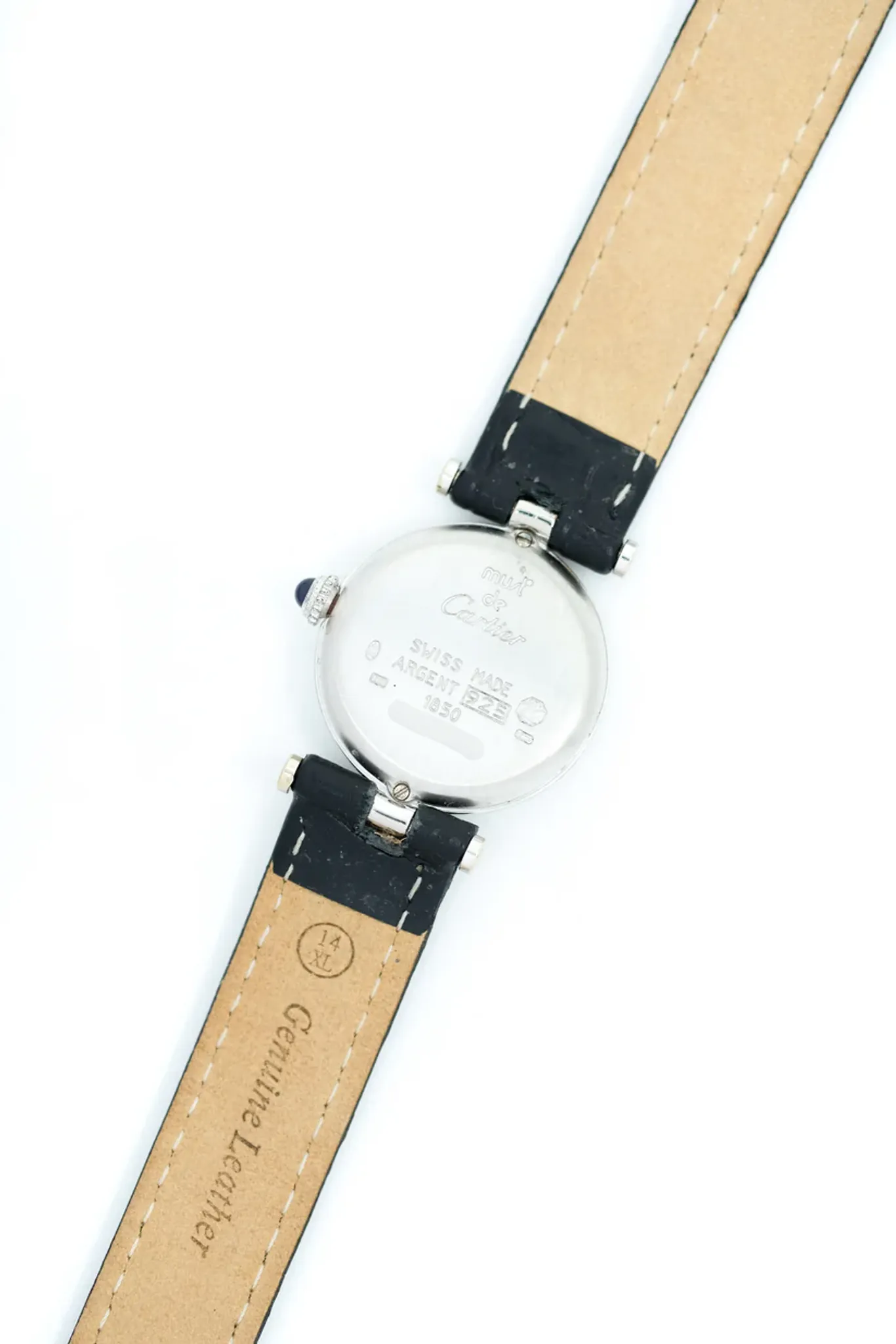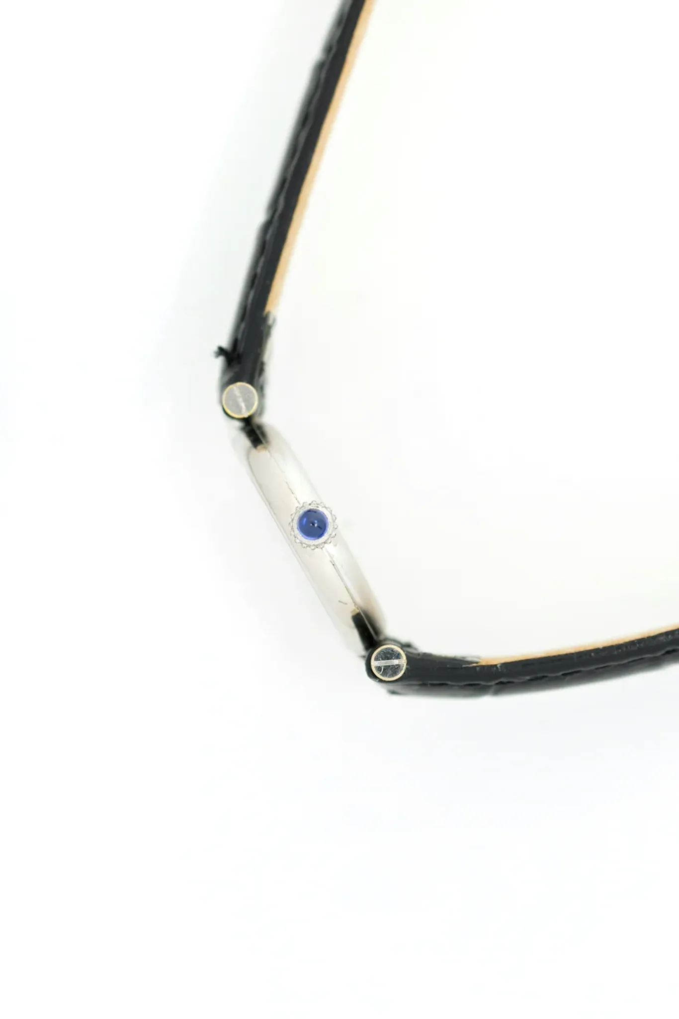 The Must version always offers originality. This version is therefore neither solid gold nor gold-plated. This is the less common silver version. The hands and the elongated blue Roman numerals go very well with silver. This Must version offers two qualities: of course, a more contained budget than its big sister in solid gold and a dial so original that one would not find on the solid gold version.