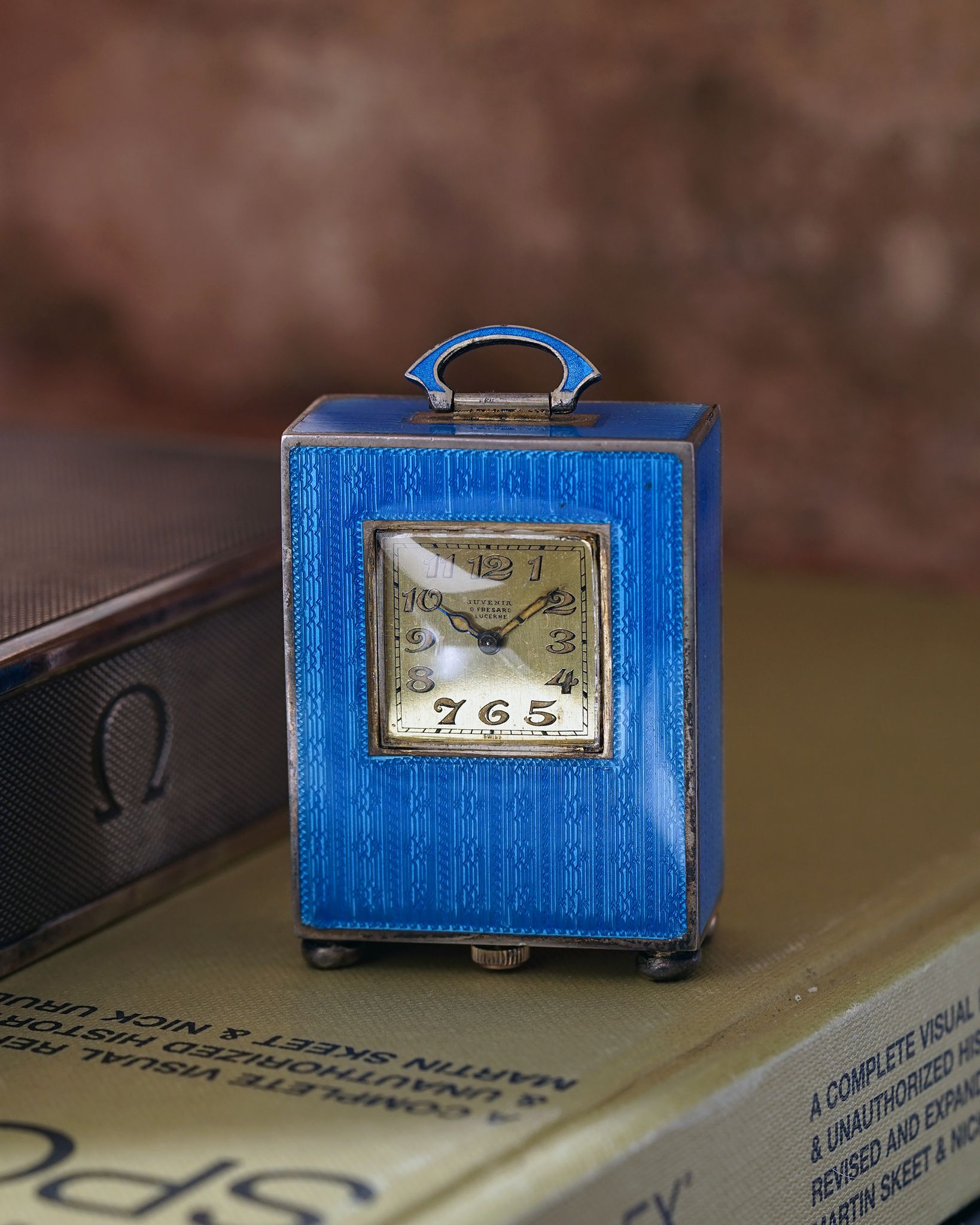 This Belle Époque table or travel clock, featuring a 925 silver case adorned with guilloché work on the front, top, and sides in a captivating pattern, is beautifully enameled in Prussian blue and bordered with a delicate silver line. It is in outstanding condition, free from cracks or major dings, making it truly mesmerizing.