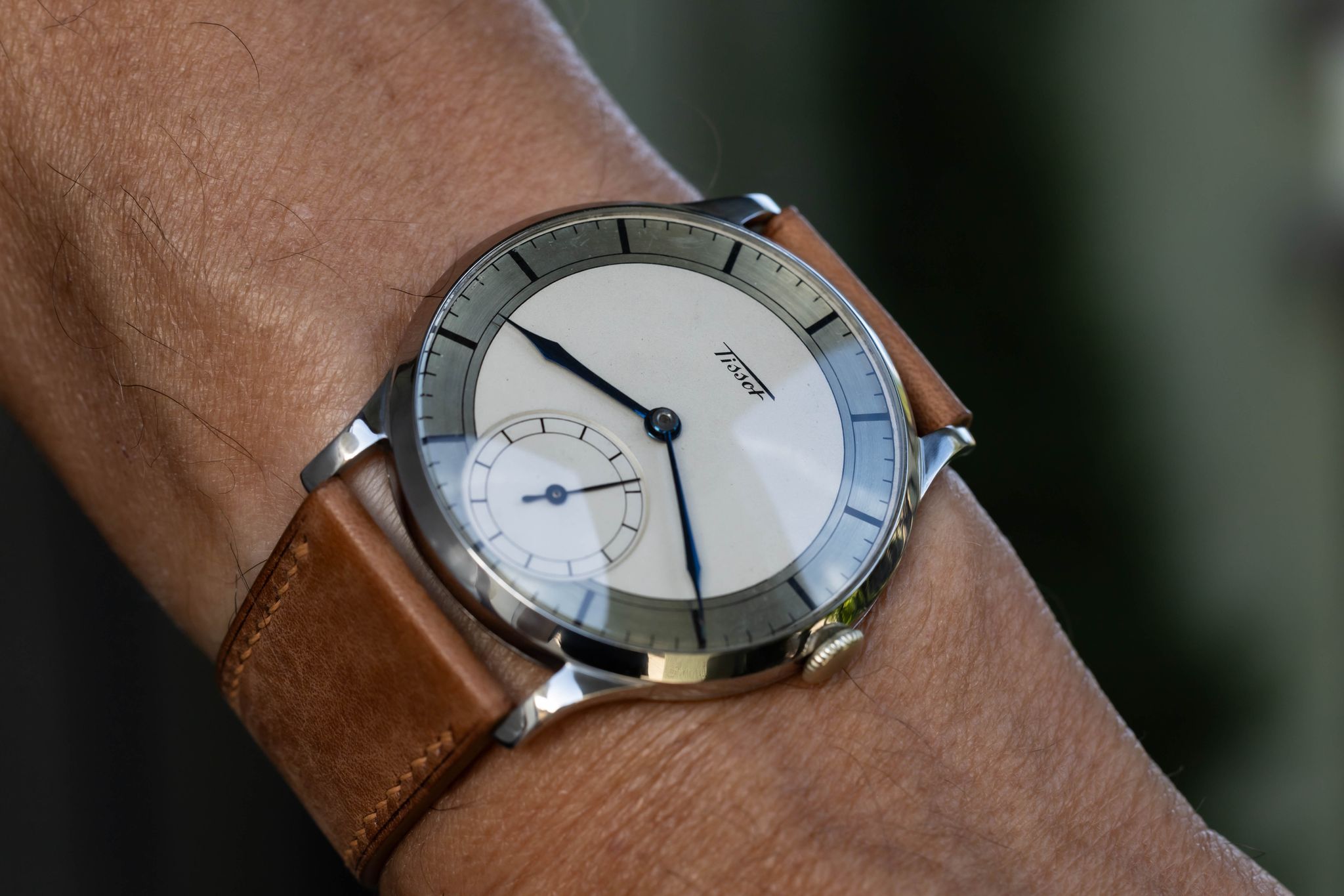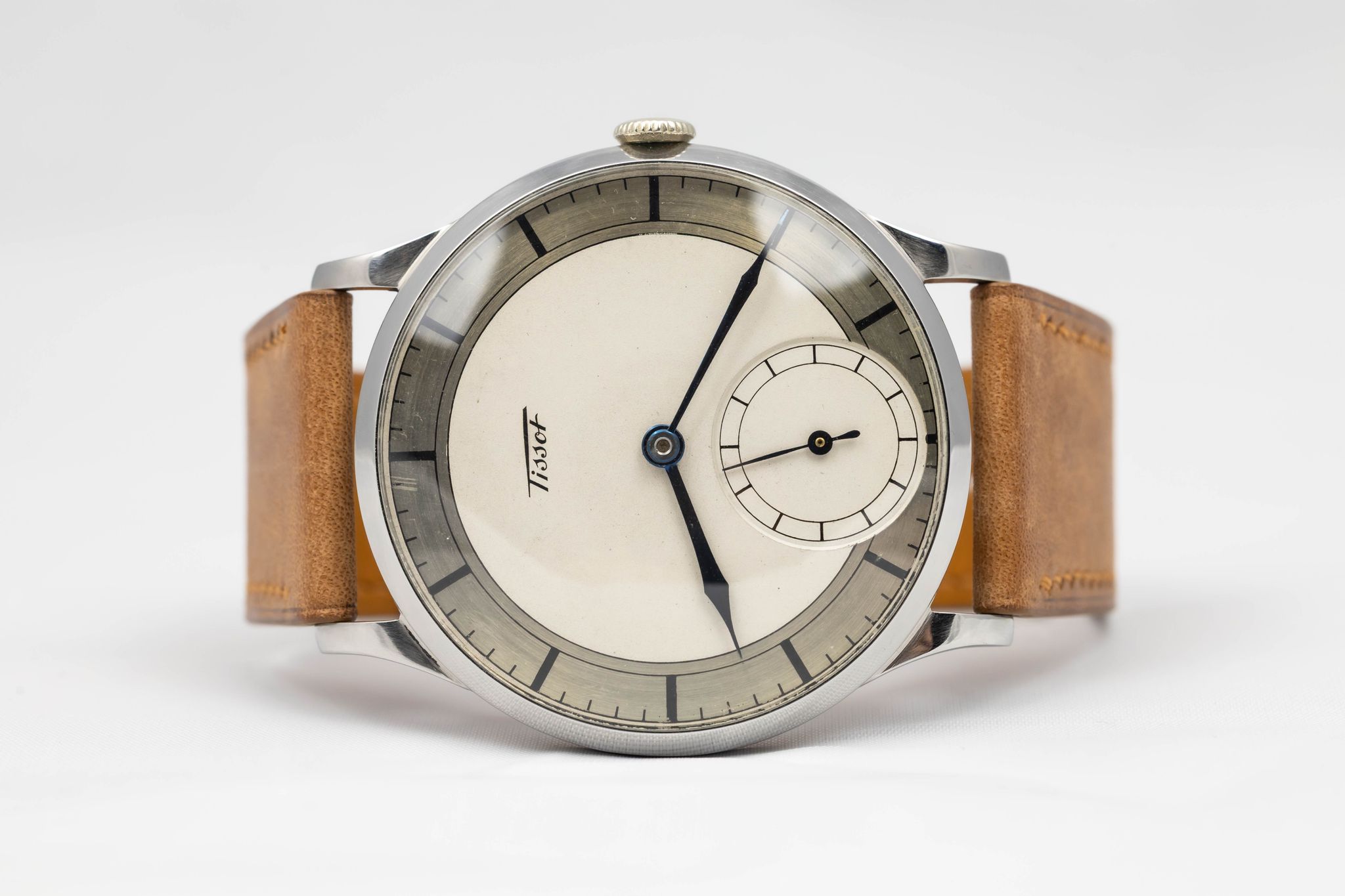 Extremely rare and beautiful stainless steel watch with contemporary dimensions. Unpolished and unrestored and extremely well preserved, still looking looking as new. Bi-tone sector dial is in amazing shape with very little degradation. The outer track is mirror-like in finishing, and the blued hands are excellent.