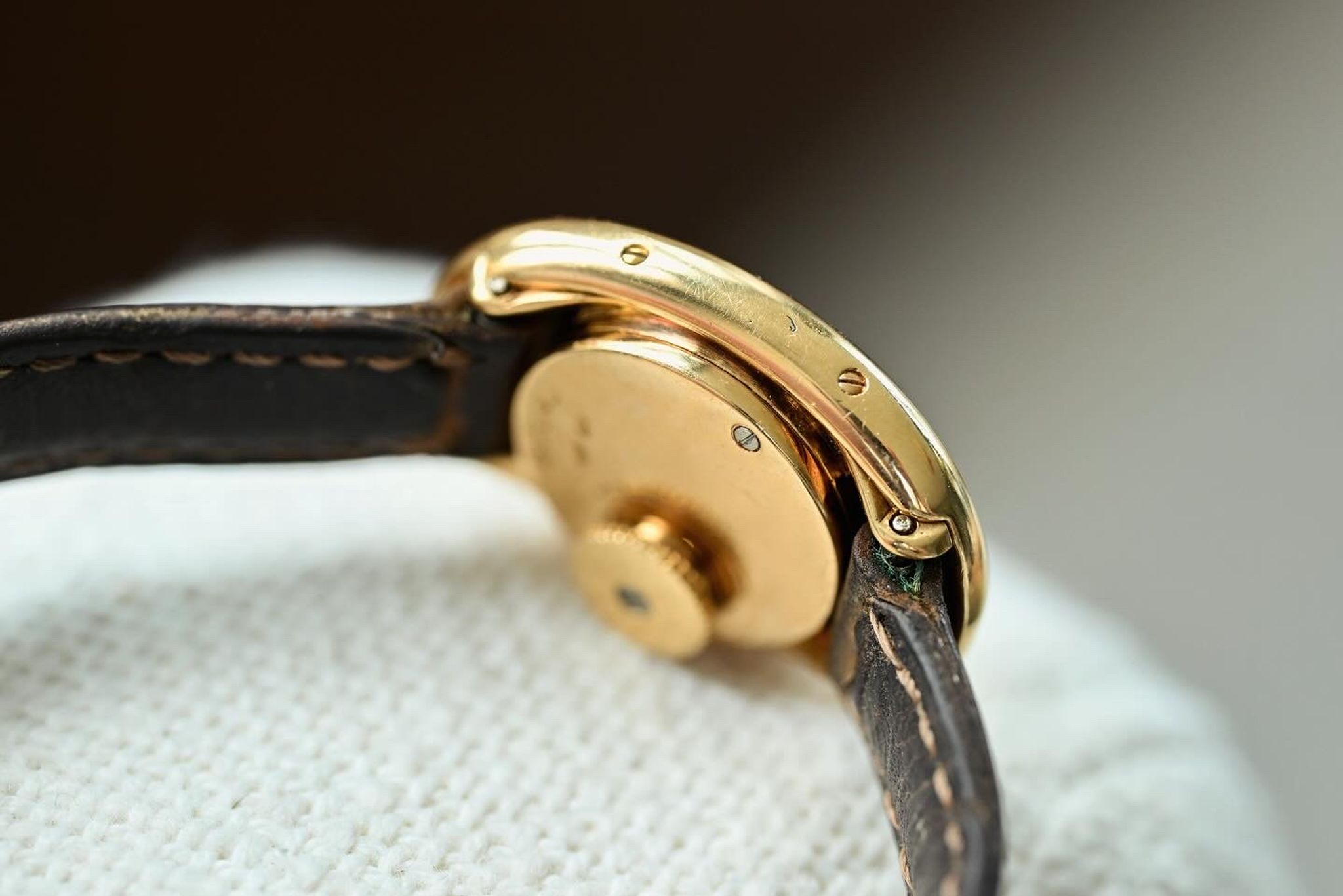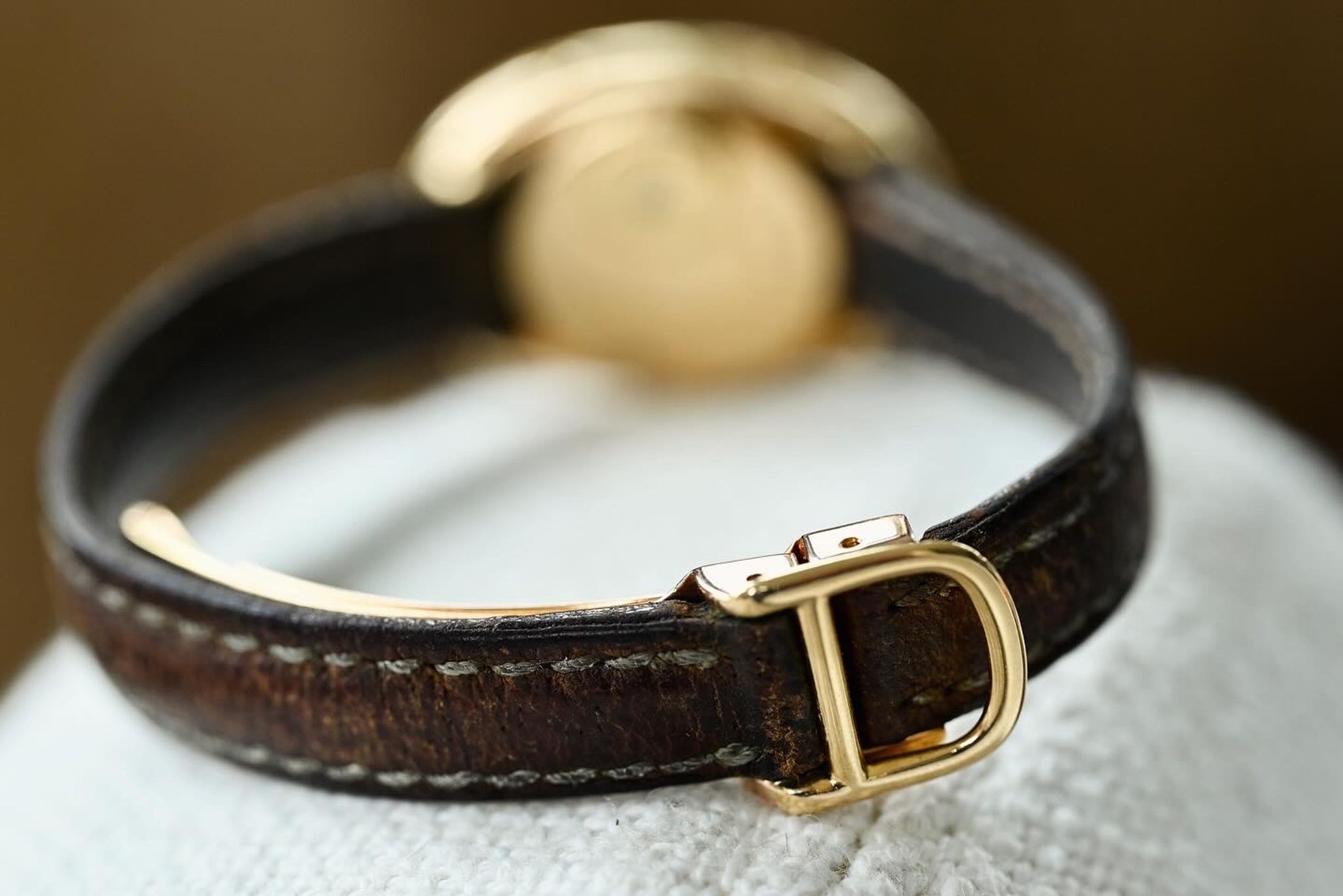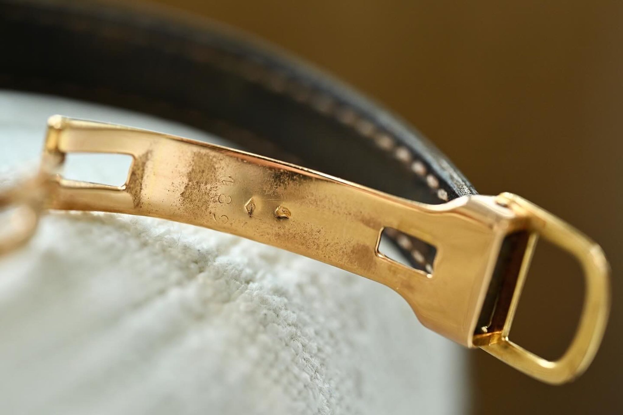 Featuring a solid 18k gold case by Edmond Jaeger with French hallmarks measuring 20x28mm, Jaeger LeCoultre backwind movement and original 18k gold deployment buckle with French hallmarks.