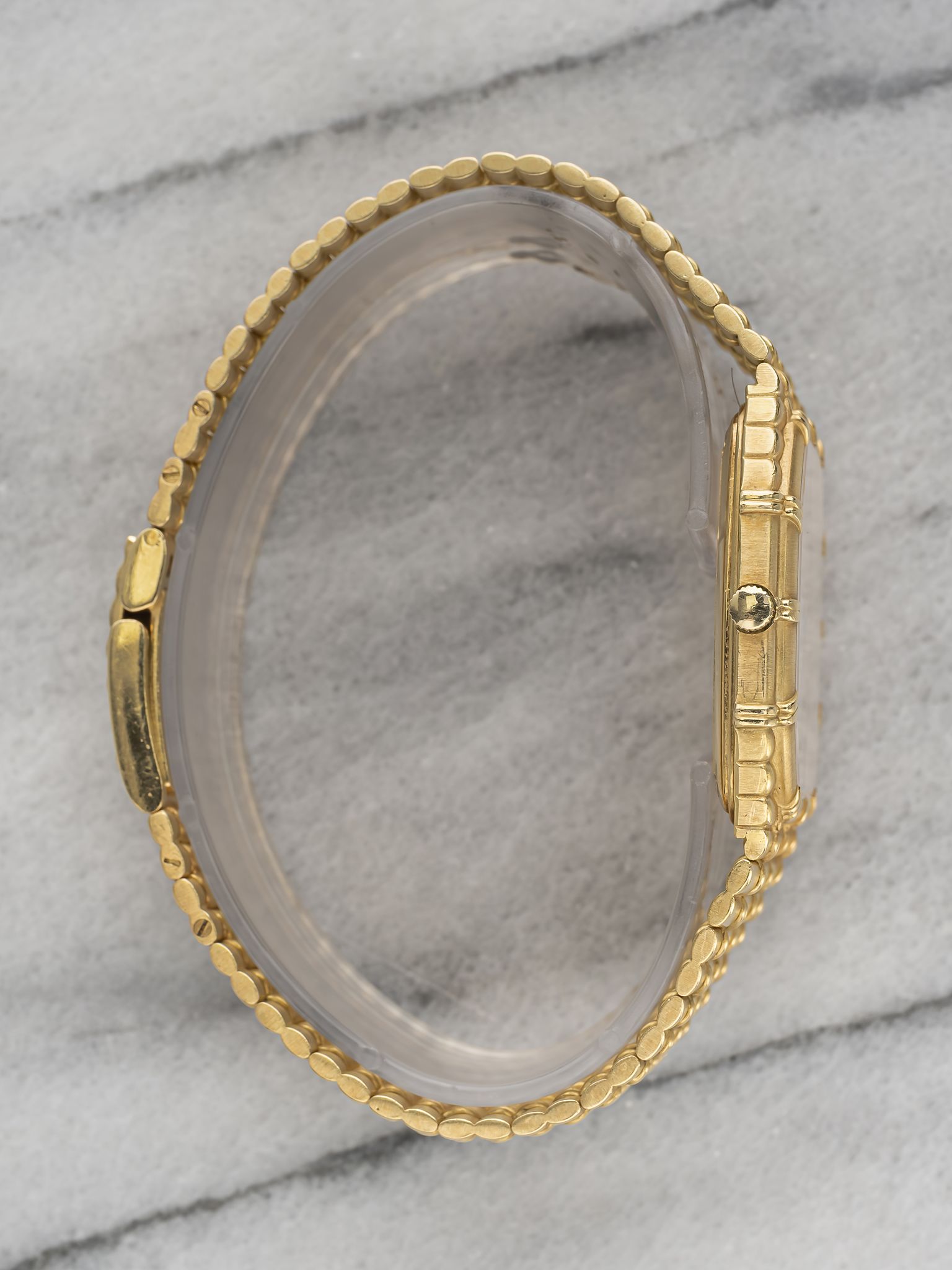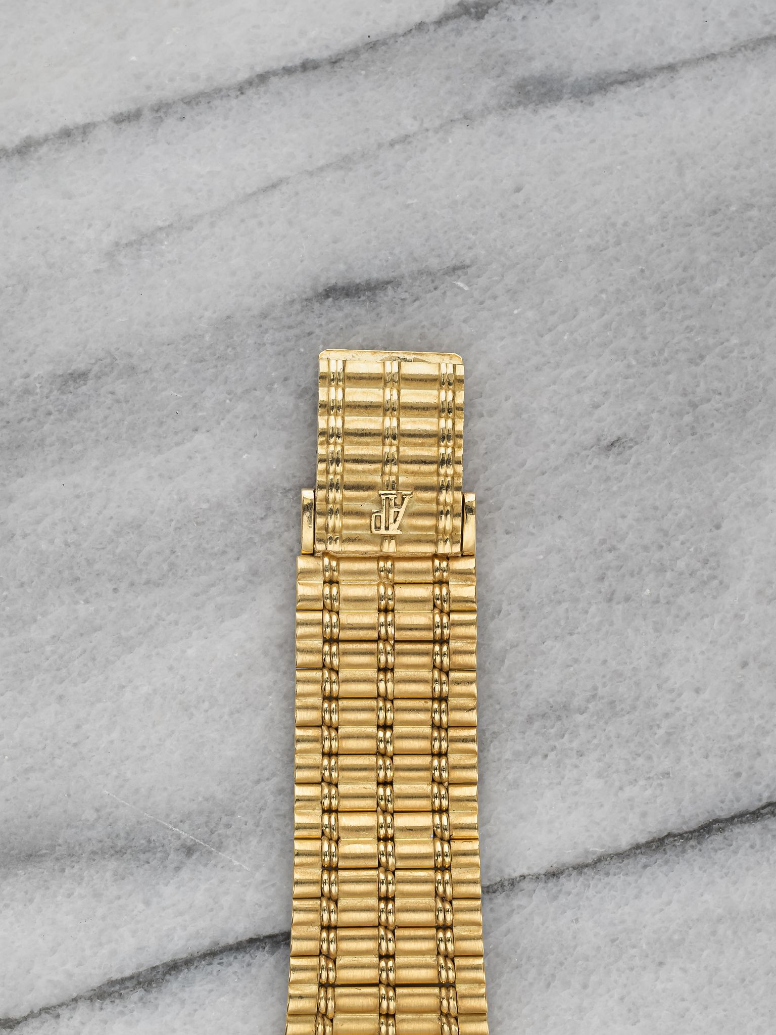 Here's a vintage Audemars Piguet Bamboo in 18k yellow gold manual wind with a champagne motif pattern dial from the 1980s. Measurements include a 28mm case size across and the bracelet fits up to a 7 inch wrist. Matching stick hands and hour markers. All parts including the crown, dial, movement, and caseback are original.