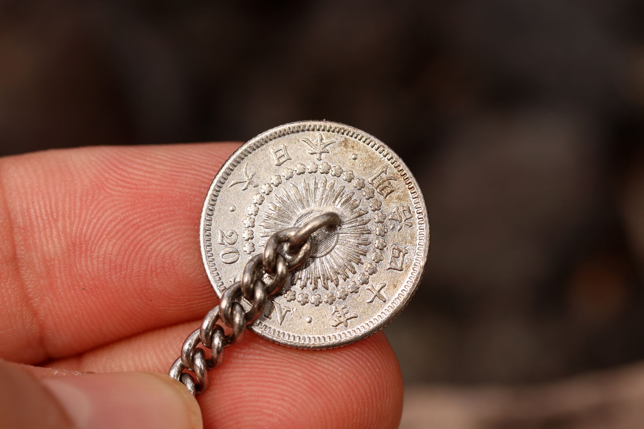 The watch also features its original chain and at the end is a Japanese 20 SEN coin.