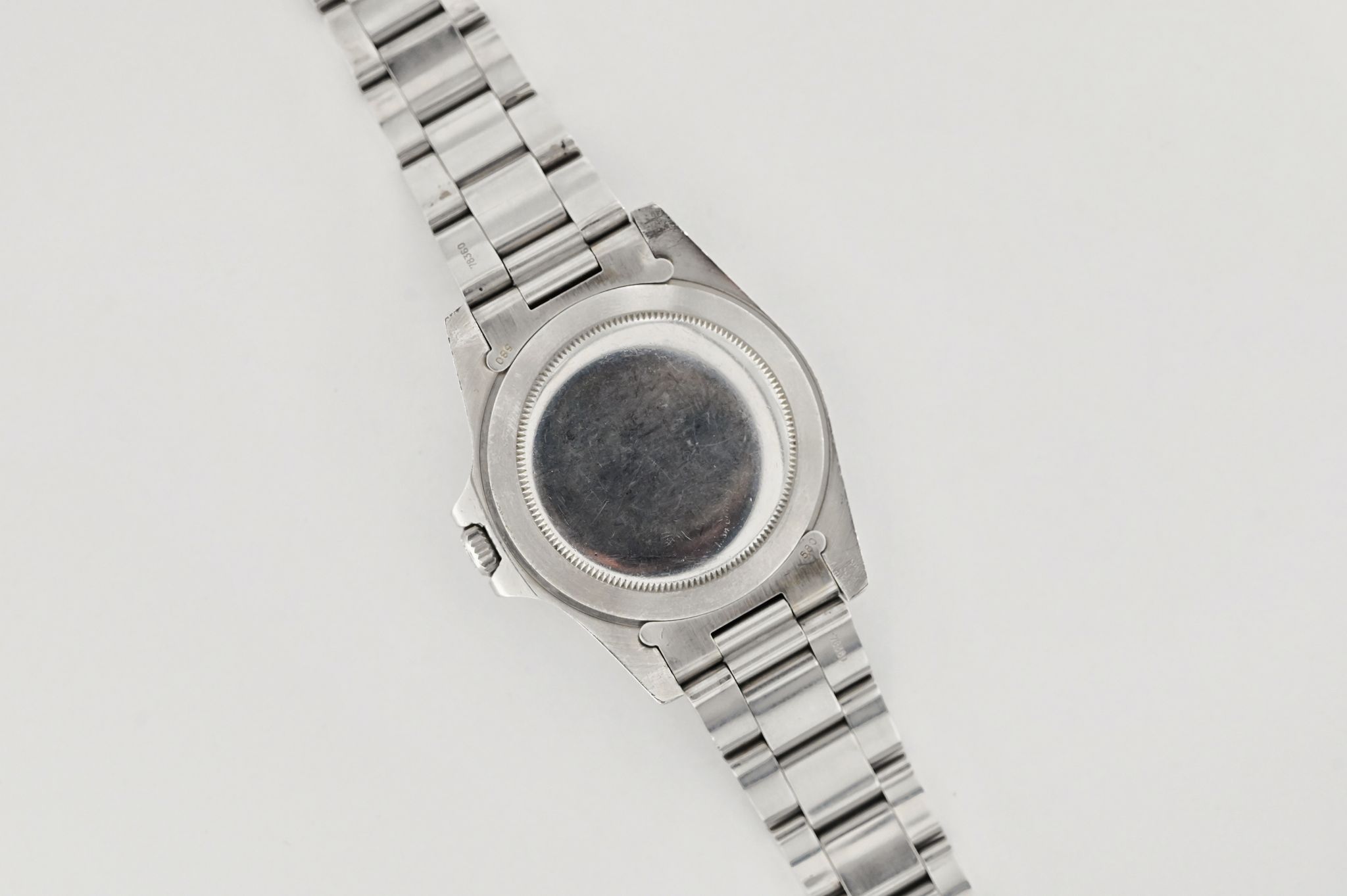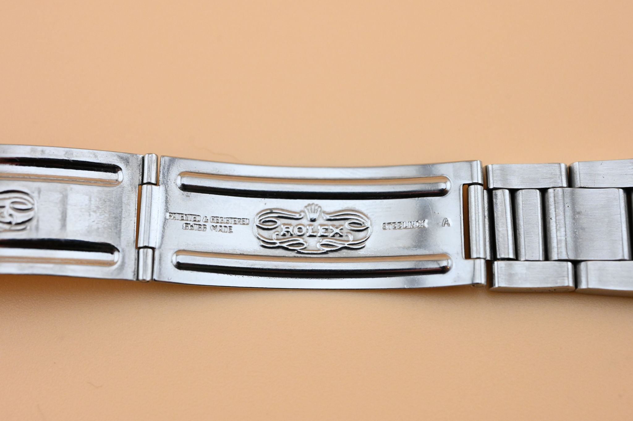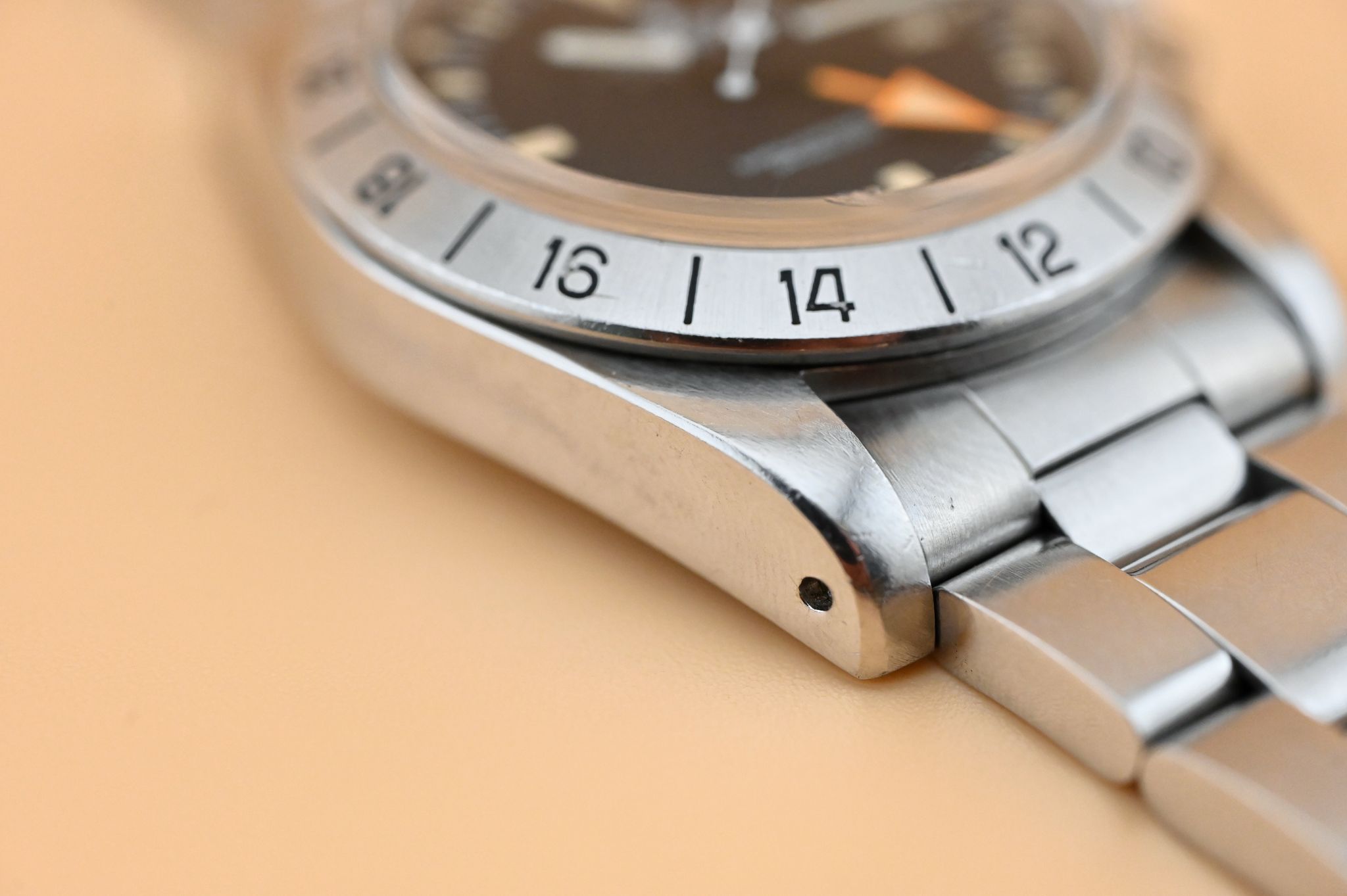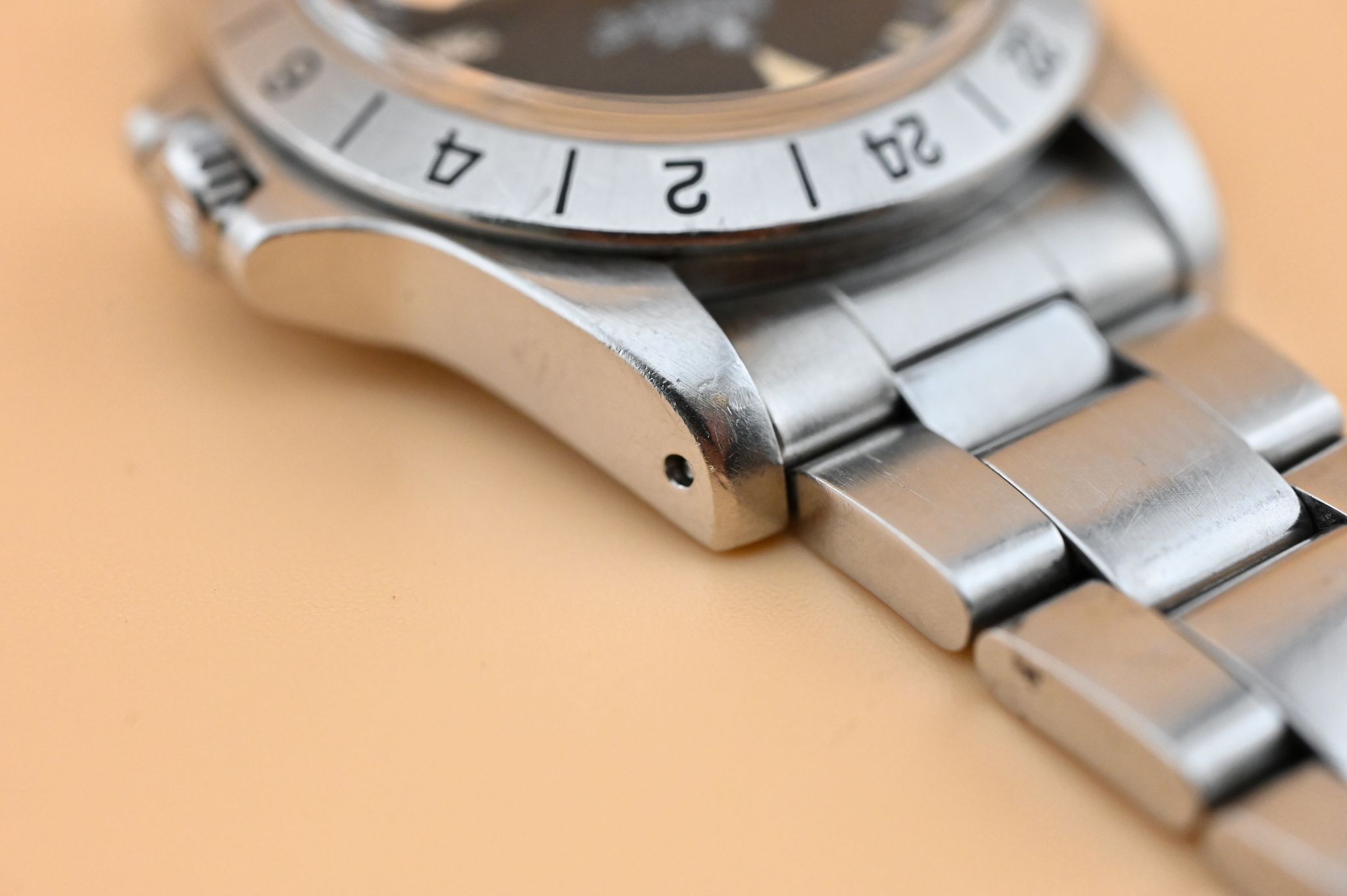 Case: The distinct original case is very thick and full throughout with its original geometry, profile, and distinct chamfers clearly present. It’s hard to say if it has seen a polish throughout the years or just steady wear, smoothing the brushing on the tops of the lugs, but if it has, it was done very sympathetically as the chamfers are full, thick, even, and consistent through the mid case, as a truly unpolished example would retain. The serial and reference number are crisp and present, without any pitting or corrosion. The correct signed crown screws down and engages as expected.