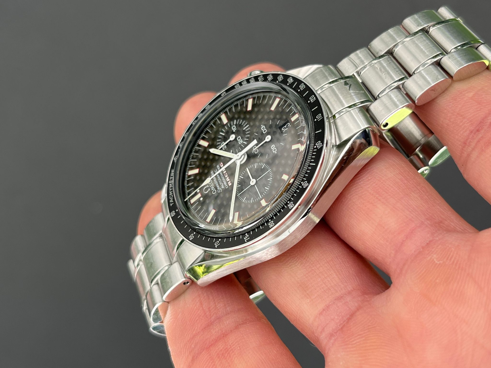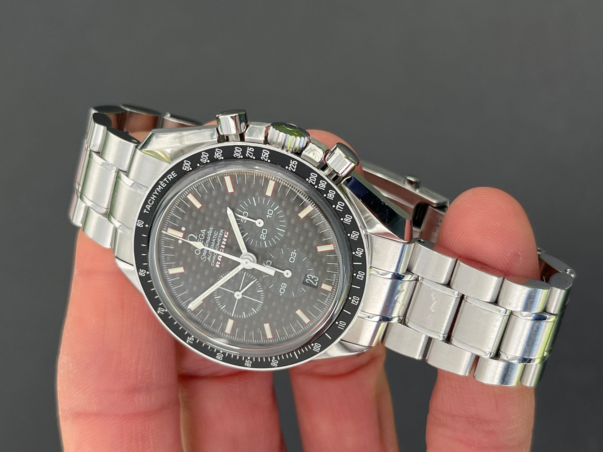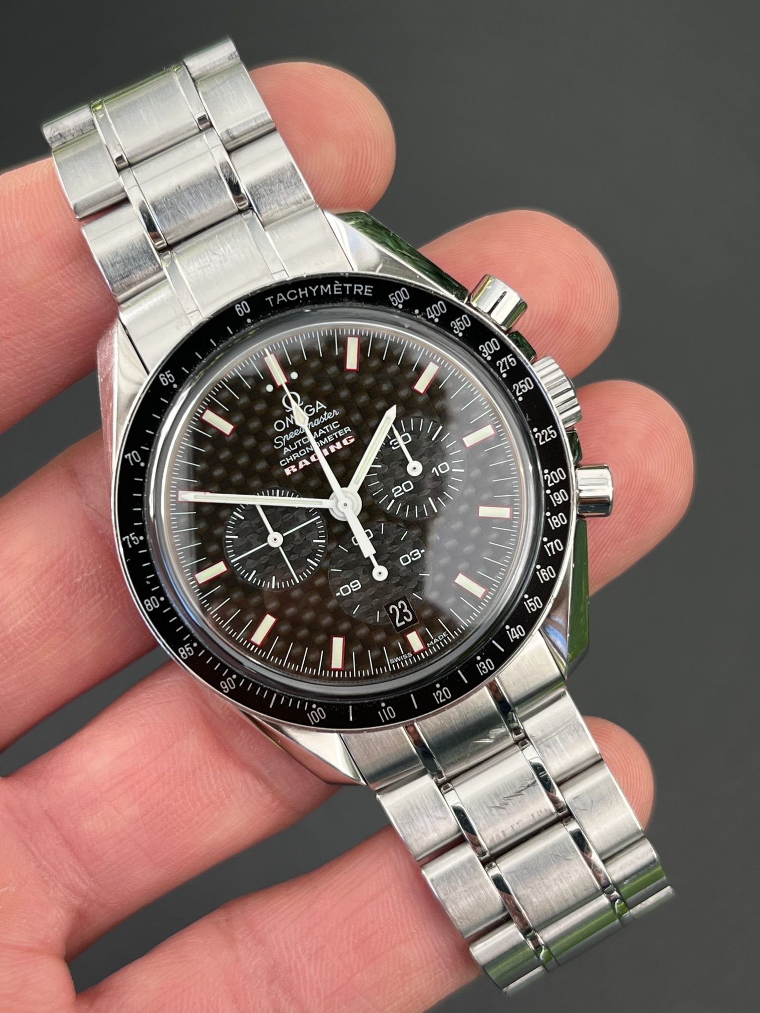 The Omega Speedmaster Racing Reference 3552.59 is a captivating and sporty variation of the iconic Speedmaster collection, designed to celebrate Omega's long-standing association with motorsport. This model features a striking black dial accented with bold red racing-inspired checkered minute markers and three sub-dials that enhance its dynamic aesthetic. The stainless steel 42mm case, paired with a matching bracelet, houses the Omega caliber 1861 manual-wind movement, known for its reliability and heritage. The design is a perfect balance of vintage charm and modern appeal, reflecting the brand's racing lineage. Offered with its original box and papers, this complete set is a remarkable addition for collectors and enthusiasts who appreciate Speedmaster's legacy and its sporty iterations.