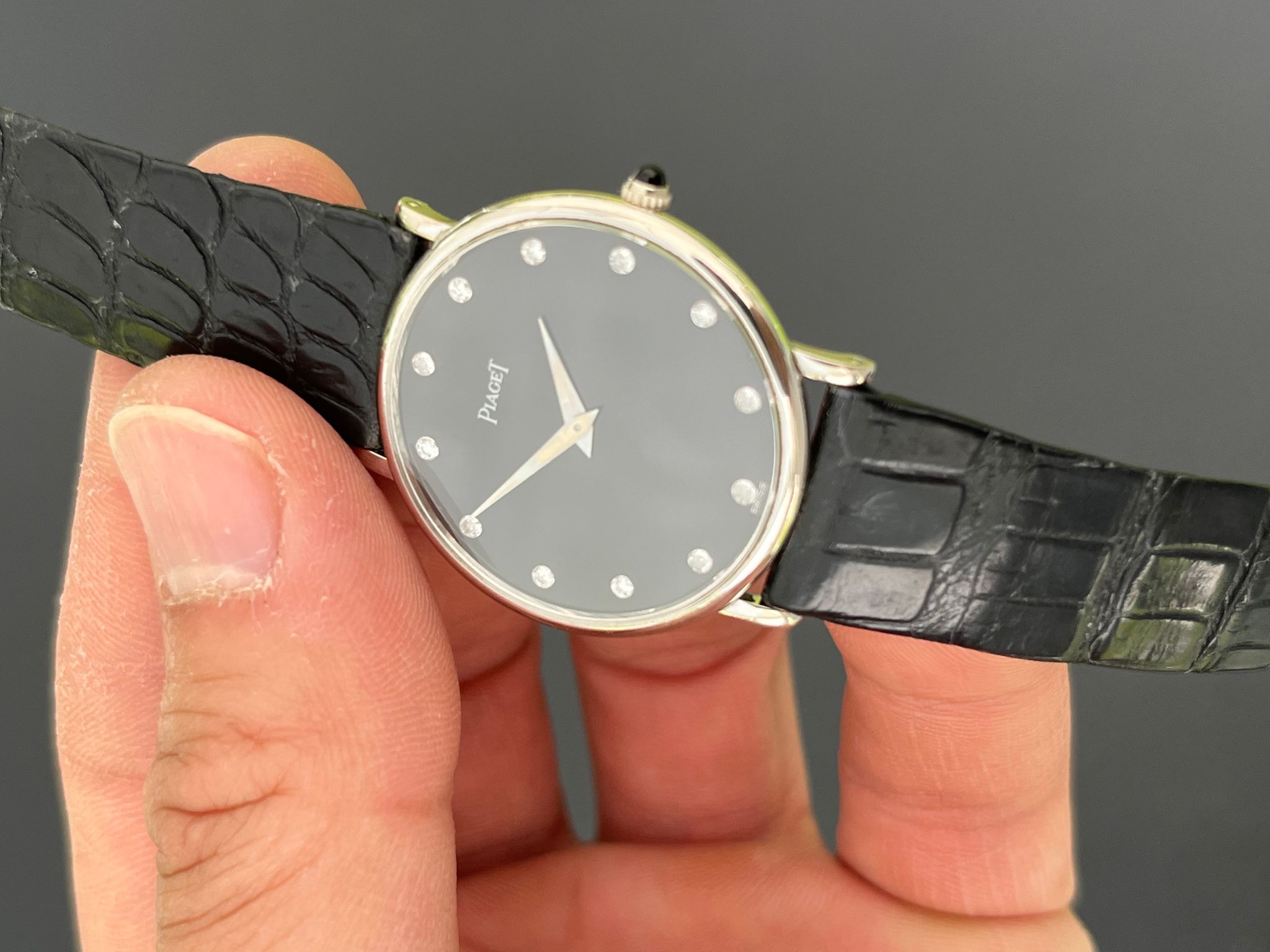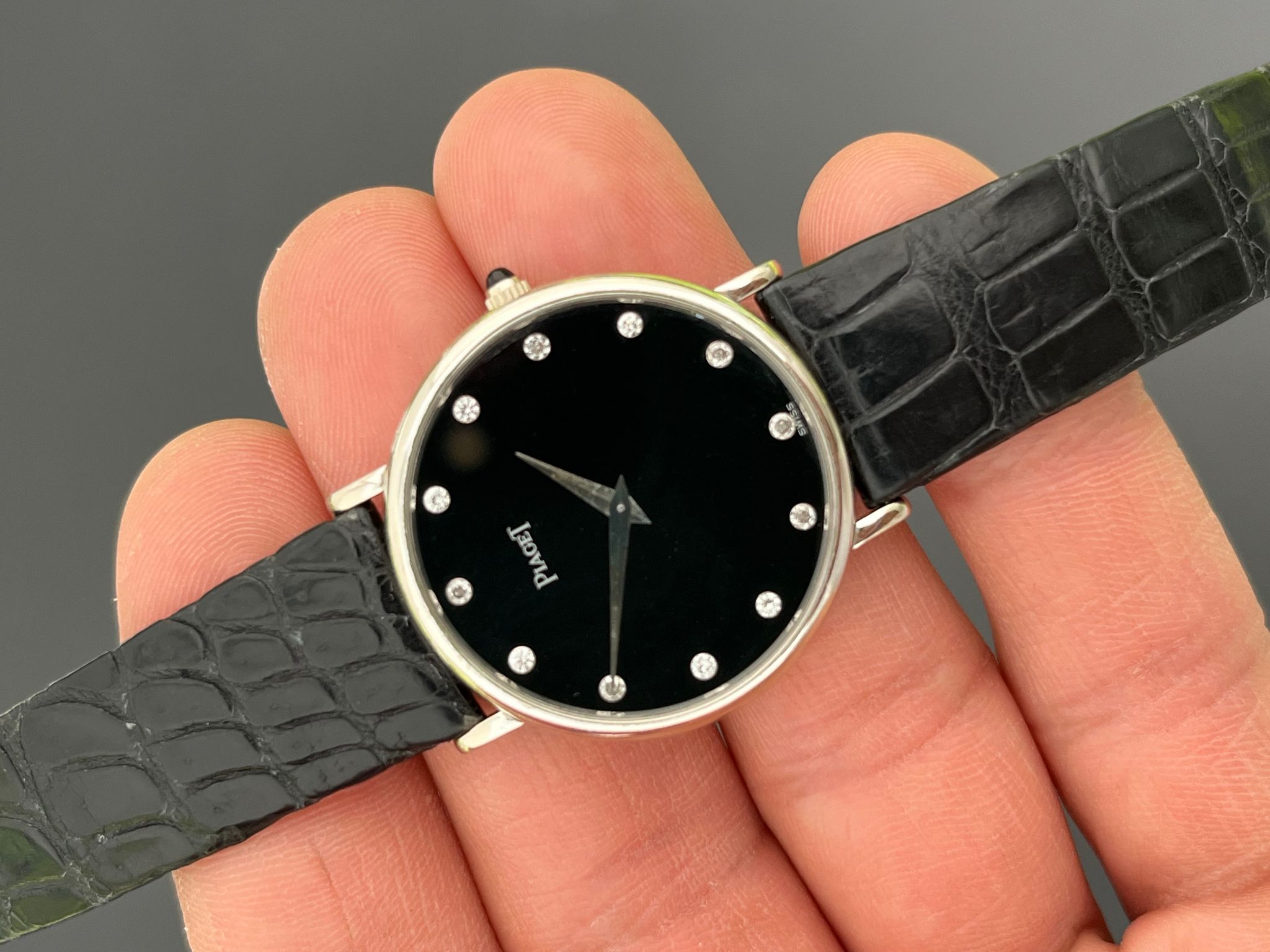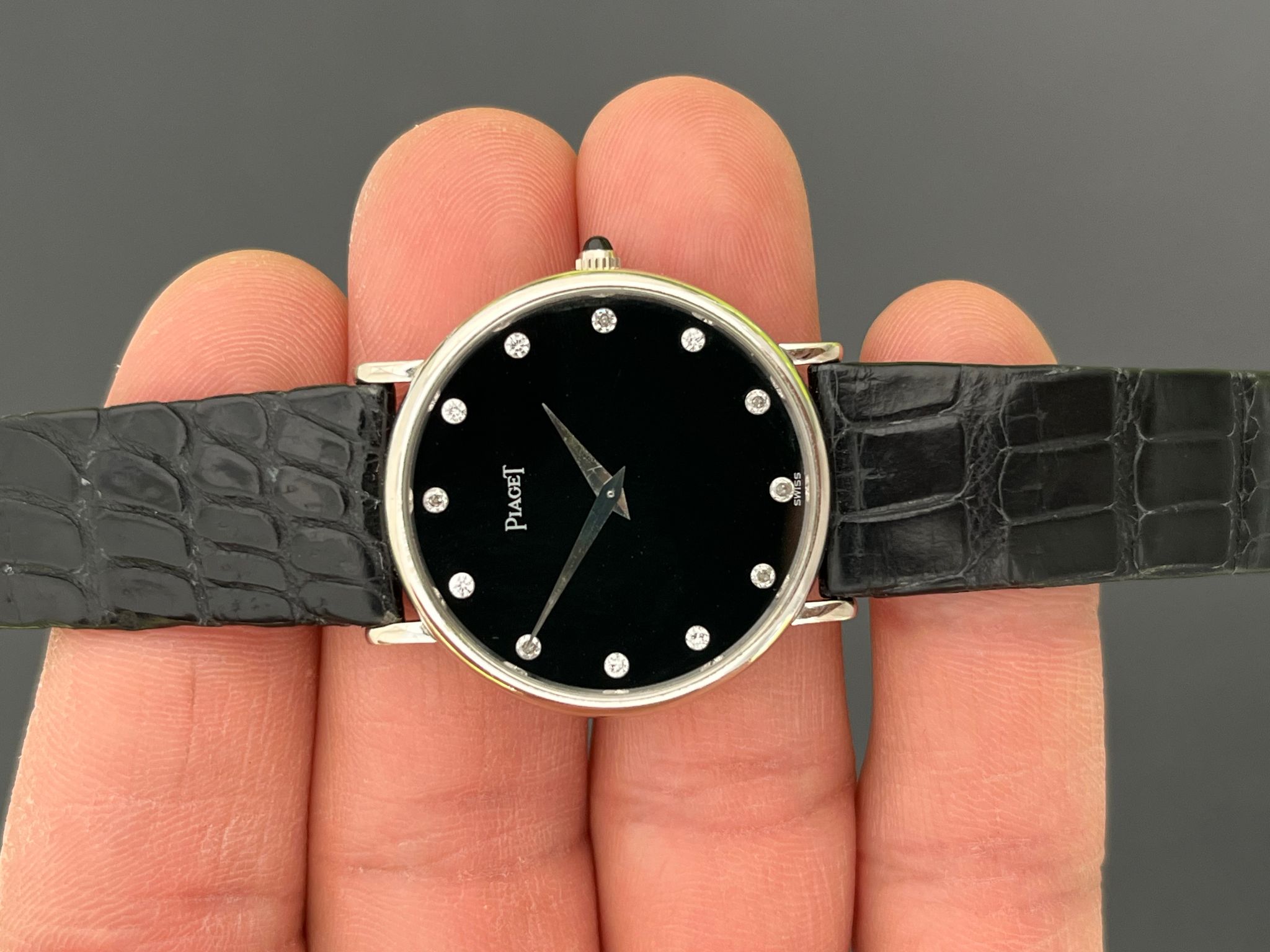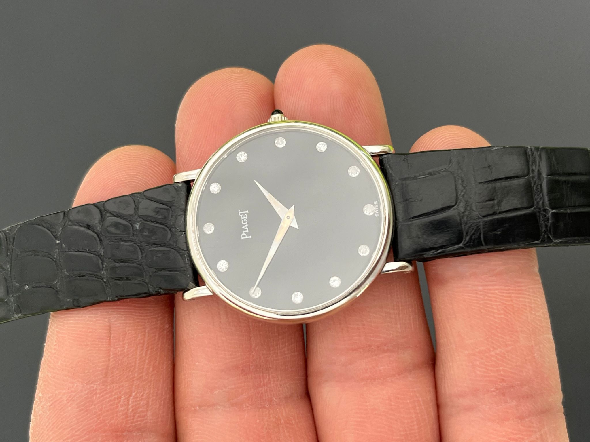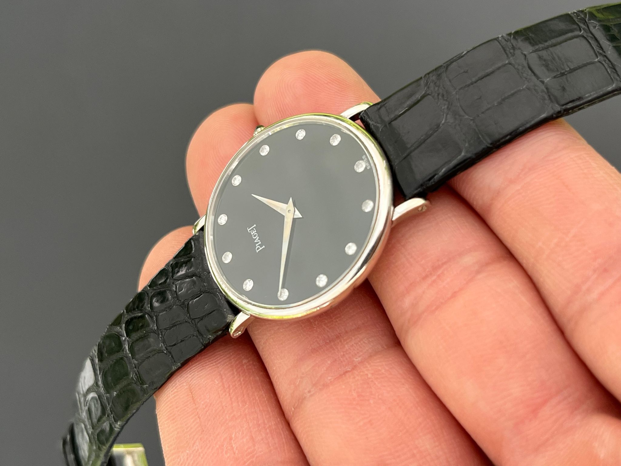 The minimalist black dial, adorned with factory diamonds and dagger hands, reflects the timeless aesthetic synonymous with Piaget's classic creations.